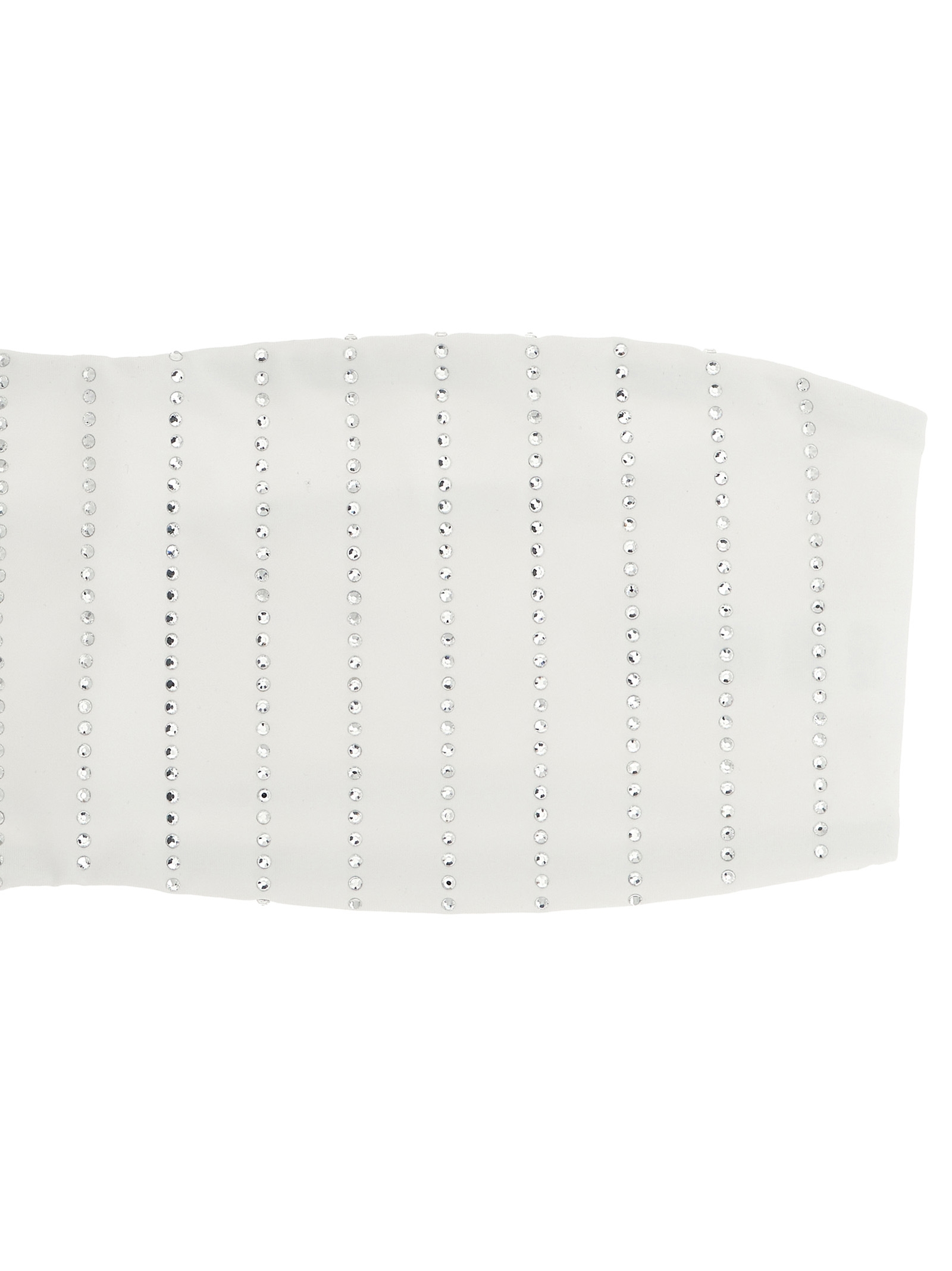 'Rebby' stretch fabric bikini top with front rhinestone appliqué, band style with side slats.