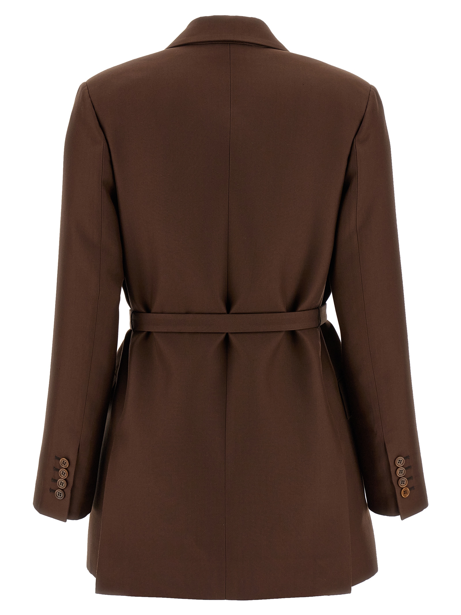 'Prisca' double-breasted dressing gown blazer jacket with peak lapels, chest pocket, flap pockets, structured shoulder strap, long sleeves, back vents, cupro lining, removable belt.