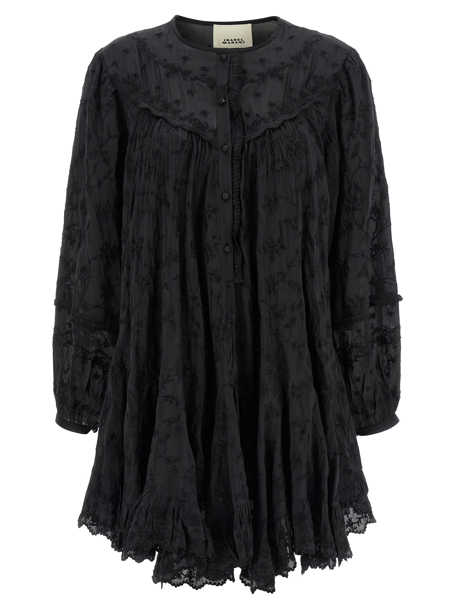'Zame' cotton and silk mini dress with all-over tone-on-tone floral embroidery and ruffles, flared silhouette, round neckline, front button closure, long wide sleeves with cuffs, asymmetrical hem with flounce.
