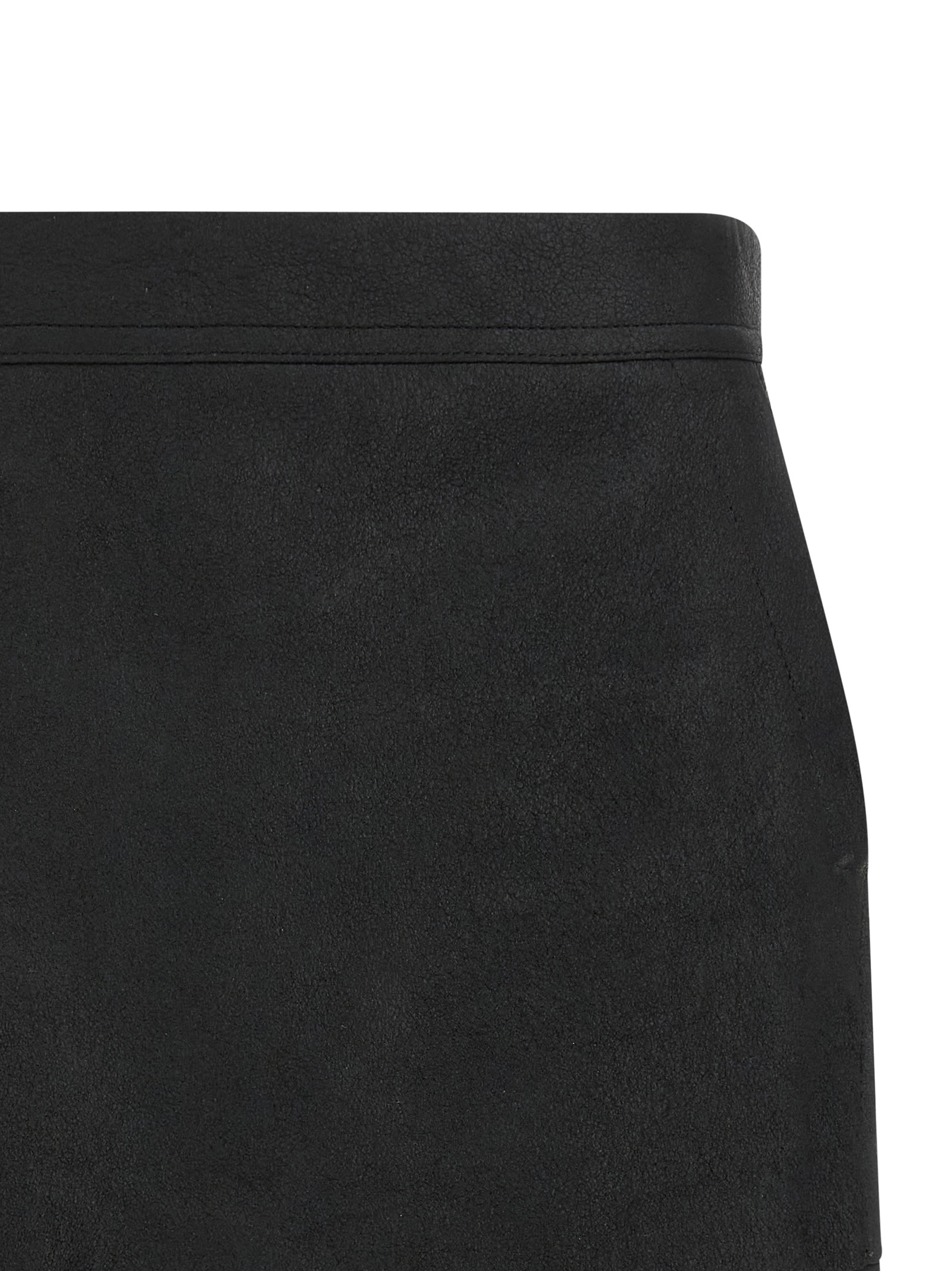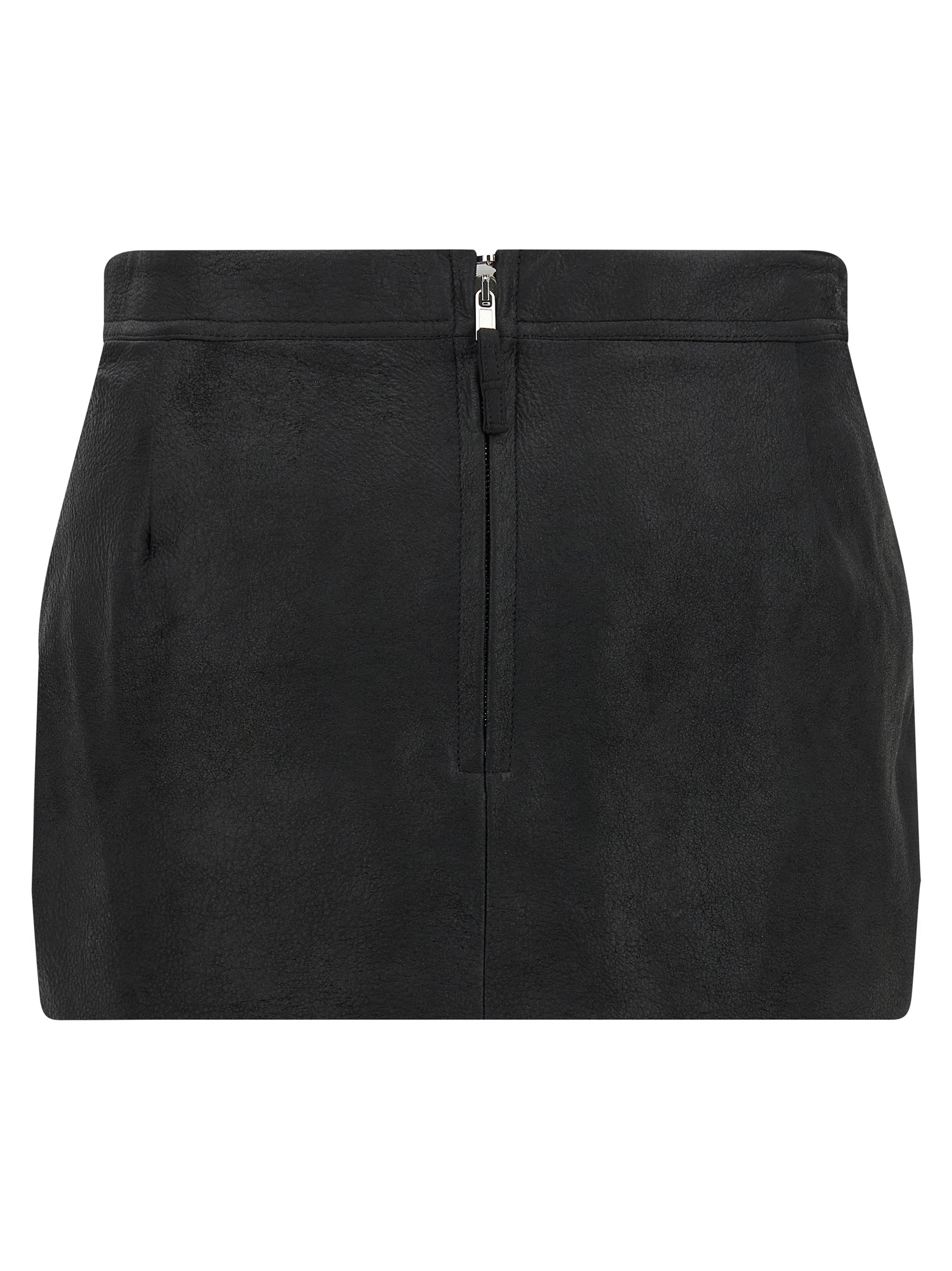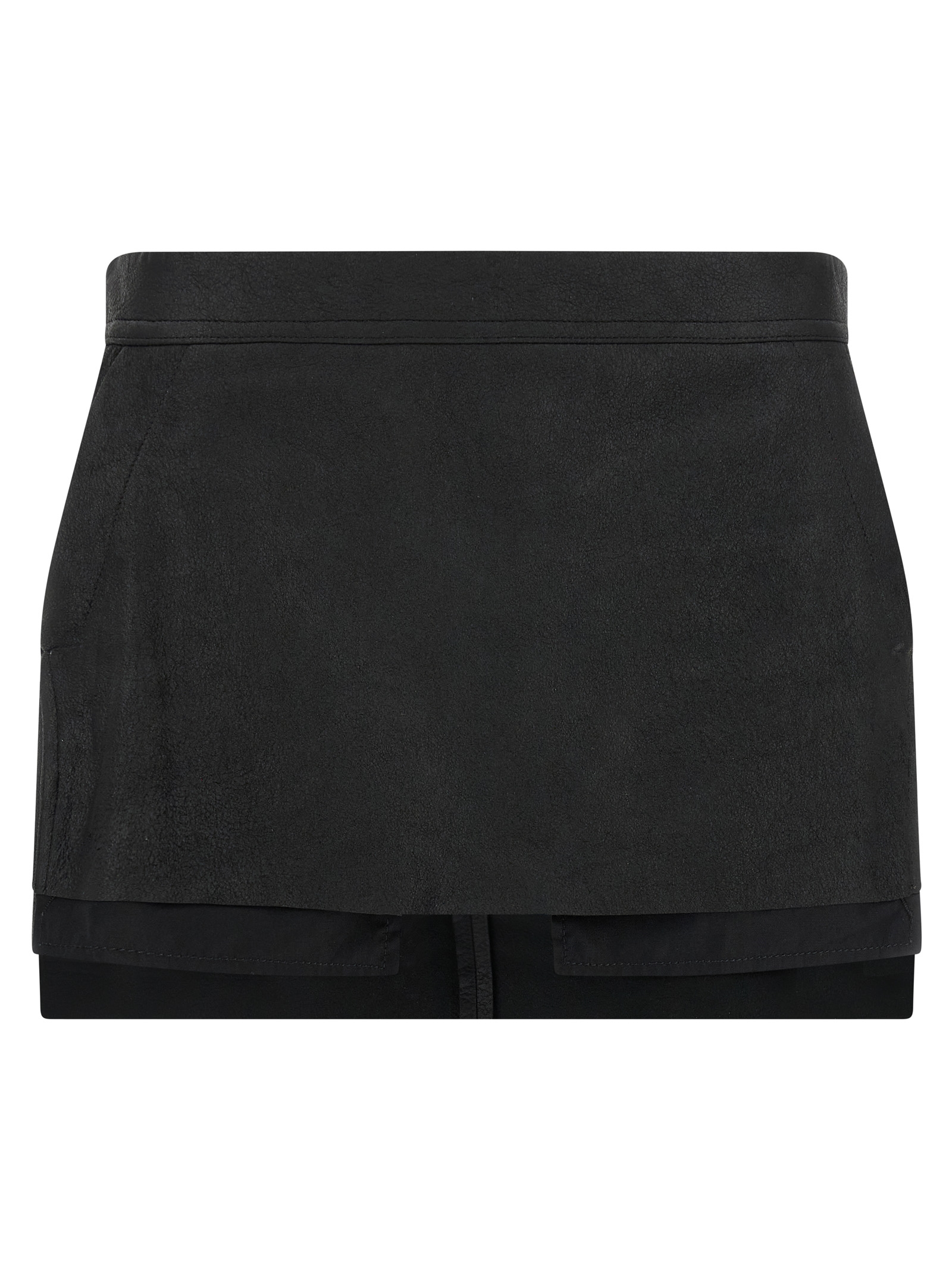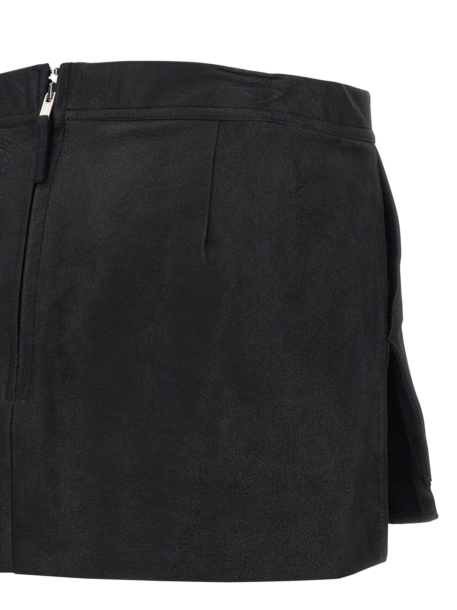 'Fog Cutoff' mini skirt in leather, asymmetrical, with side pockets and back zip closure.