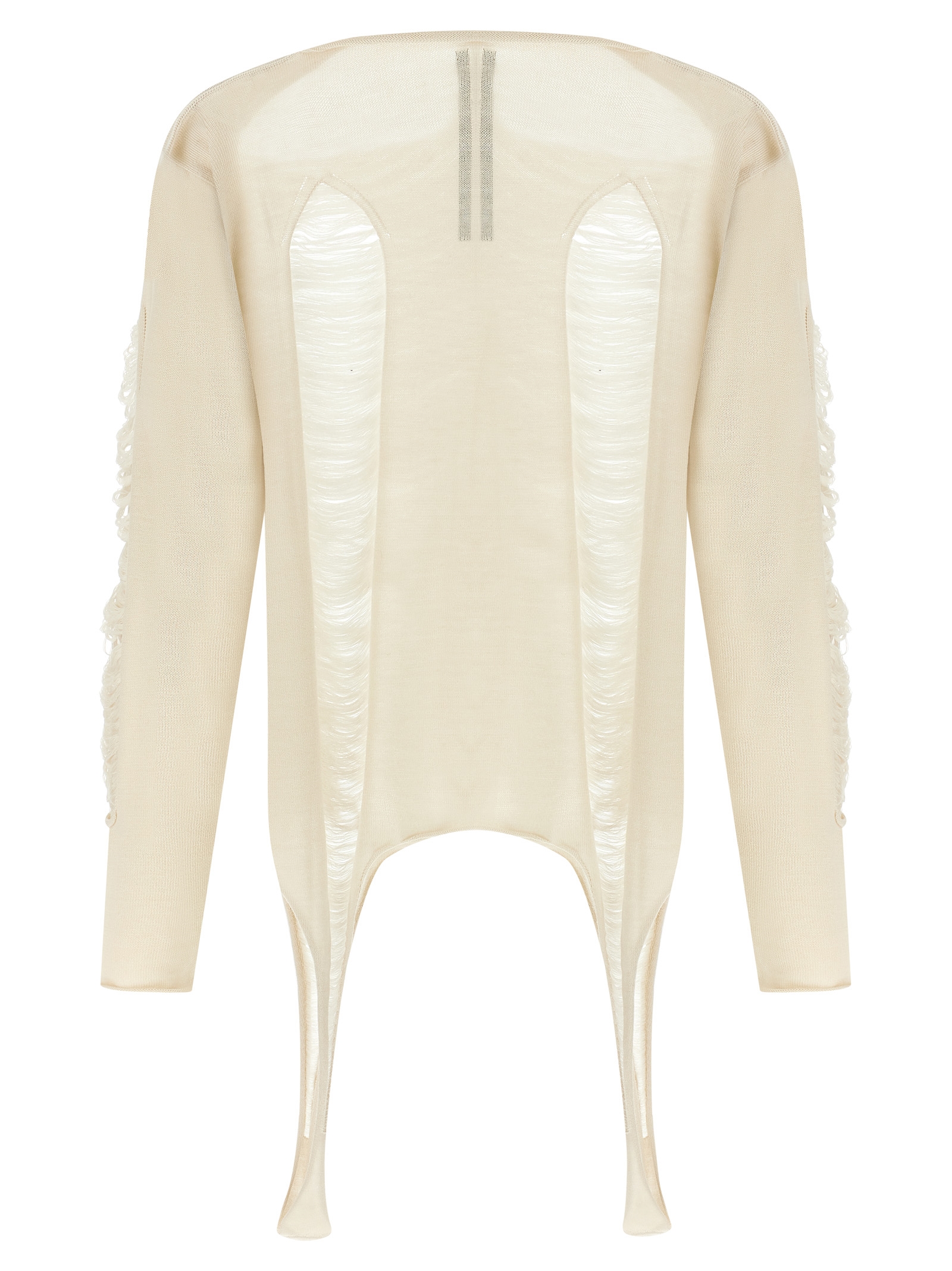 'LS Top' wool sweater with fraying and cut-out details on the front and back, boat neck, long sleeves, raw cut hem.