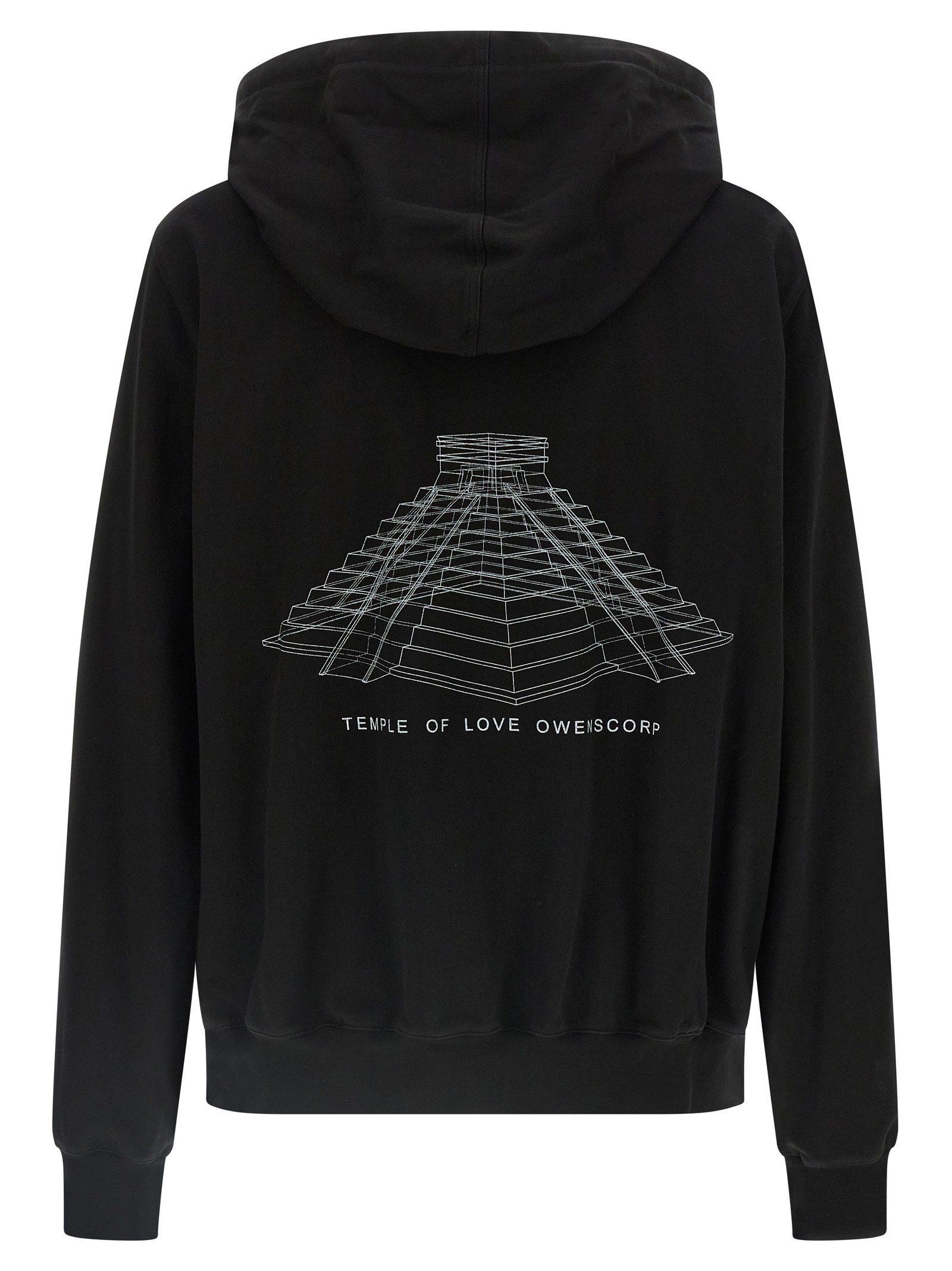 Heavy cotton jersey hoodie with Temple of Love Owenscorp Temp print on the back, long sleeves with cuffs and dropped shoulders, and headband. SUSTAINABLE: This garment is made with GOTS certified cotton. The Global Organic Textile Standard (GOTS) is a voluntary standard obtained through independent third-party verification.