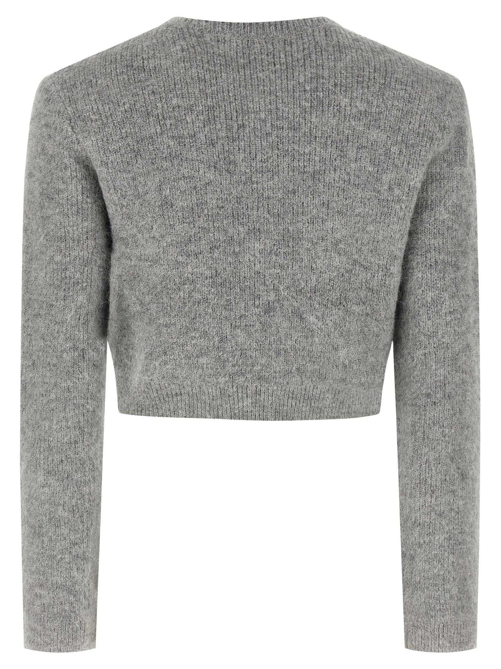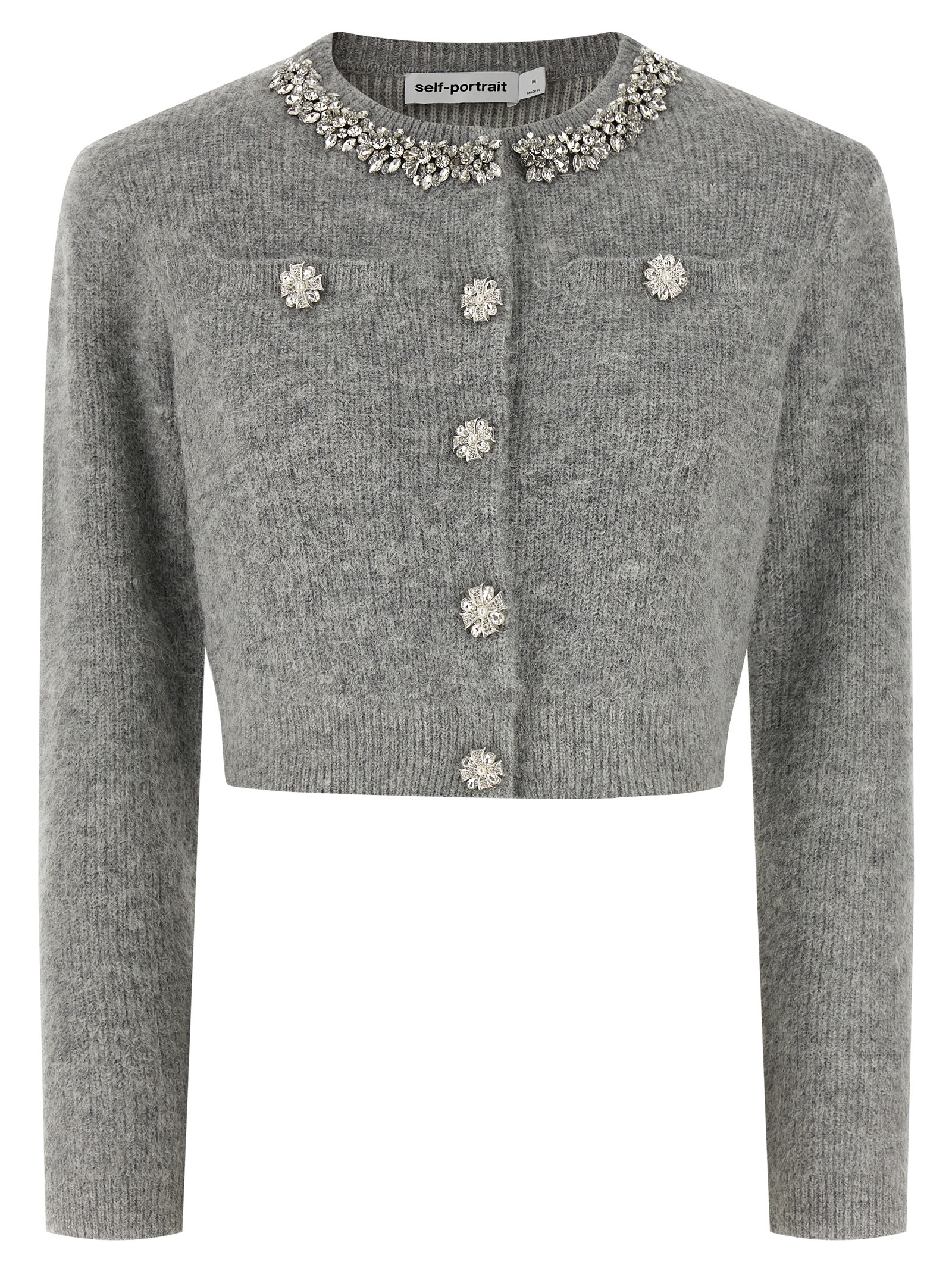 'Grey Fluffy Crystal Trim' cardigan in alpaca and wool blend with fluffy effect lamé threads, crew neck with crystal application, front snap button closure with trompe l'oeil jewel button application, pockets, removable padded shoulder, long cuffed sleeves.