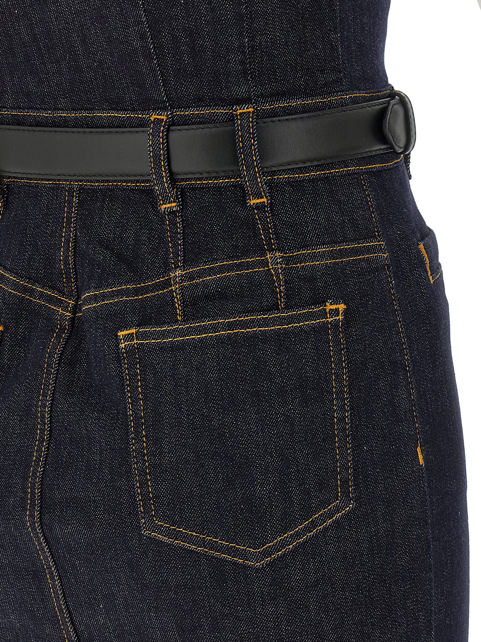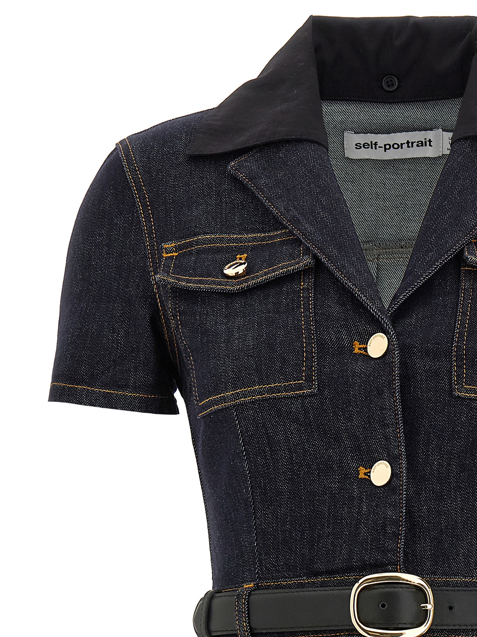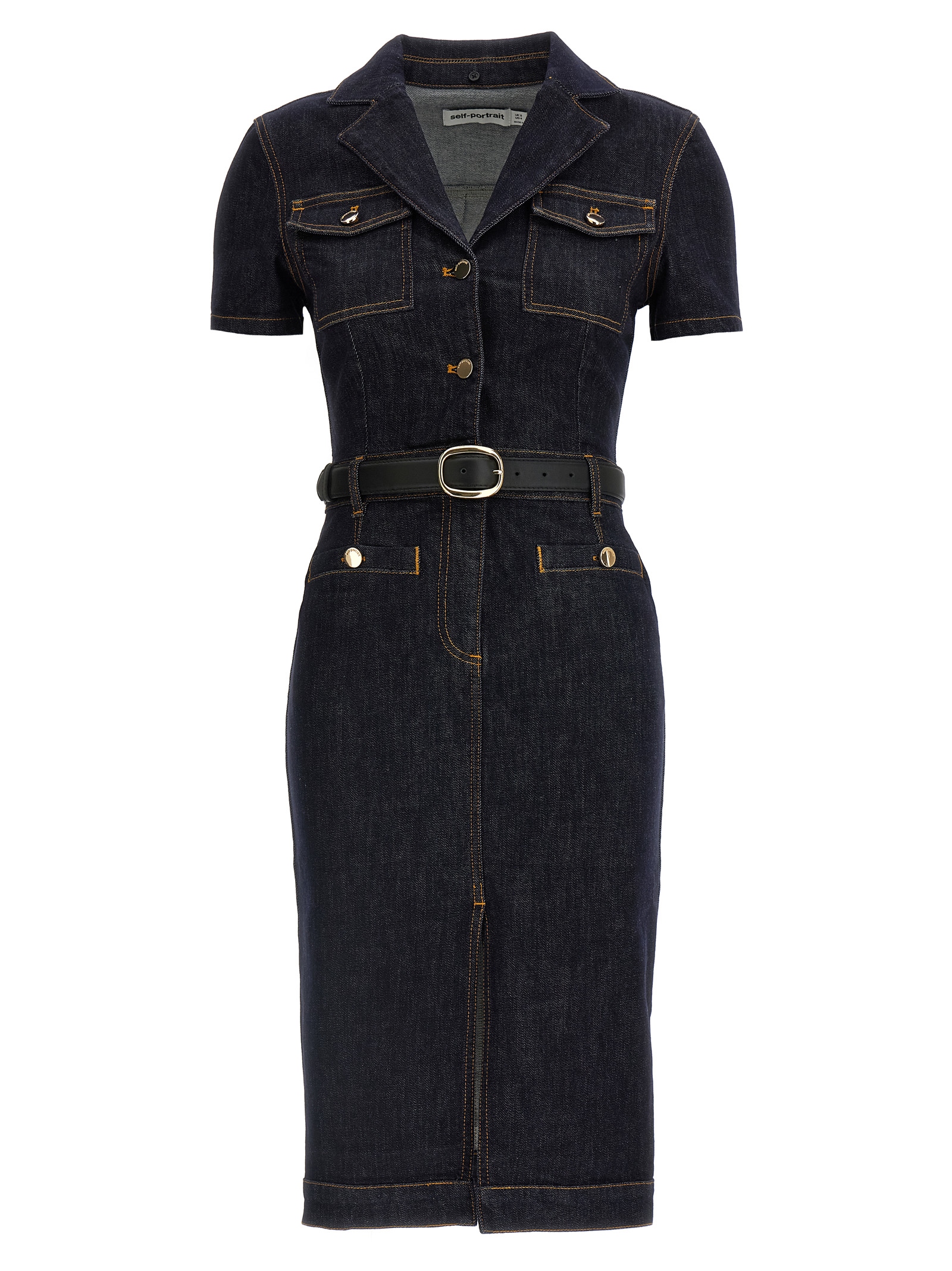 Streetwise 'Indigo Denim Midi' cotton denim dress with contrast stitching, shirier style, collar with removable contrast cotton insert, V-neck, front metal button closure, pockets, zip flap, short sleeves, front split, unlined, removable leather belt.