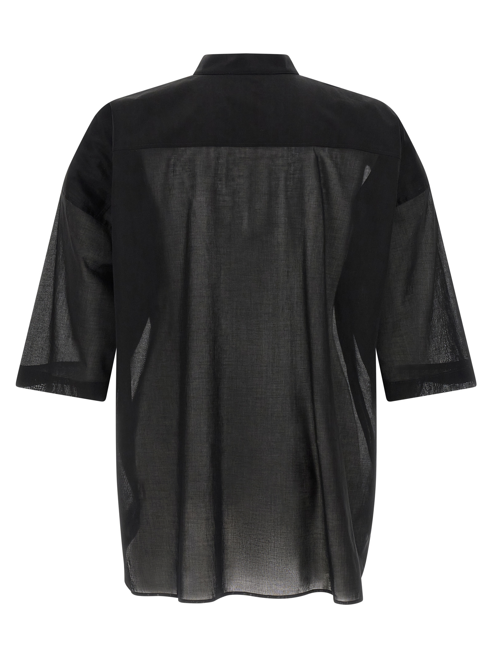 'Jumbo Faun' semi-transparent cotton voile shirt, high neck, front snap button closure, wide short sleeves with dropped shoulders.