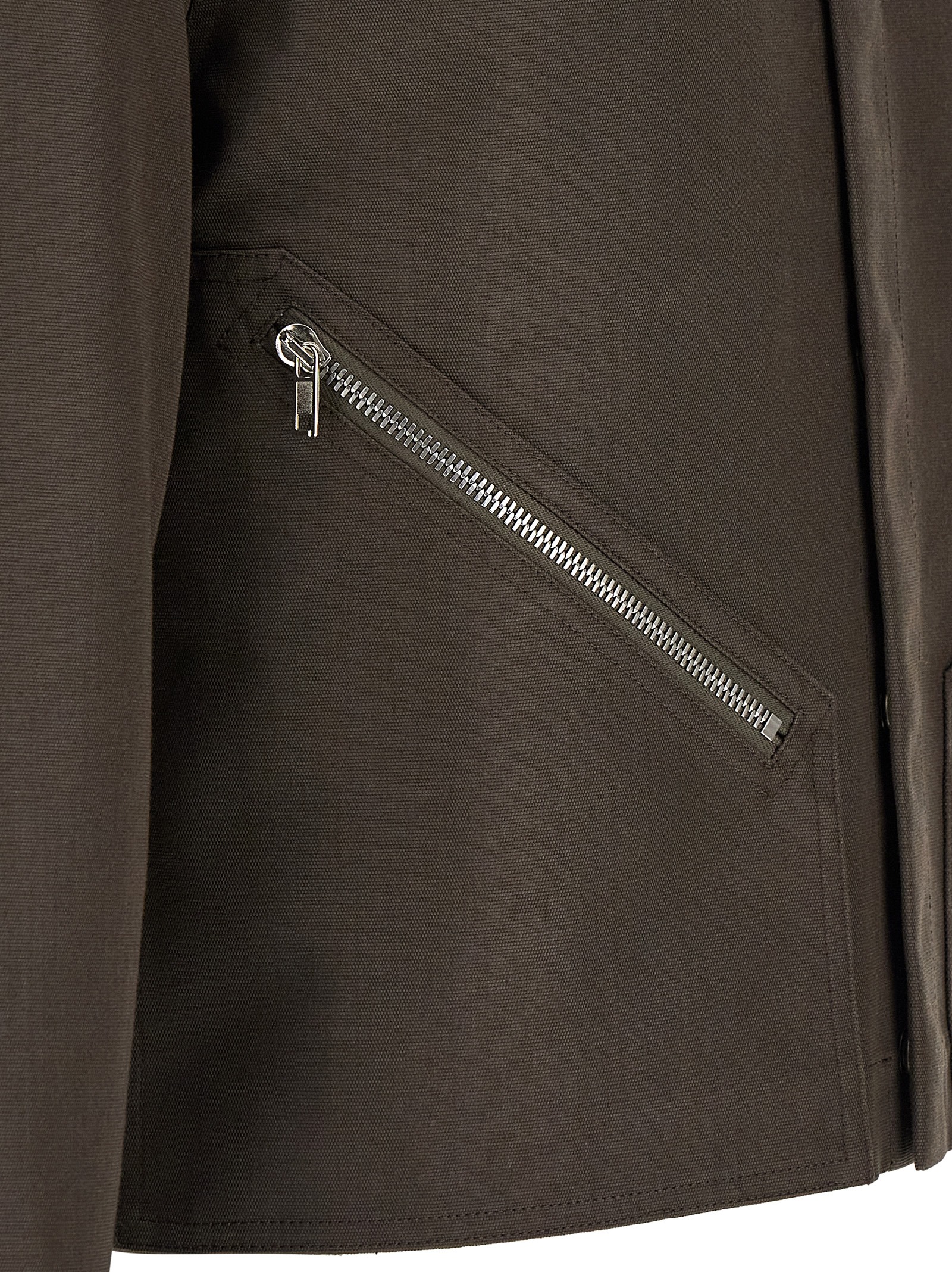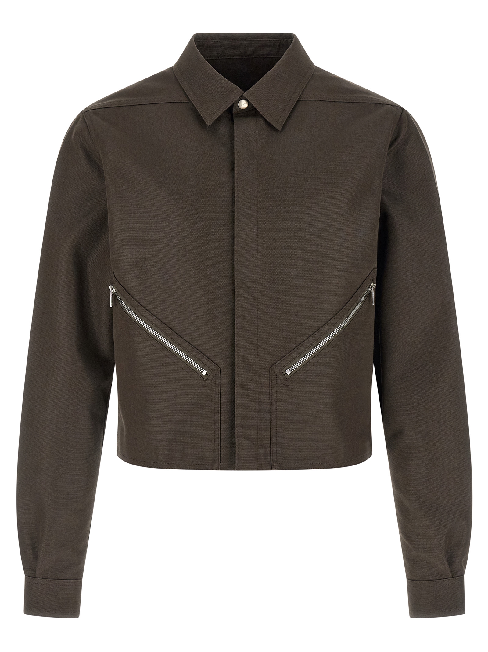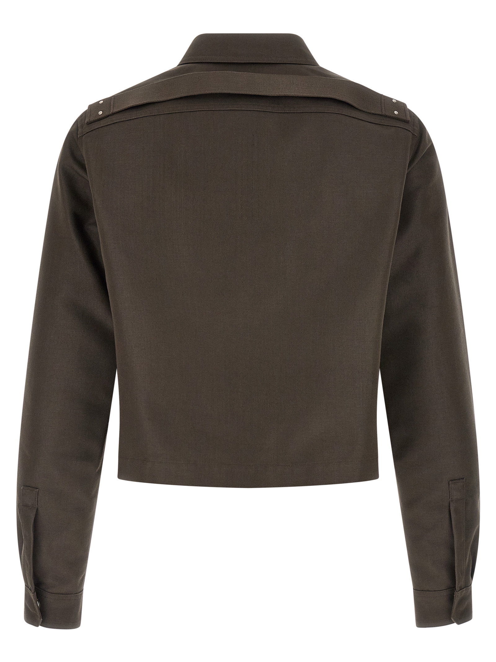 'Tour Alice' rigid cotton blend shirt with crop style, front snap button closure, pockets, long cuffed sleeves, tone-on-tone cotton webbing detail at the back.