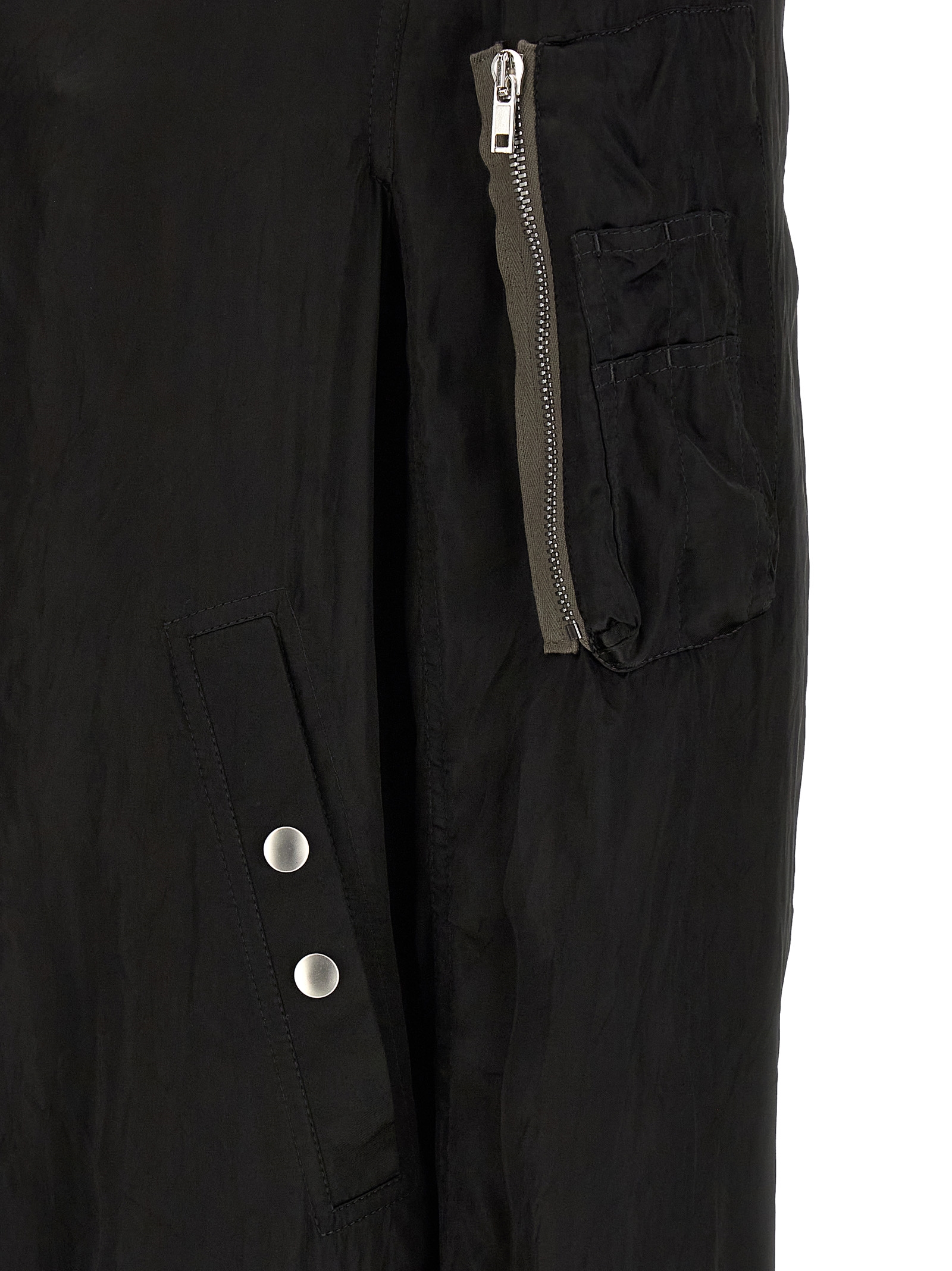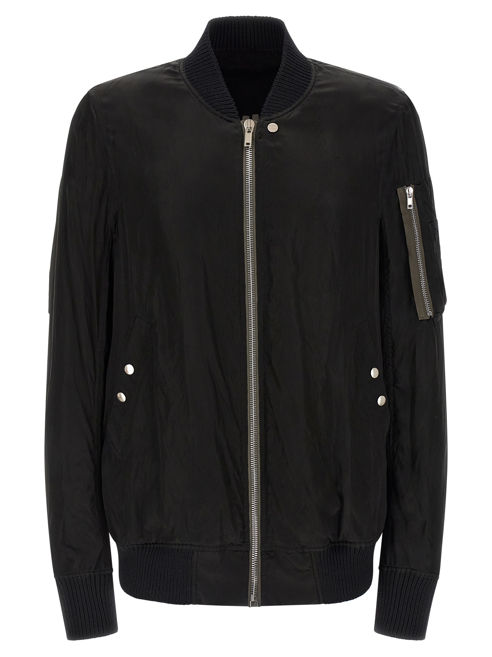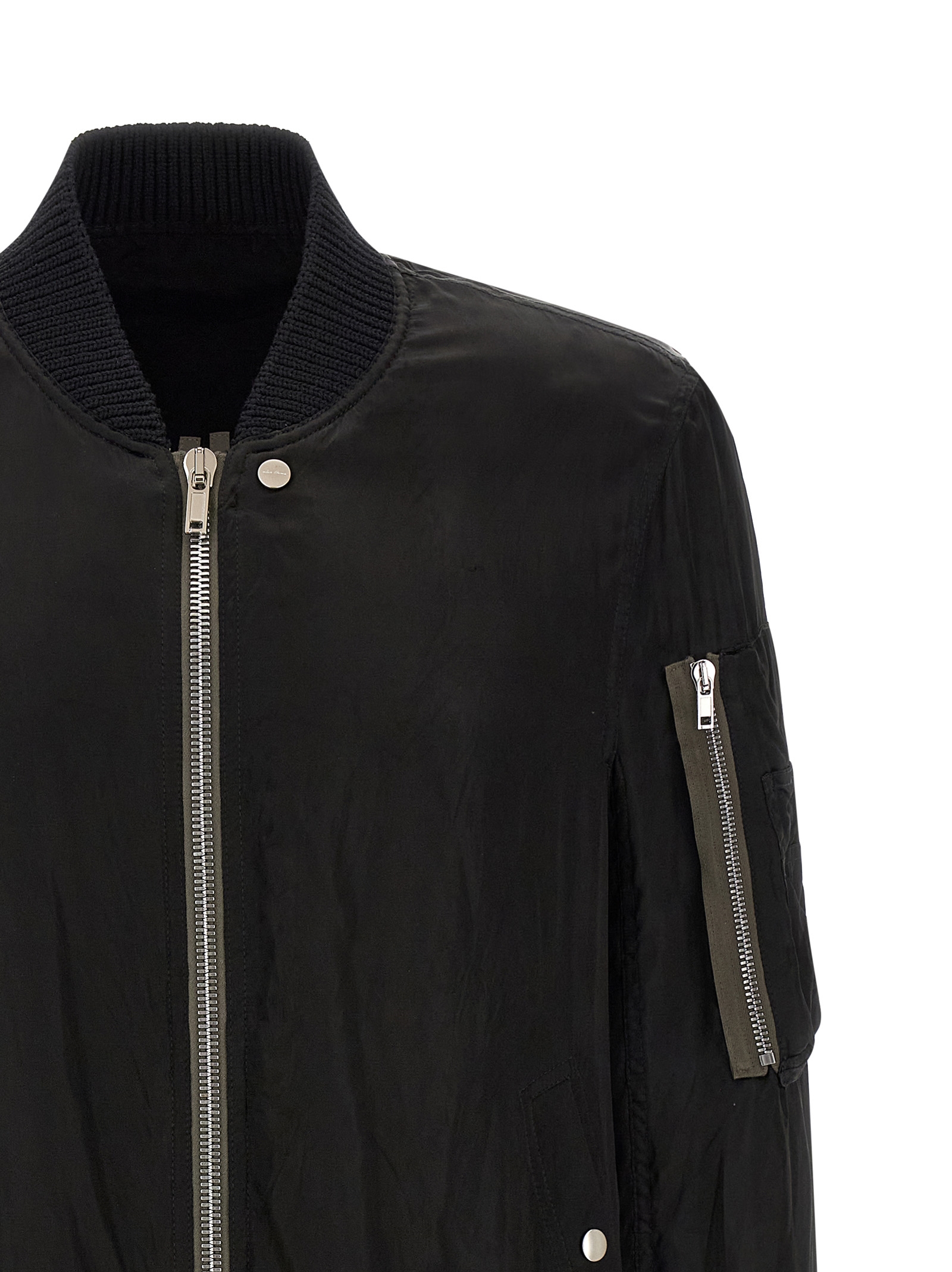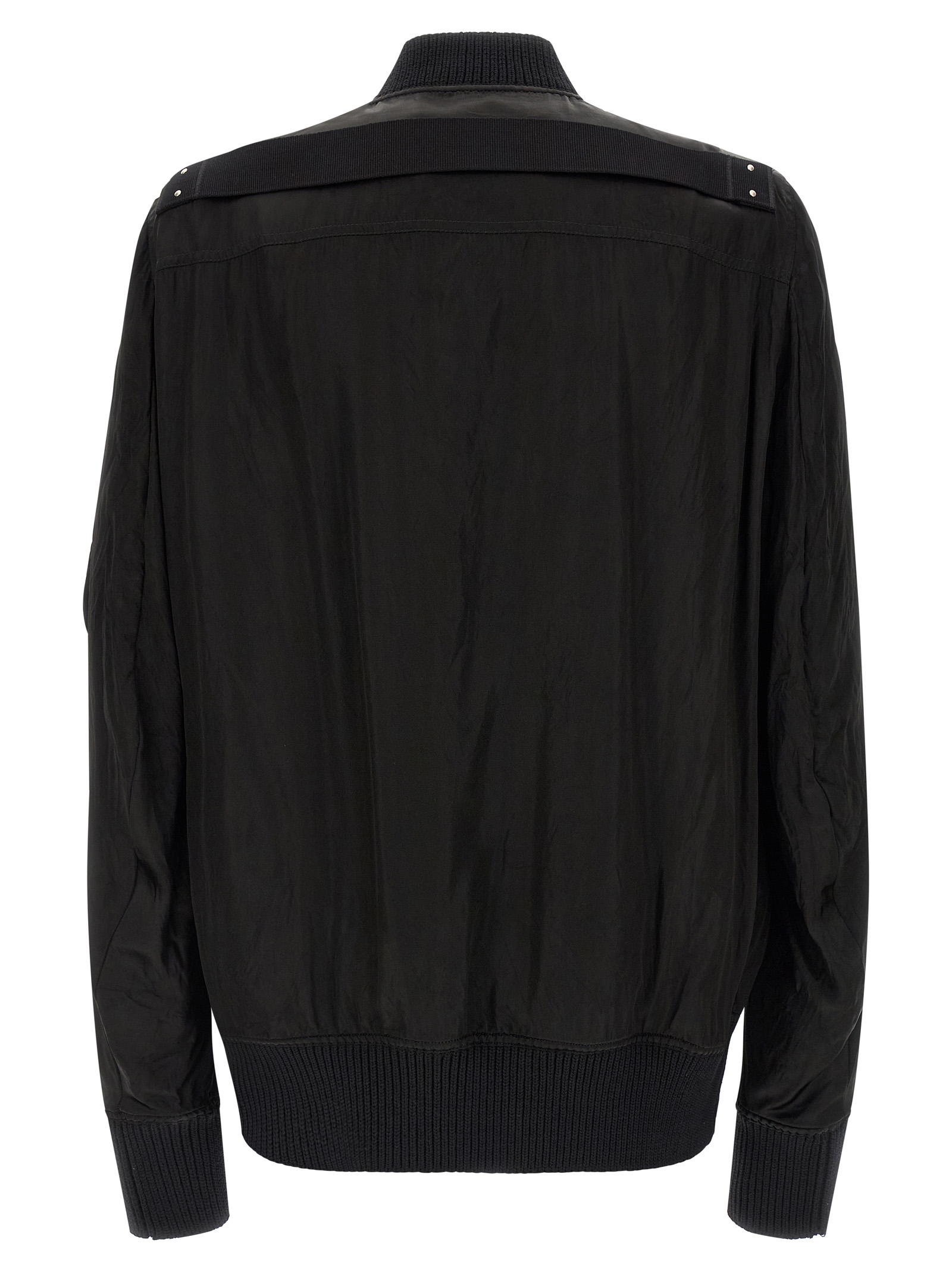 'Classic Flight' bomber jacket in slightly padded shiny nylon with ribbed knit details, front zip closure, pockets, long cuffed sleeves, and headband.