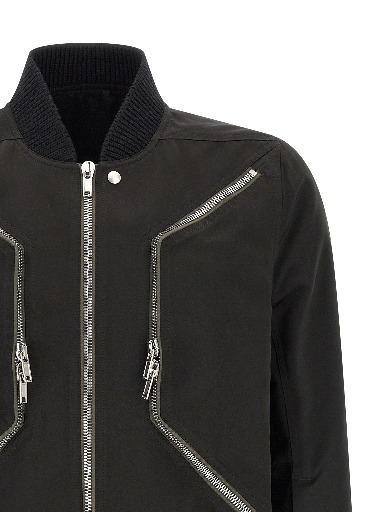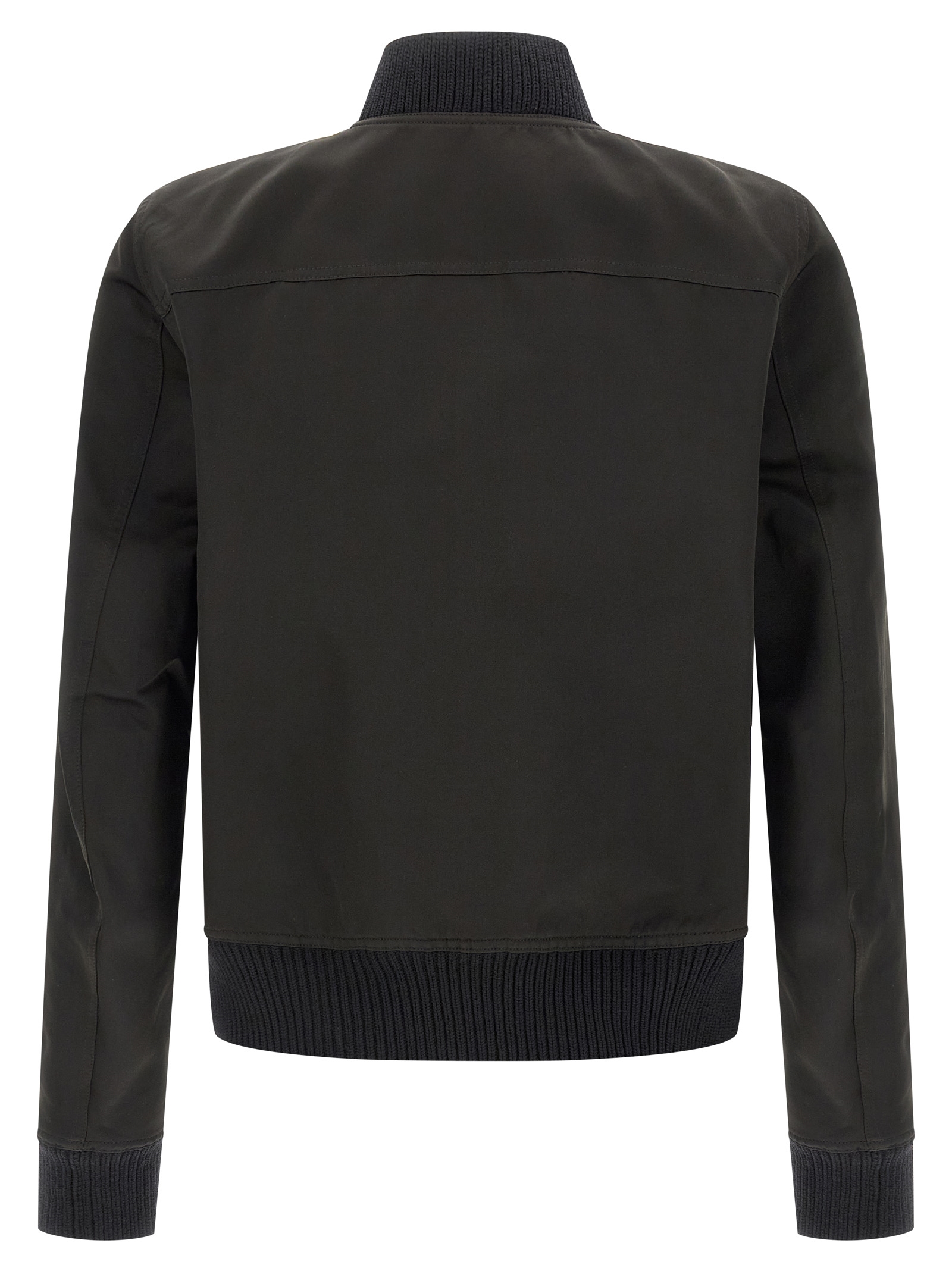 Heizer Flight' shiny cotton bomber jacket with ribbed wool knit details, high neck, front zip closure, pockets, long cuffed sleeves, and headband.