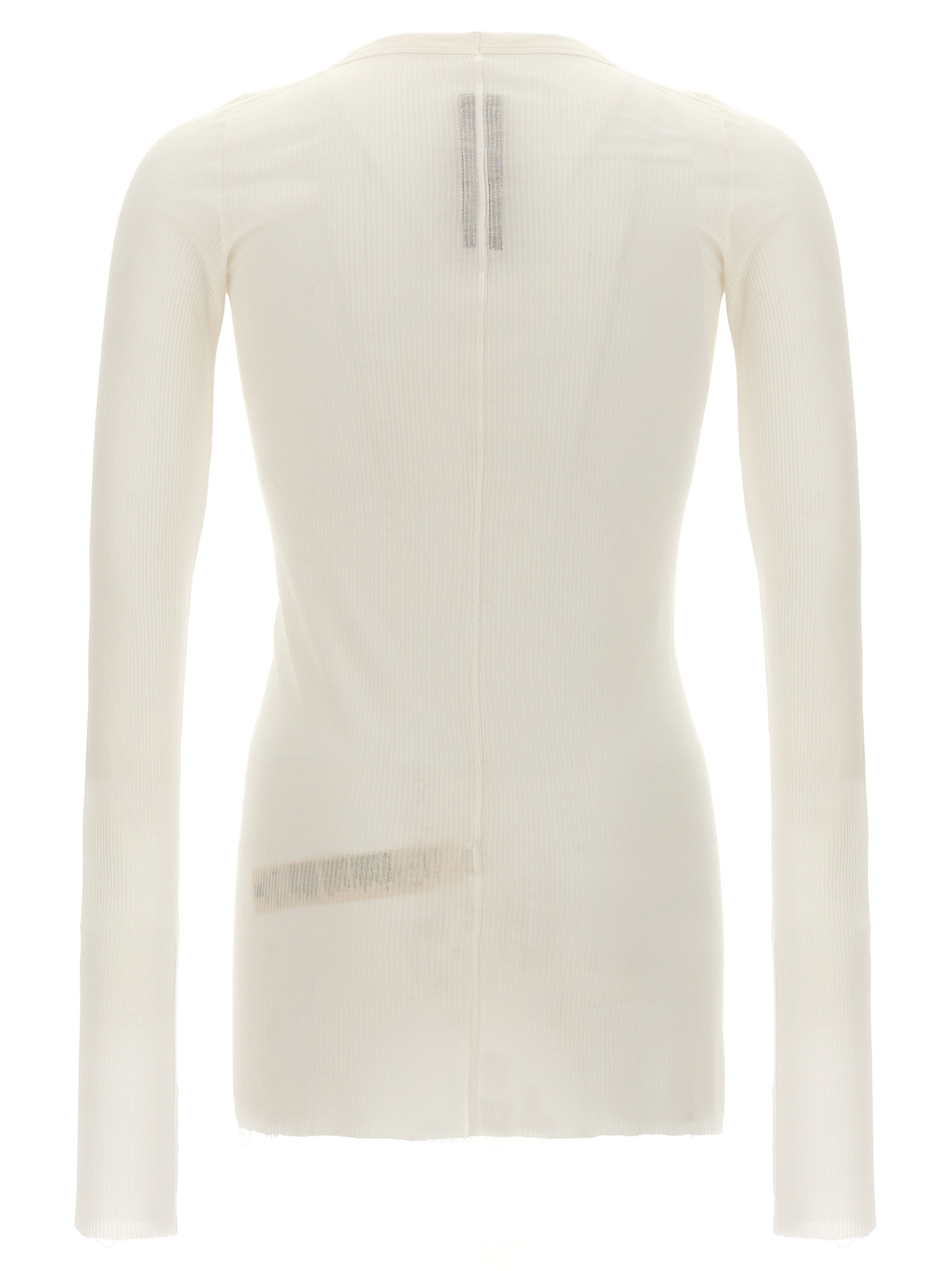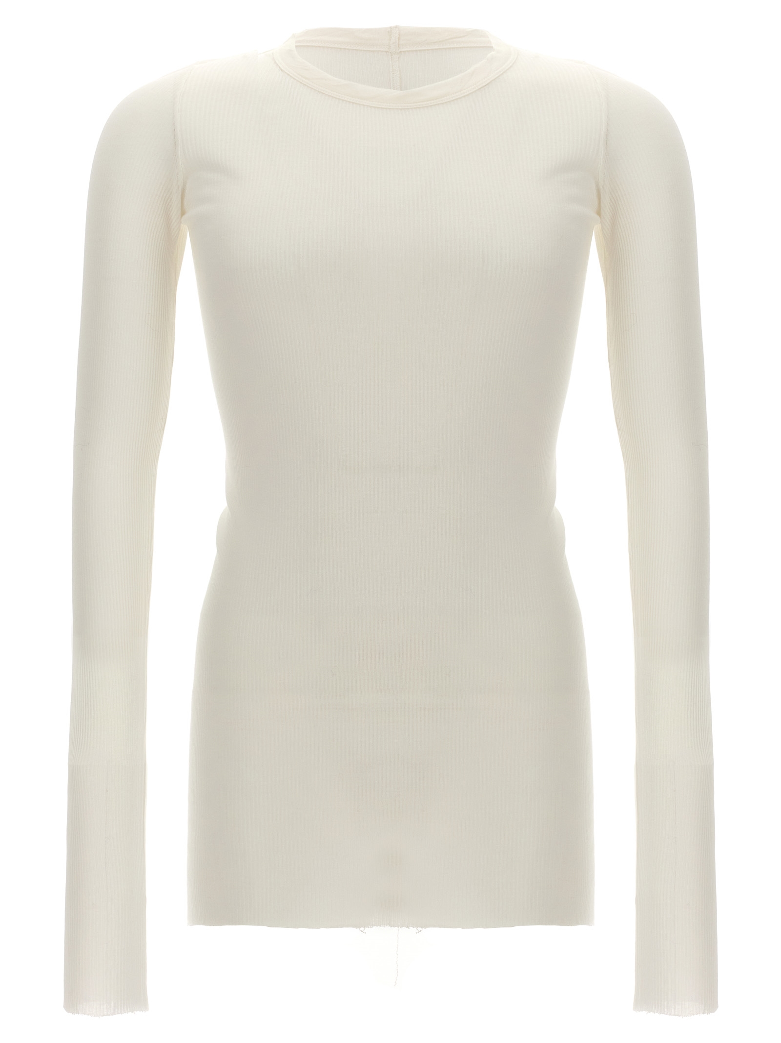'Rib LS T' ribbed viscose and stretch silk blend t-shirt, raw cut hem, crew neck, long sleeves.