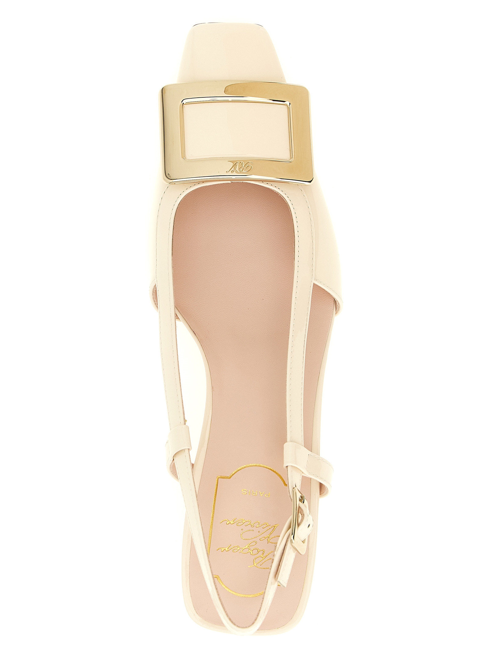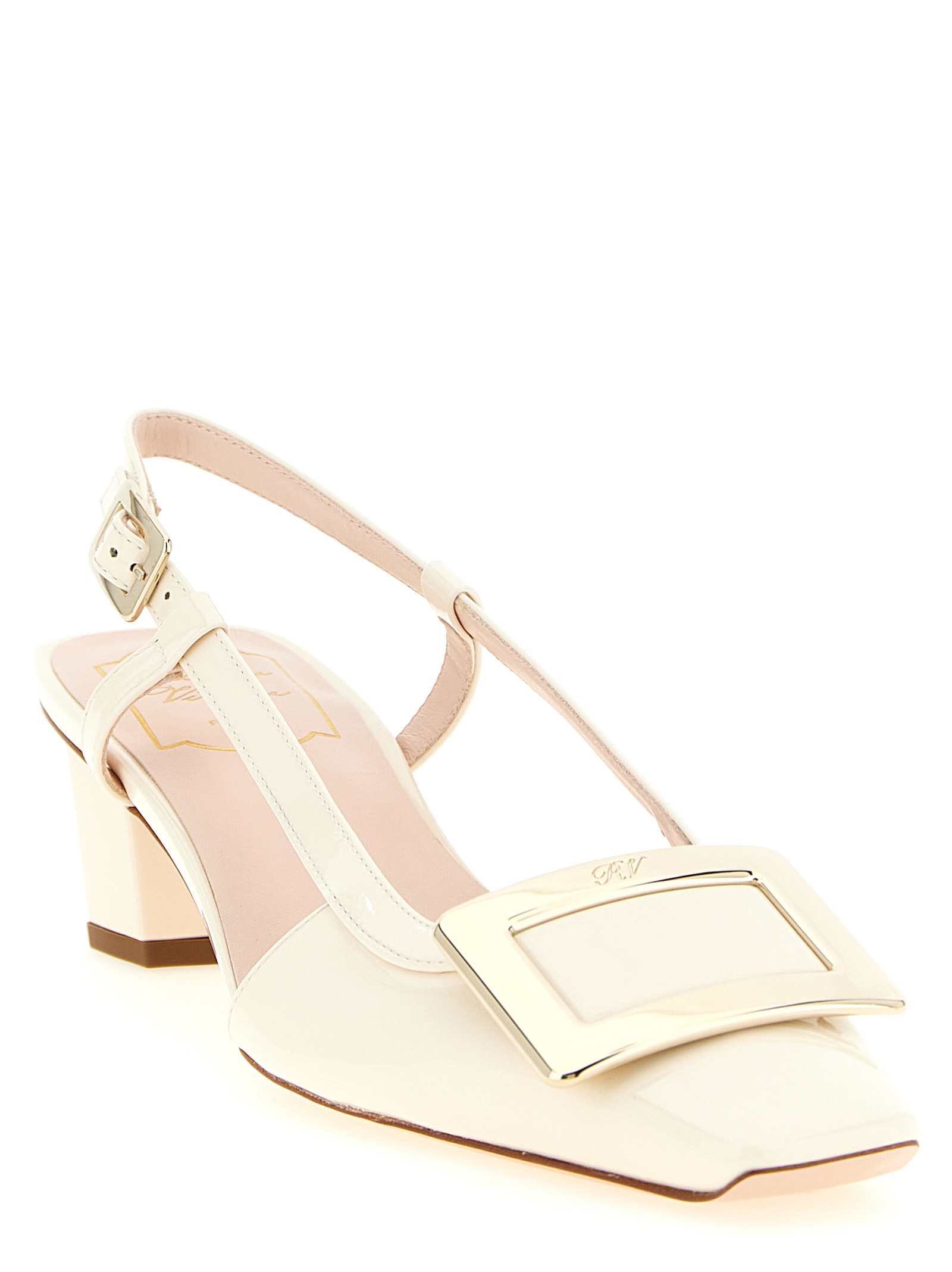 'Belle Viver' patent leather slingbacks, square toe with metal buckle with front engraved logo, adjustable strap, Skyscraper heel, leather sole.