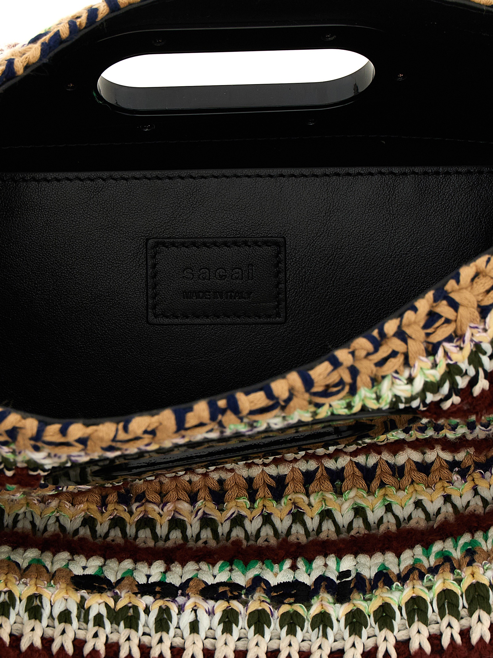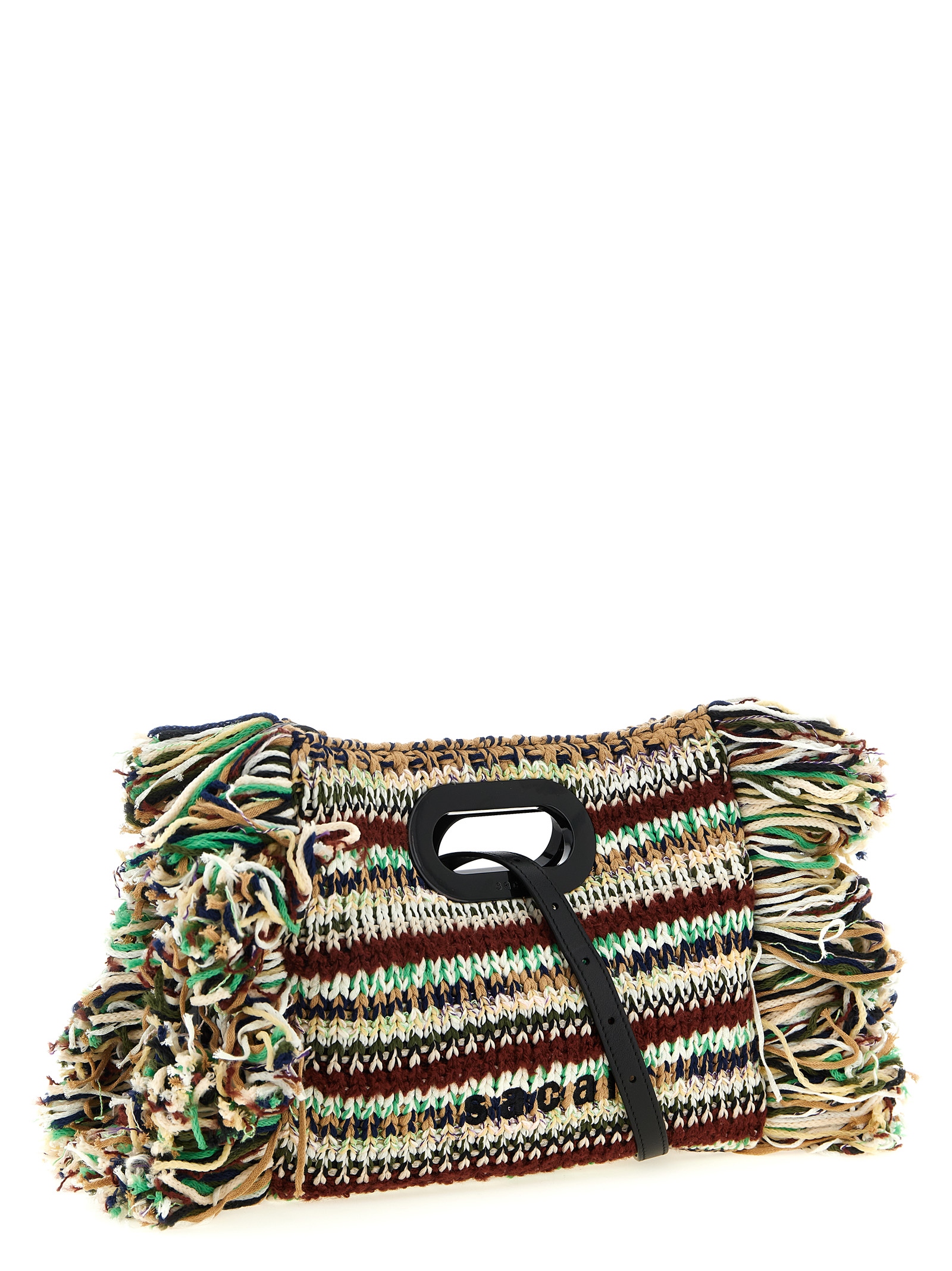 Small knit cotton knit shopping bag with fringes on the sides, logo embroidery on the front and back, fixed oval enameled metal handles, rigid base with metal feet, adjustable and removable leather shoulder strap.
