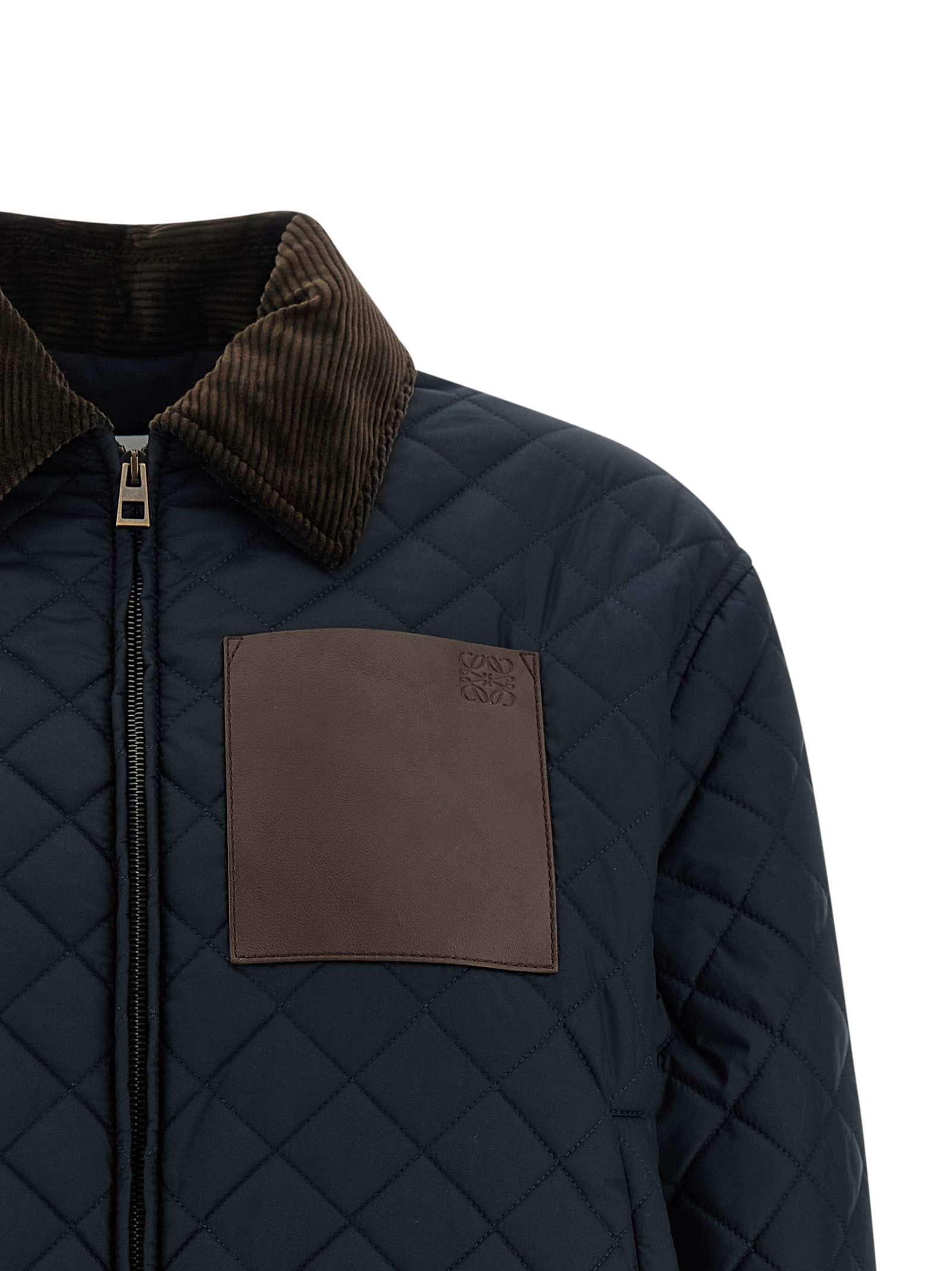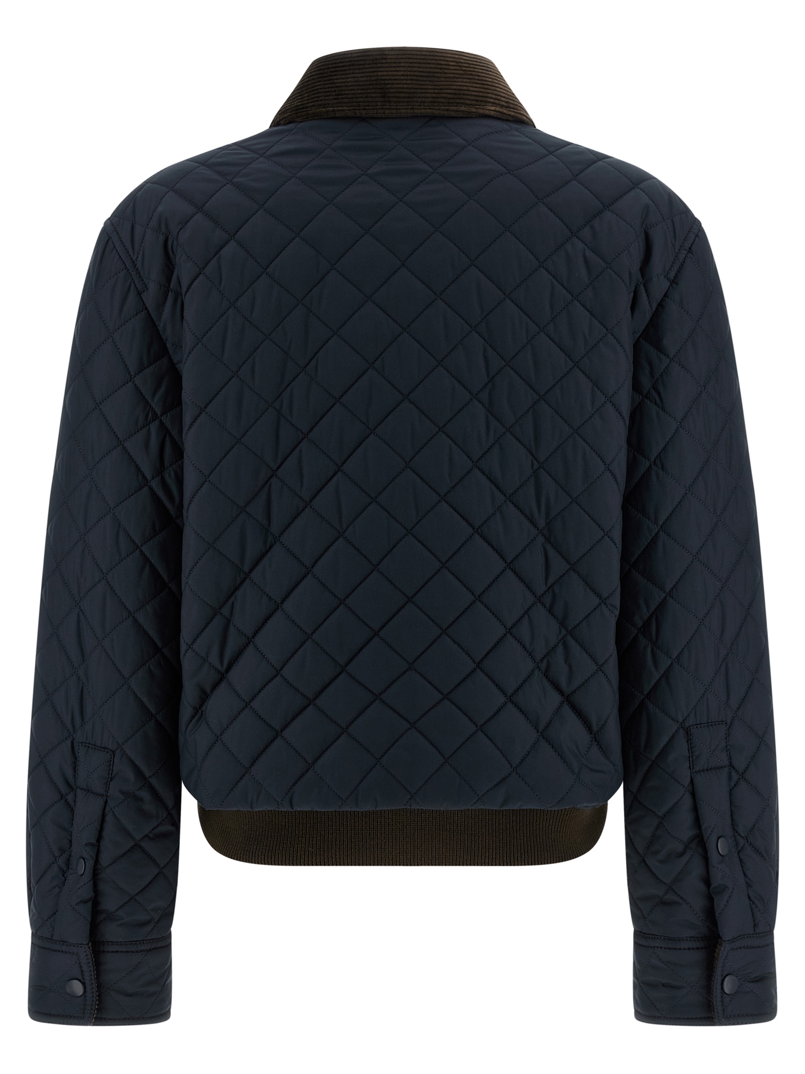 Lightweight tech fabric jacket with all-over diamond quilting, contrast corduroy collar and inner cuffs, slightly cropped style, contrast leather pocket with embossed 'Anagram' pattern, front zip closure, pockets, long sleeves with cuffs and dropped shoulder, double layer hem with contrasting ribbed stretch knit insert.