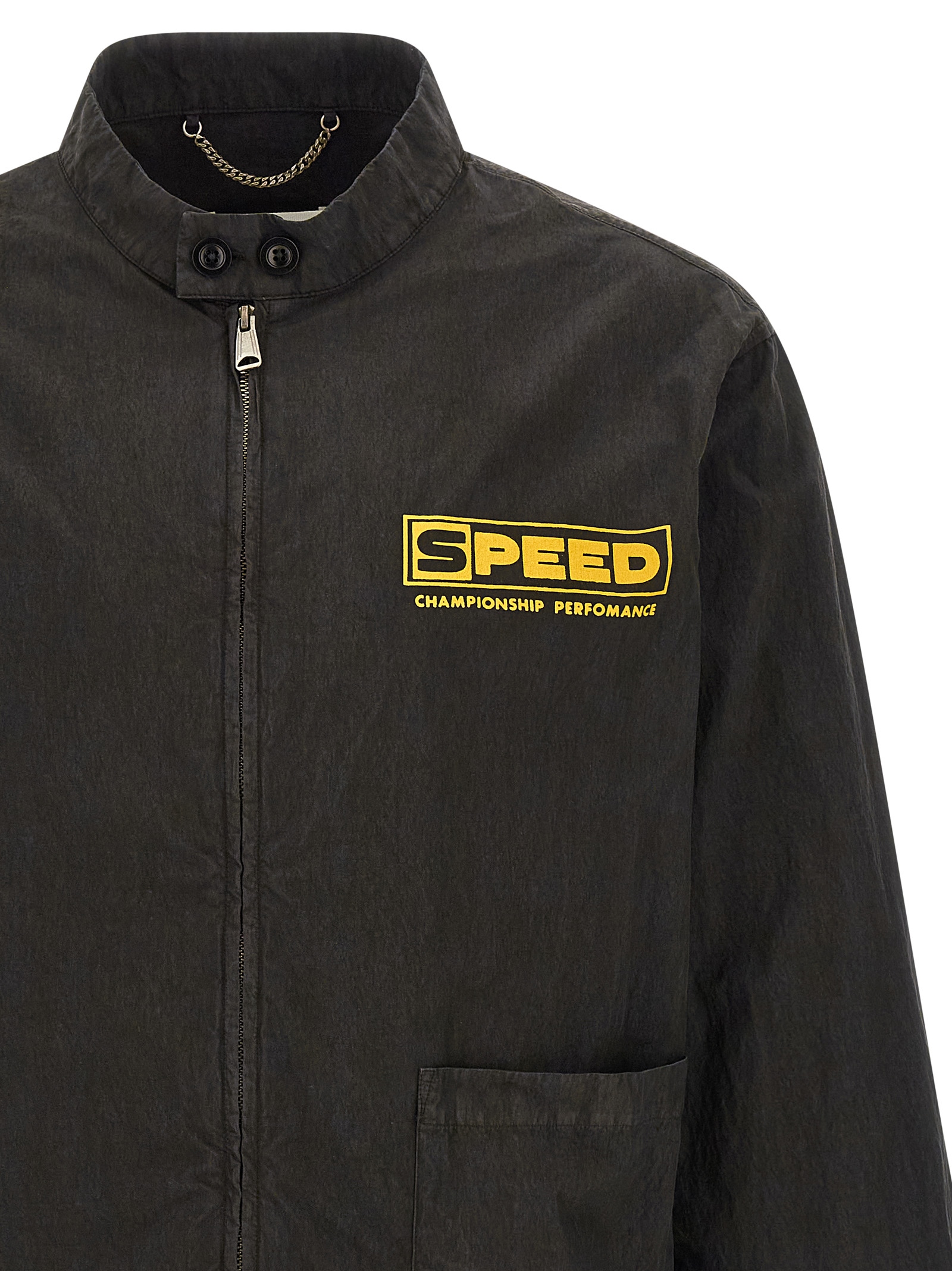 Спортивная куртка в винтажном стиле из выстиранного хлопка, высокий воротник с пряжкой, затягивающийся шнурок по низу, застежка-молния спереди с графическим принтом в университетском стиле, передний накладной карман, длинные рукава с эластичными манжетами.