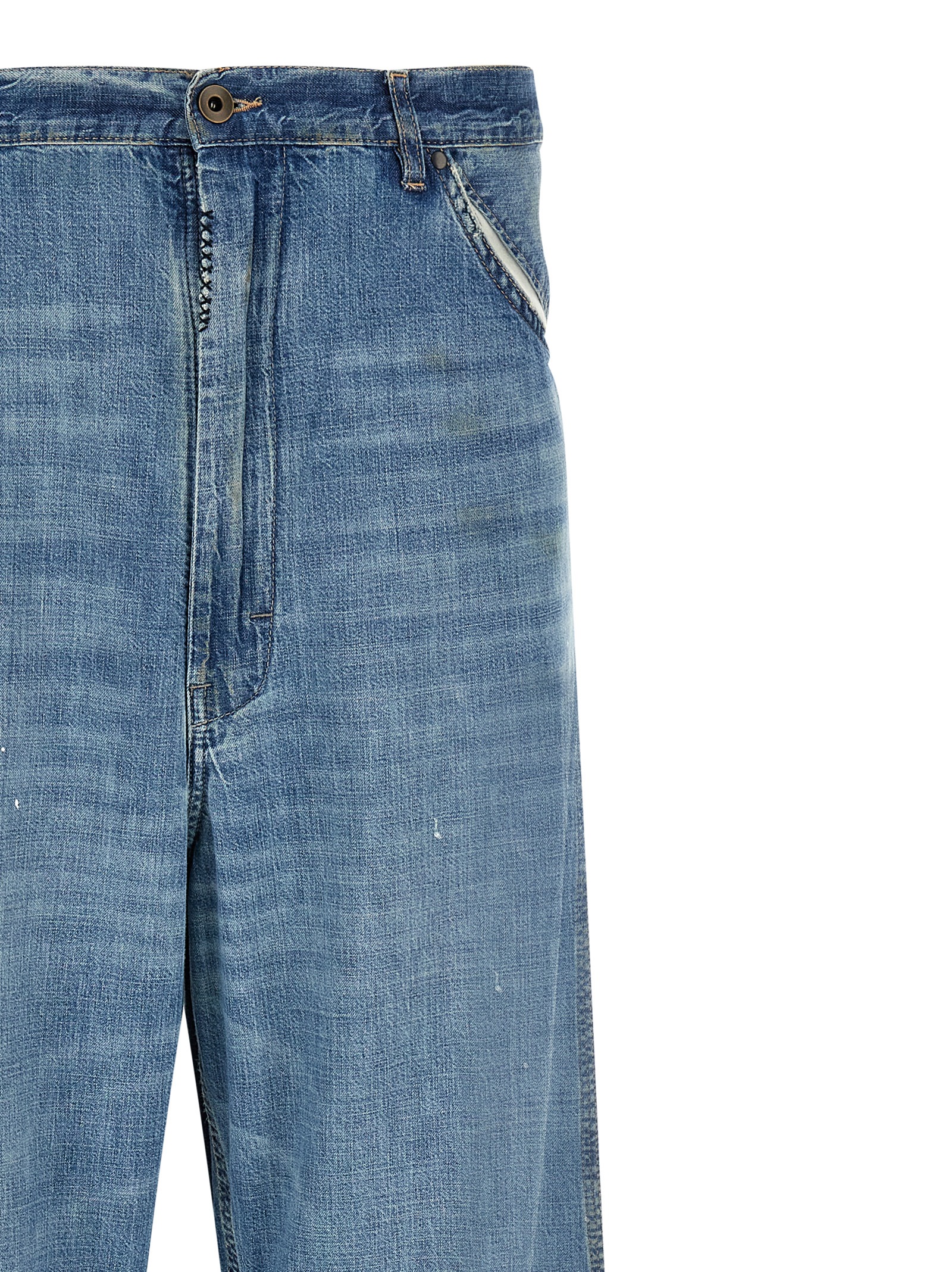 Джинсы из японского денима плотностью 8,05 унций с эффектом потертости, с пятнами краски на передней части, широкими расклешенными штанинами, застежкой на молнию и пуговицу спереди, карманами, этикетками с логотипами «Memory of» и «Four Stitches» сзади.Характеристики товара