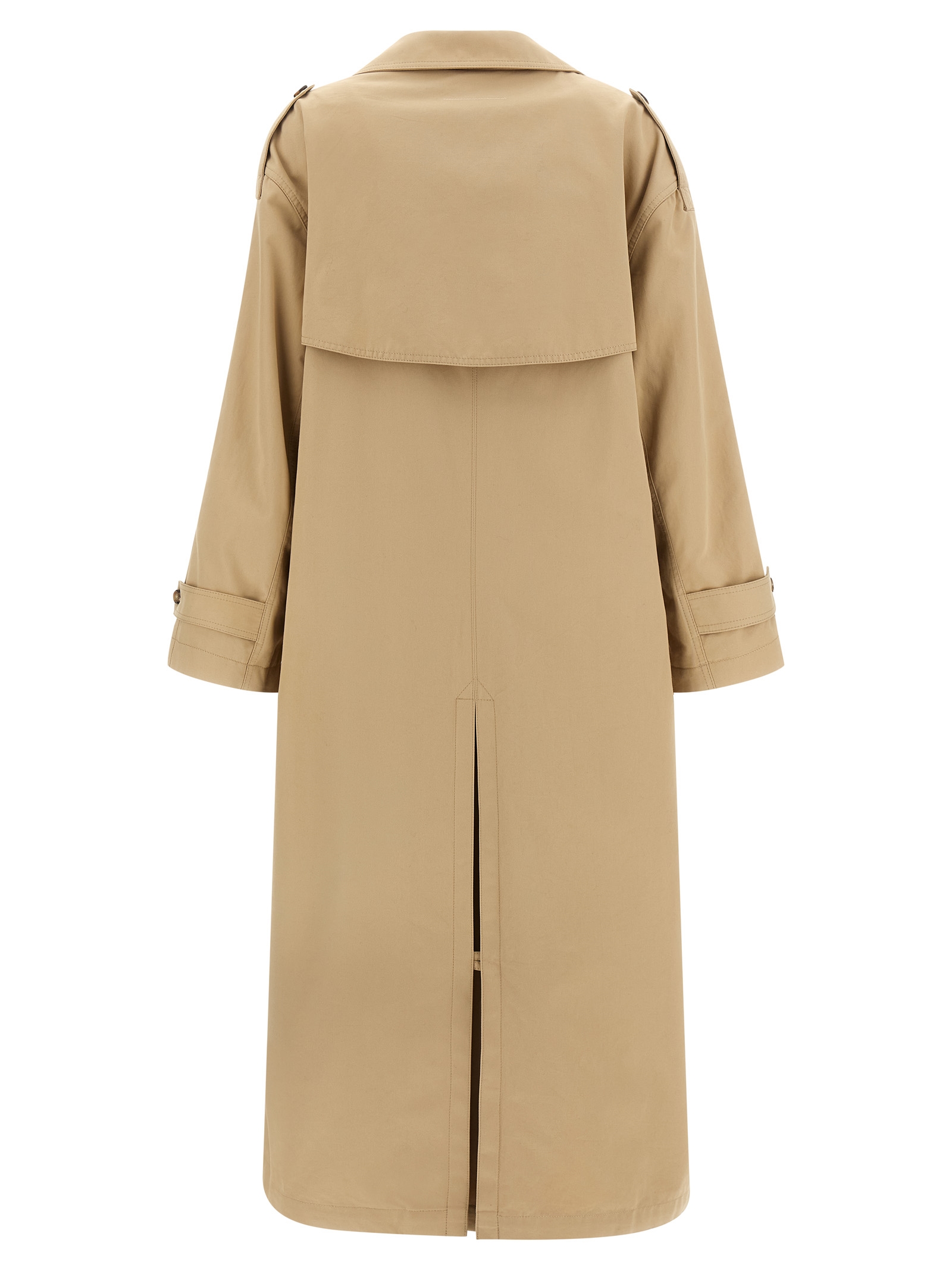 Light double-breasted trench coat in light cotton twill with front horn button closure, lapel collar, pockets, contrast Lycra gloves detail stitched at the waist, sash on the shoulder, long sleeves, cape with 'White Stitch Line', back split. The garment can be worn as a classic trench coat using gloves as a belt at the waist or letting the long sleeves fall along the body and using gloves as sleeves.