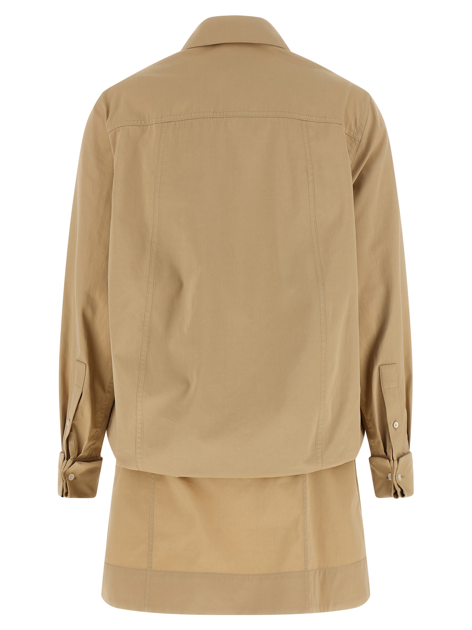 Мини-платье из легкого хлопкового и шелкового габардина, многослойной конструкции, состоящее из топа с контрастной вышивкой «Double L» спереди, рубашки с заостренным воротником, карманами, застежкой на перламутровые пуговицы спереди, длинными рукавами с французскими манжетами, тисненым эластичным поясом и слегка расклешенной юбкой.