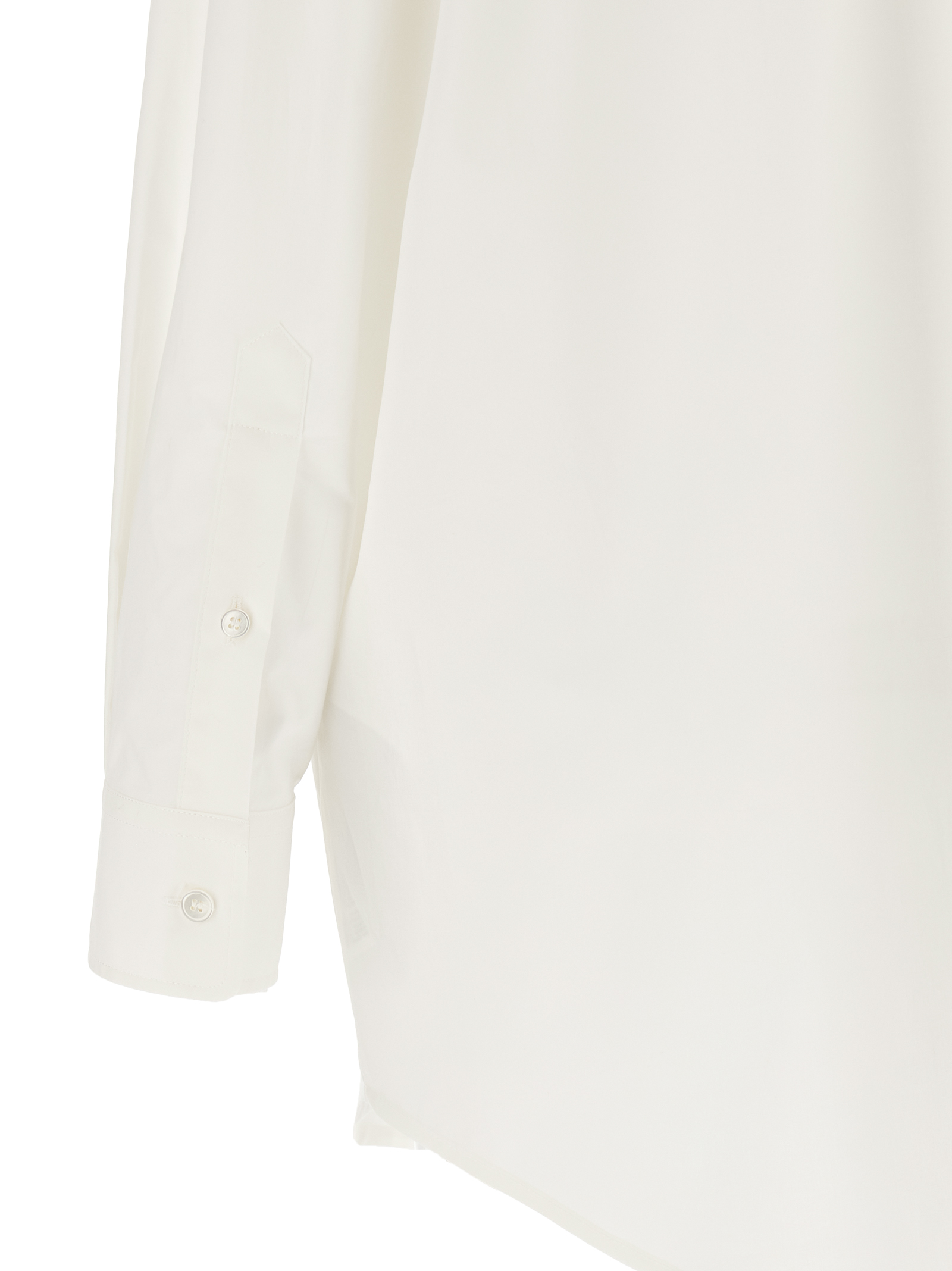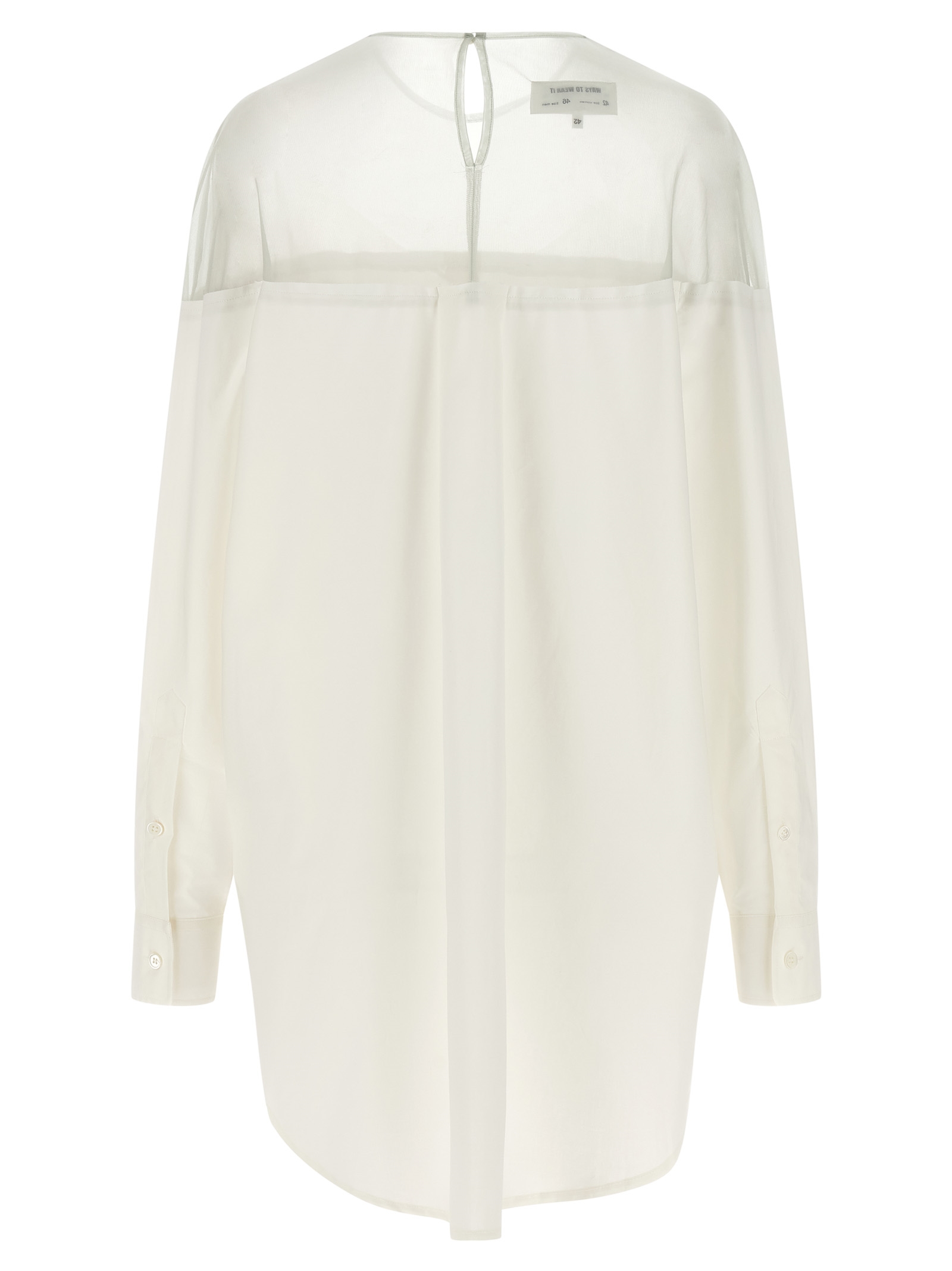 Рубашка из хлопкового поплина с полупрозрачной тюлевой вставкой, круглый вырез горловины с застежкой на пуговицы сзади и ажурным каплевидным вырезом, нагрудный карман, застежка на перламутровые пуговицы спереди, длинные рукава с манжетами, спинка с пуговицами-плиссе, закругленный низ.Характеристики товара