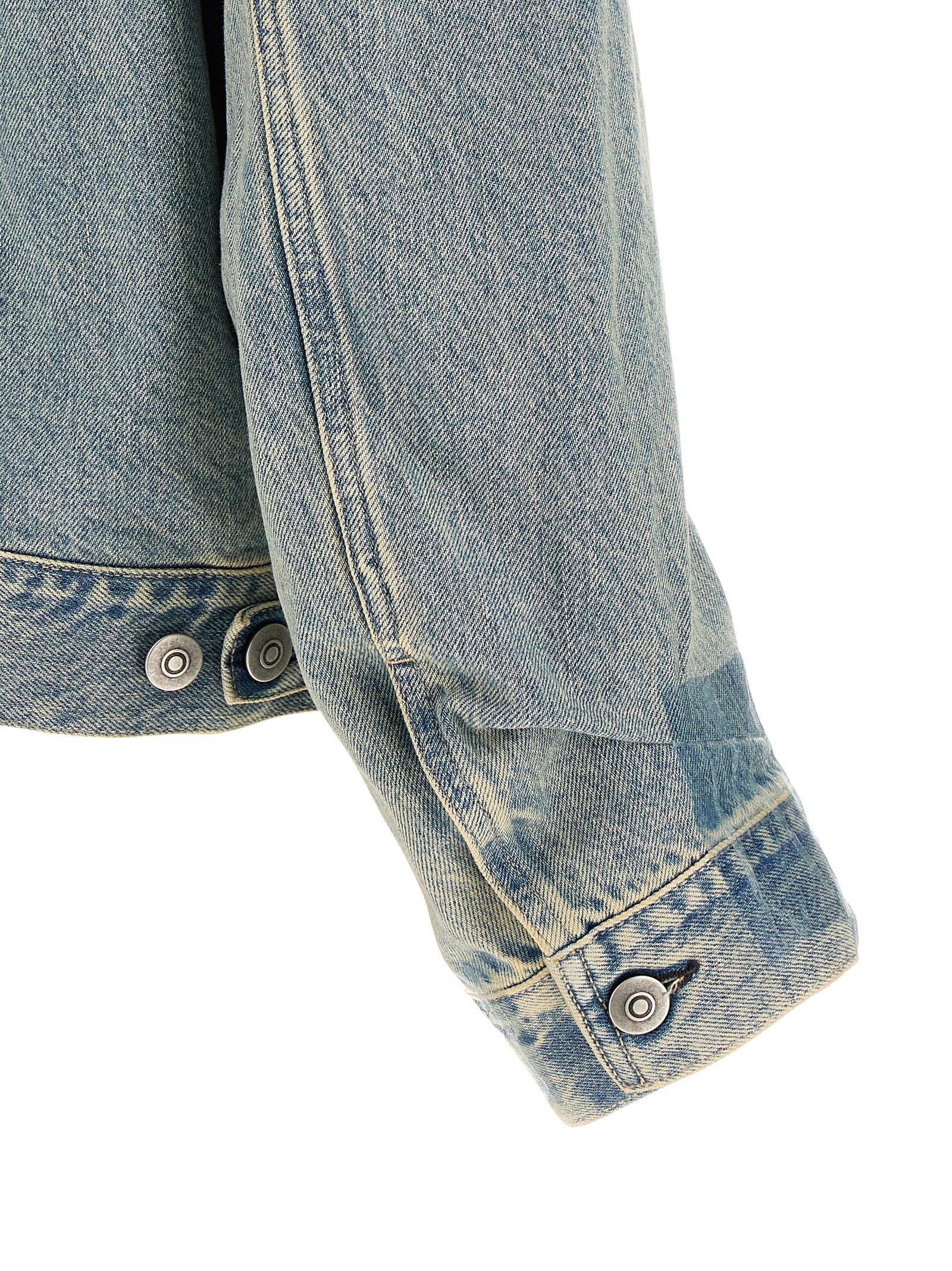 Джинсовая куртка из выстиранного хлопка с проклеенными манжетами и отворотами, отделанными прозрачной лентой по низу и на груди, карманами, застежкой на металлические пуговицы спереди, длинными рукавами с манжетами, четырьмя стежками на спине и регулируемым низом.Характеристики товара