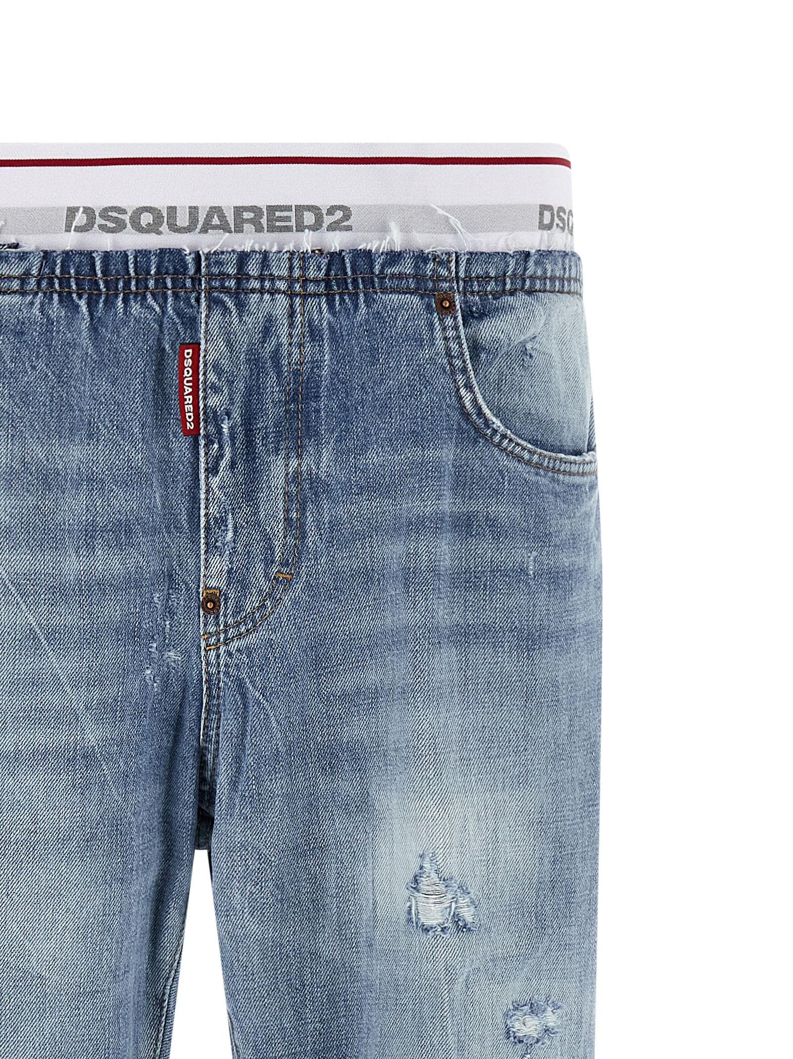 'Denim Jogger' 13.5 oz stone washed stretch cotton denim jeans with destroyed details, contrast stitching, elastic insert with jacquard logo at the waist, pull-on model, trompe l'oeil flap, five pockets.