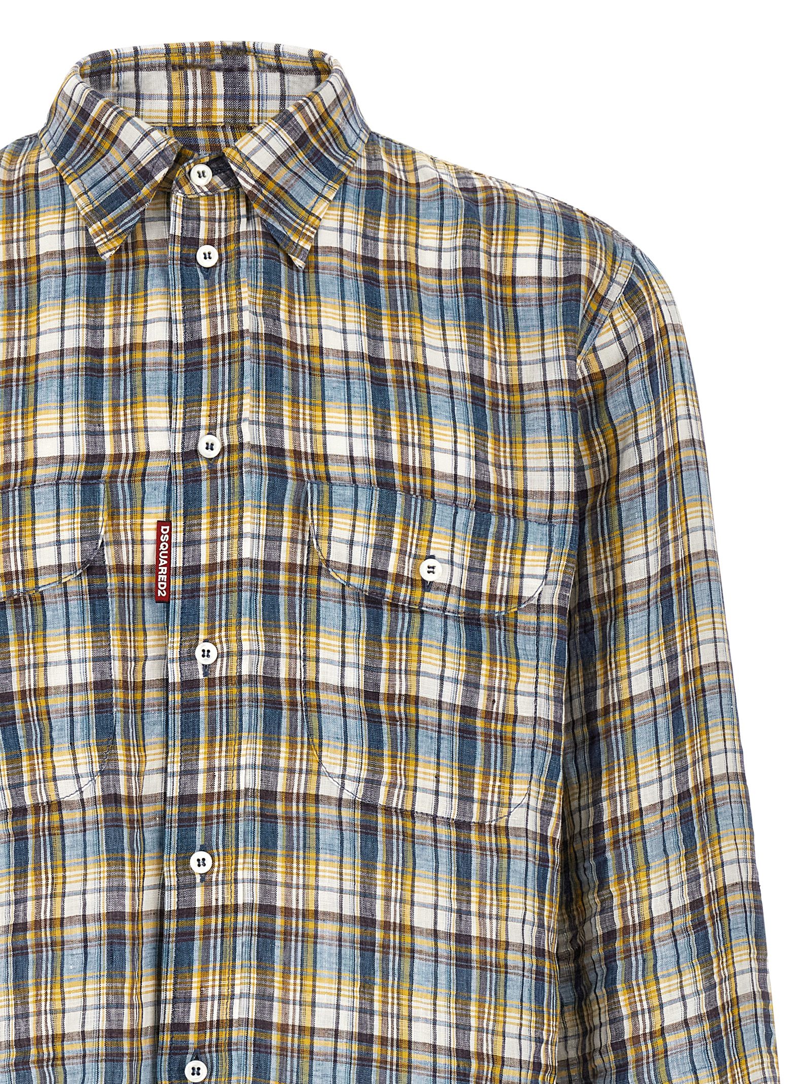 'Canadian Vintage' plaid linen shirt with pointed collar, pockets, front button closure, long sleeves with cuffs and dropped shoulders, rounded hem.