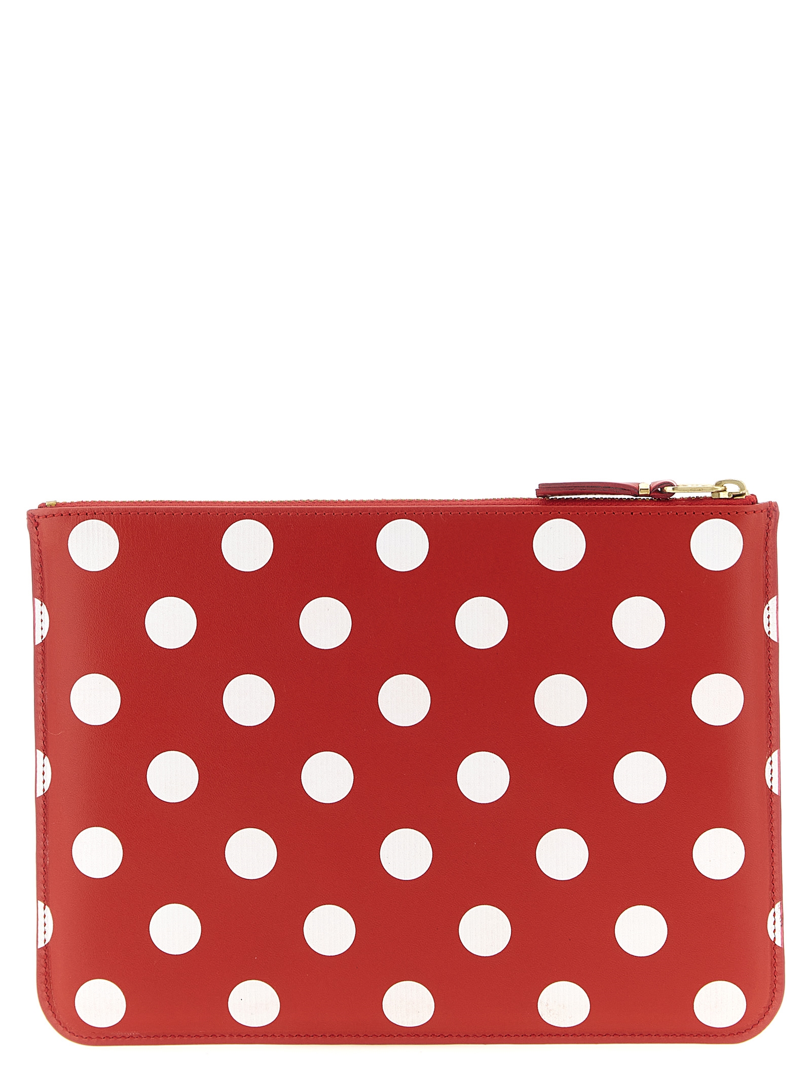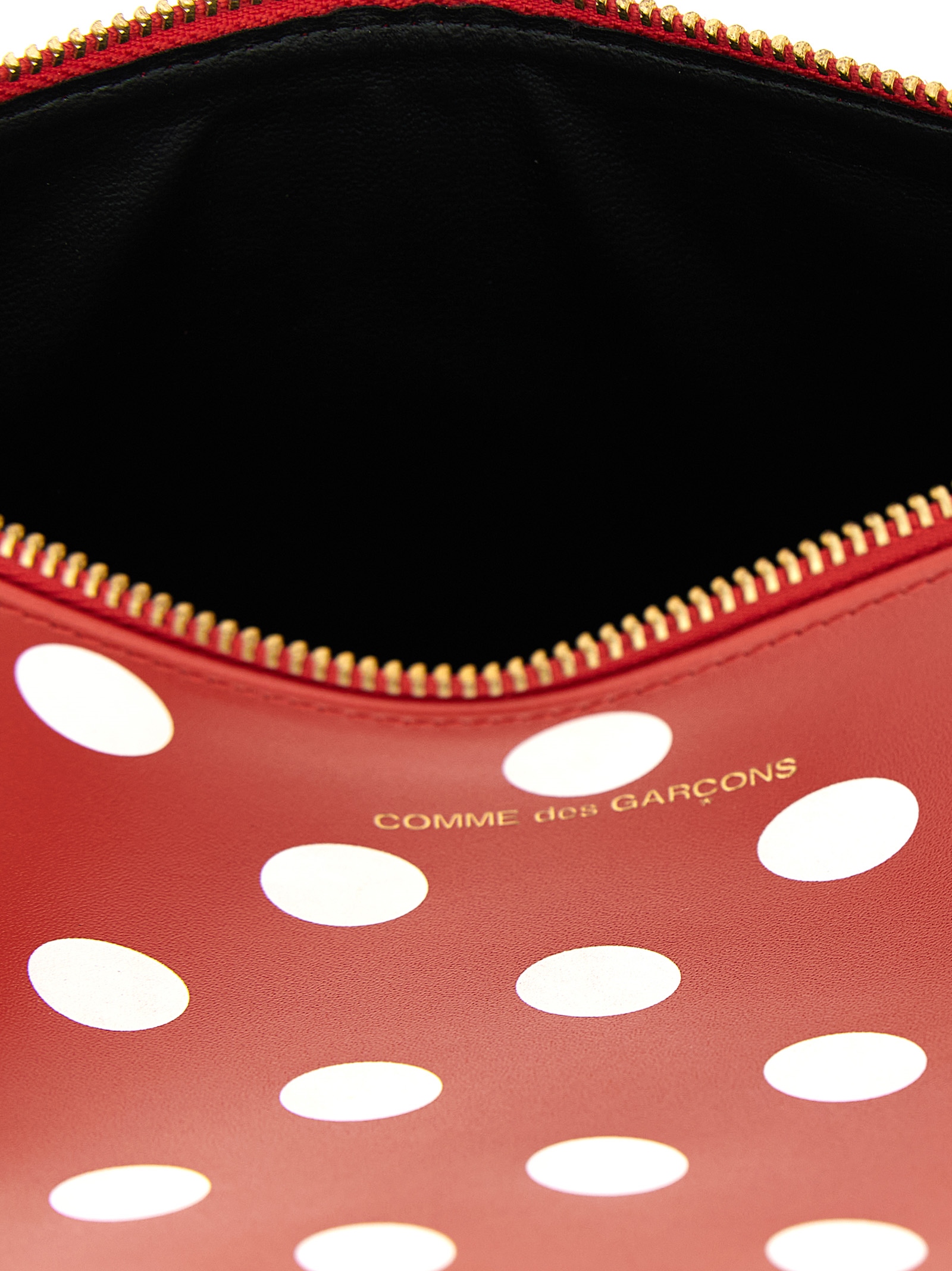'Polka Dots Printed' leather wallet with all-over polka dot print, front embossed logo, top zip closure.