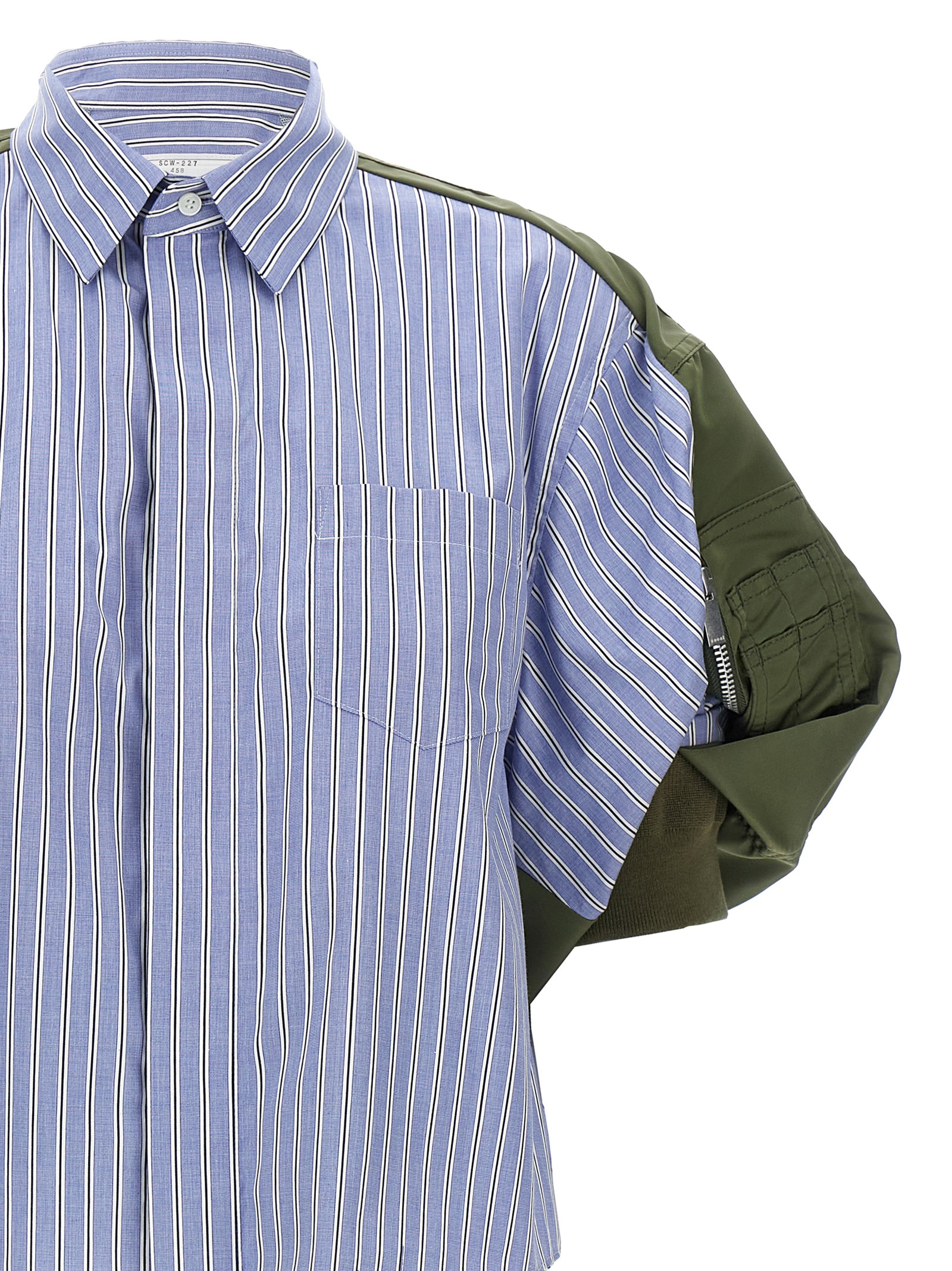 Striped cotton poplin shirt, crop model, chest pocket, front hidden button closure, tone-on-tone nylon twill insert to create puff bomber sleeve style with stretch knit cuffs, rounded and asymmetrical hem.