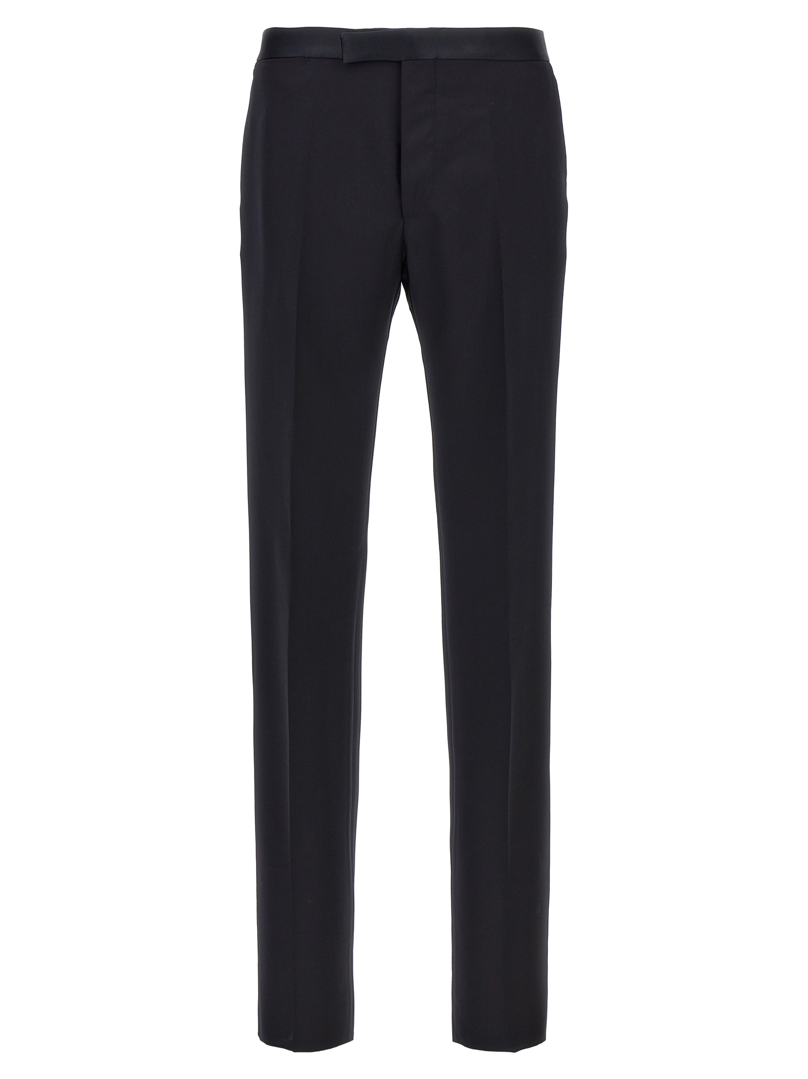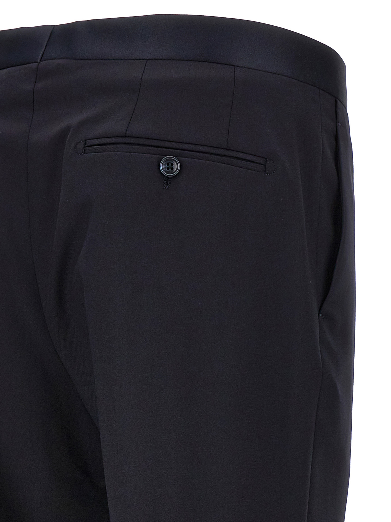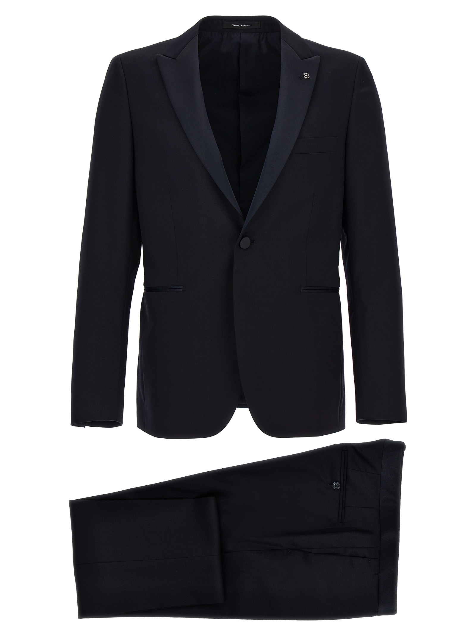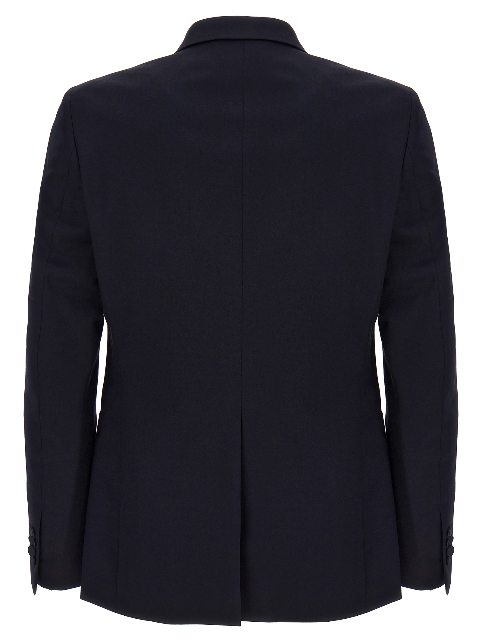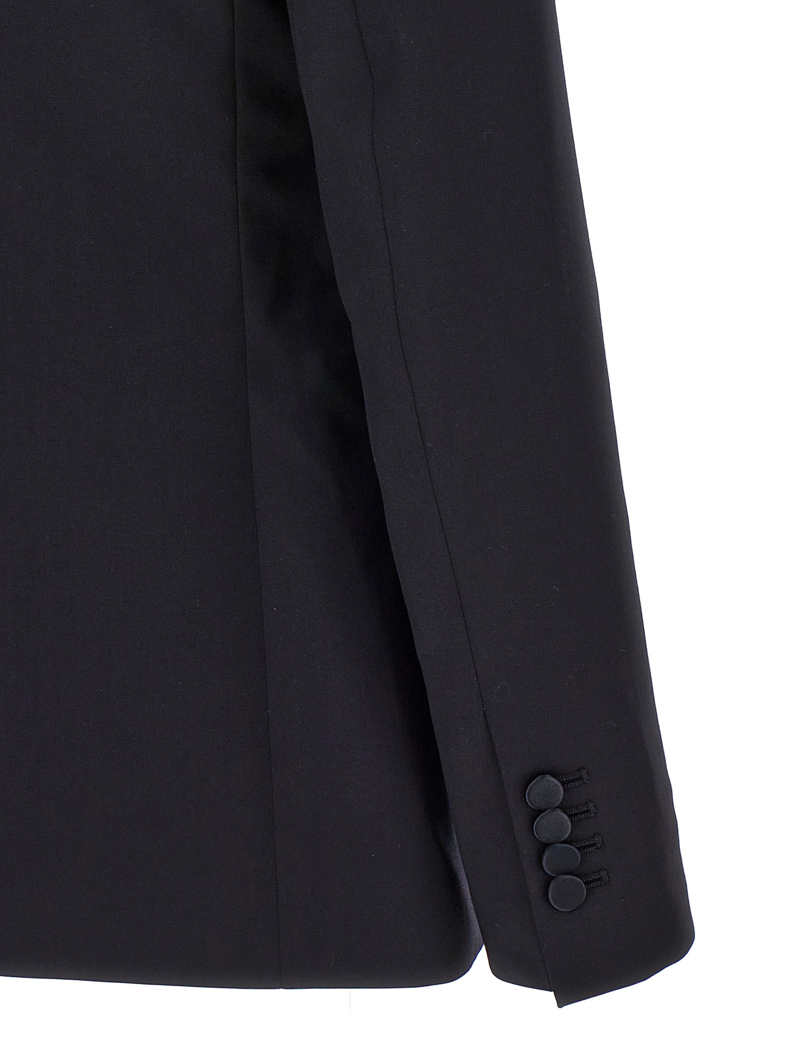 Super 110's wool tuxedo dress consisting of single-breasted blazer with button closure, pockets, back split and trousers with stretched pleat, hook and button zip closure.