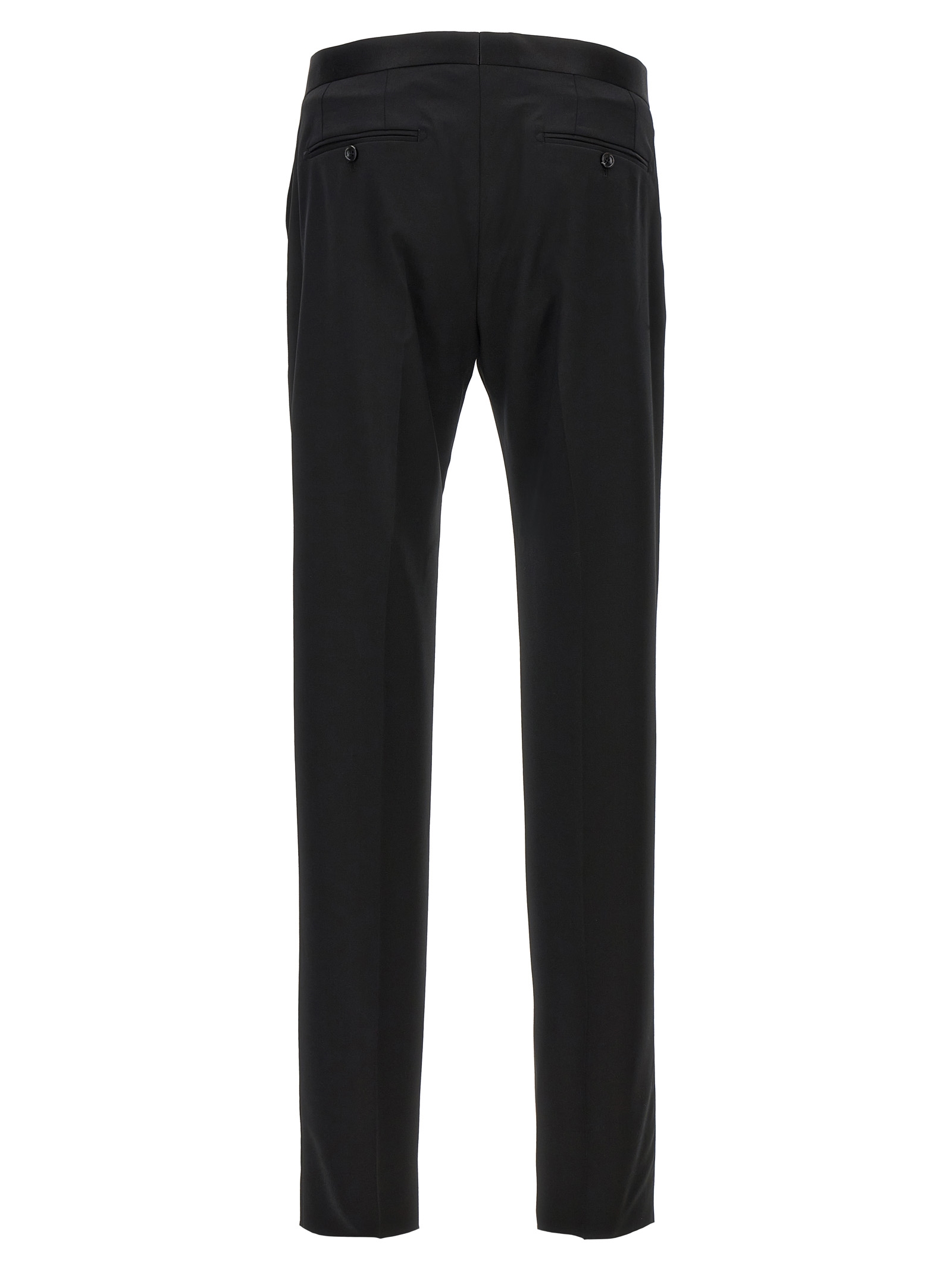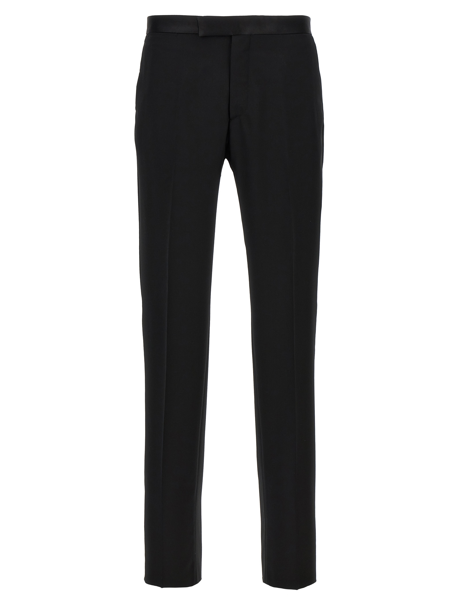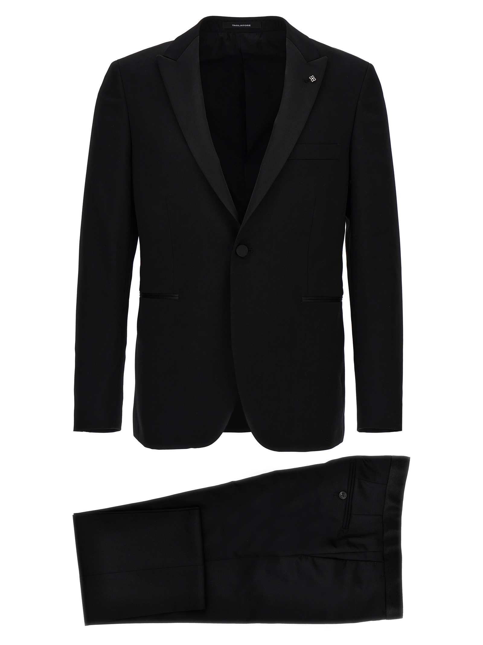 Super 110's wool tuxedo dress consisting of single-breasted blazer with button closure, pockets, back split and trousers with stretched pleat, hook and button zip closure.