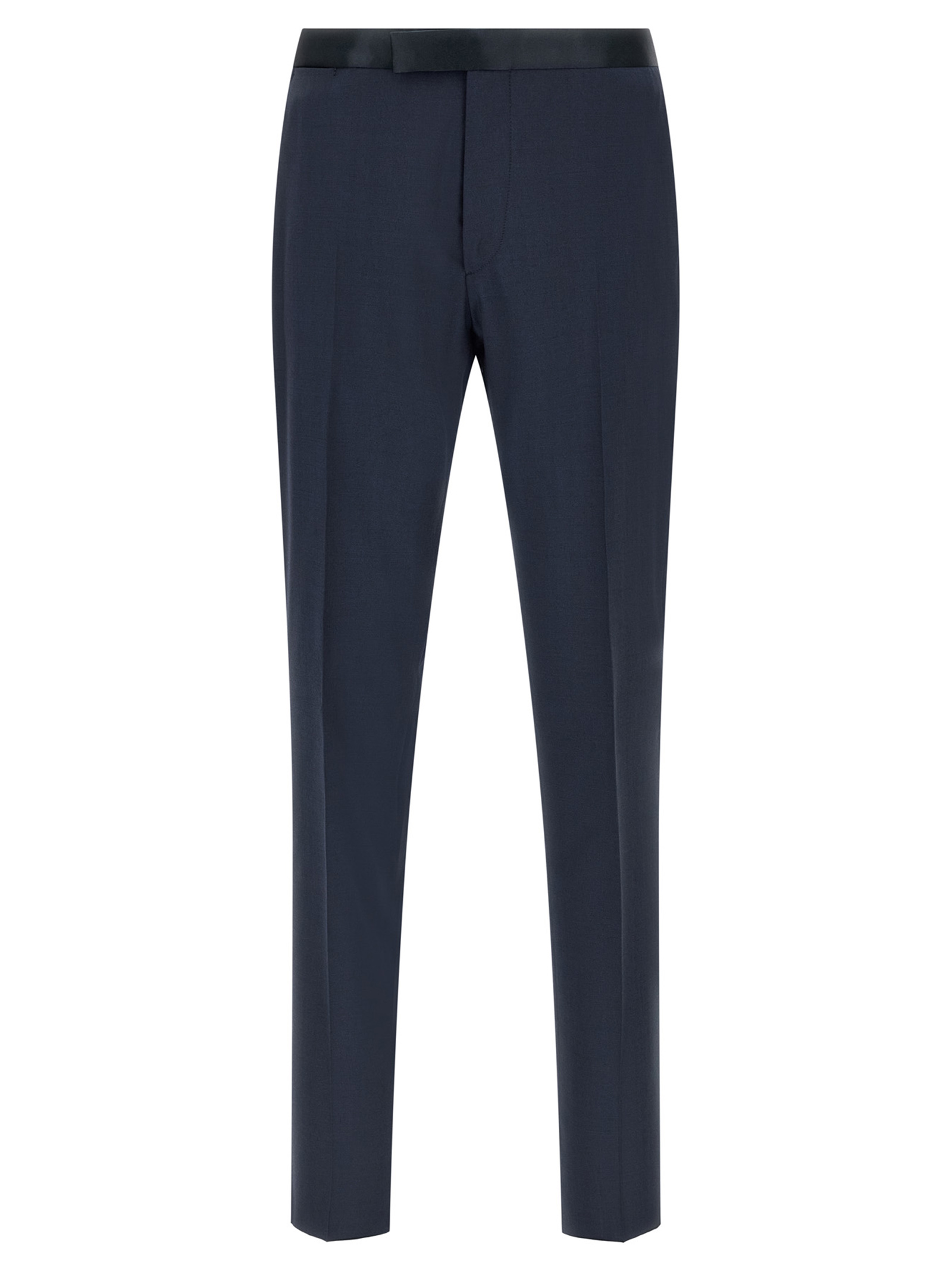 Super 110'S virgin wool tuxedo dress with tone-on-tone satin details, single-breasted blazer with front covered button closure, shawl collar, breast pocket, patch pockets, structured shoulder strap, opening buttonhole cuffs, back split, cupro lining, three inner pockets and trousers with straight leg, stretched pleat, zip closure and front hooks. Front American pockets, back welt pockets, leg bottoms to be finished, cotton lining.