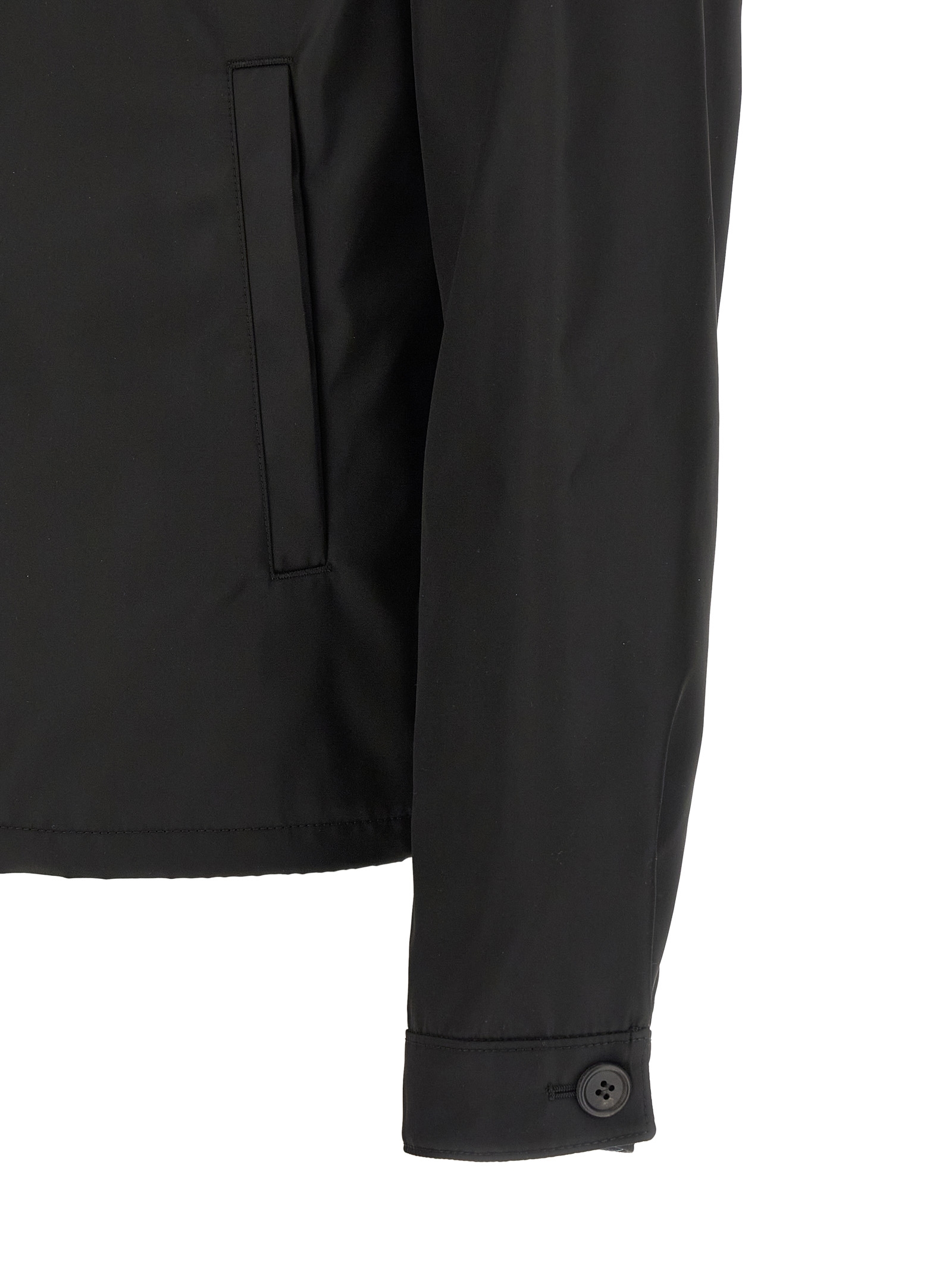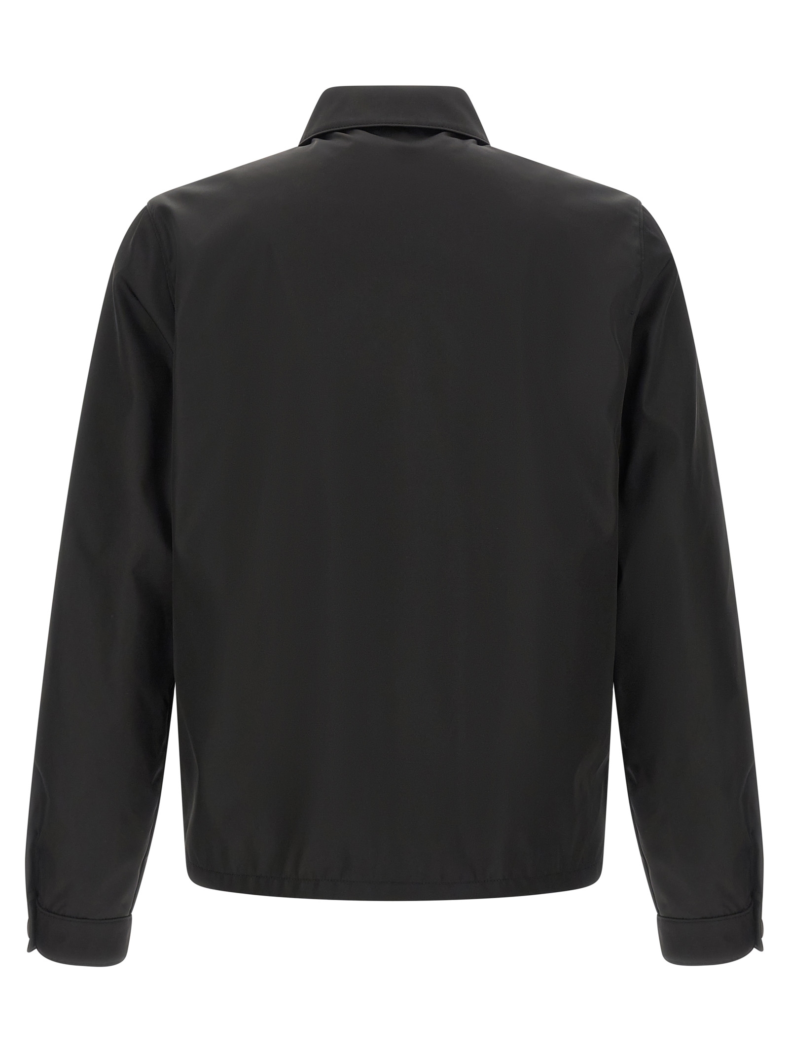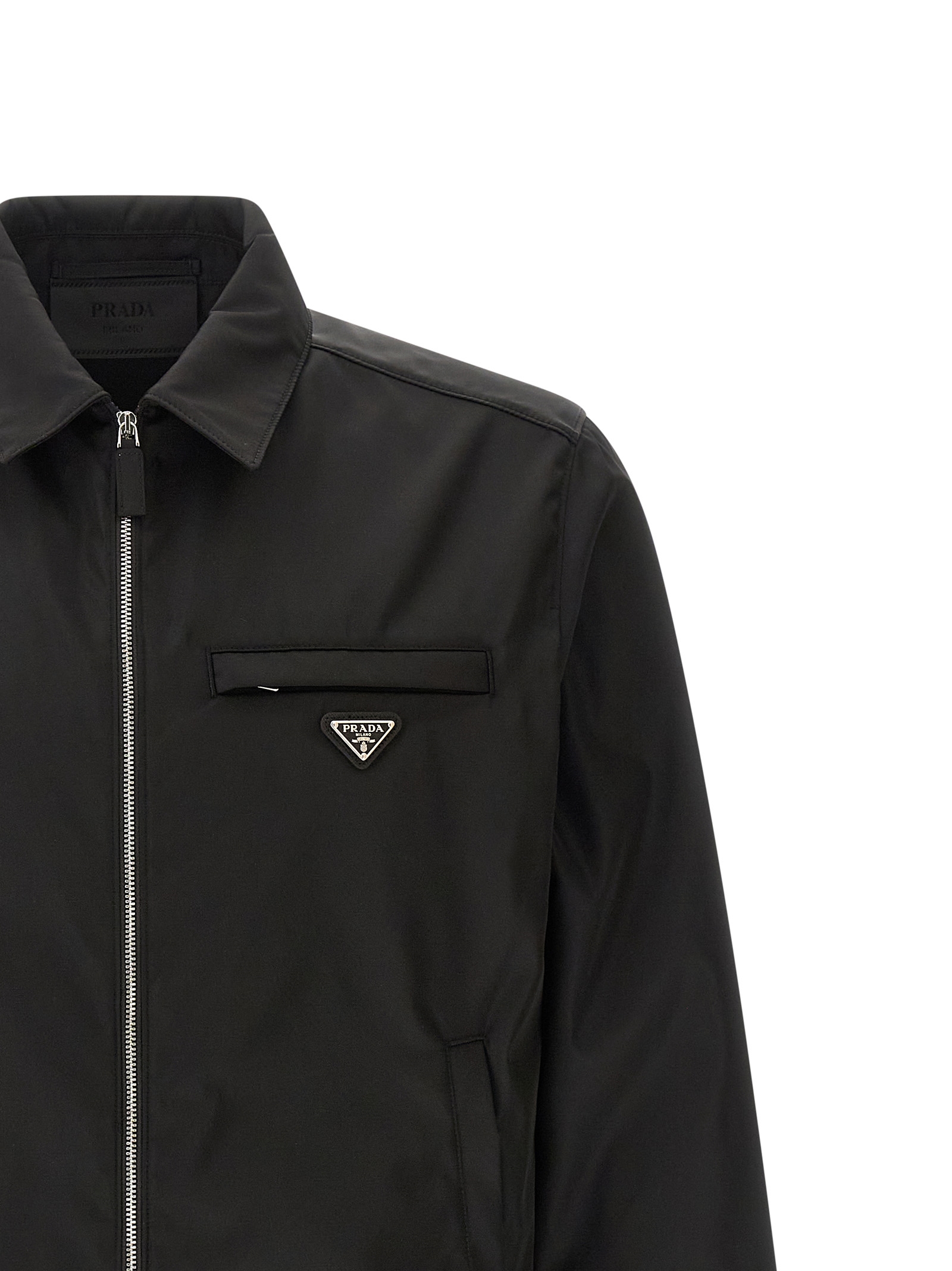 Re-Nylon jacket, pocket with triangle logo in enamelled metal, shirt collar, front zip closure, long sleeves with cuffs, pockets, drawstring on the hem, unlined. SUSTAINABLE: Product made with Re-Nylon, a regenerated yarn made from the recycling and purification of plastic collected in oceans, fishing nets and textile fibers