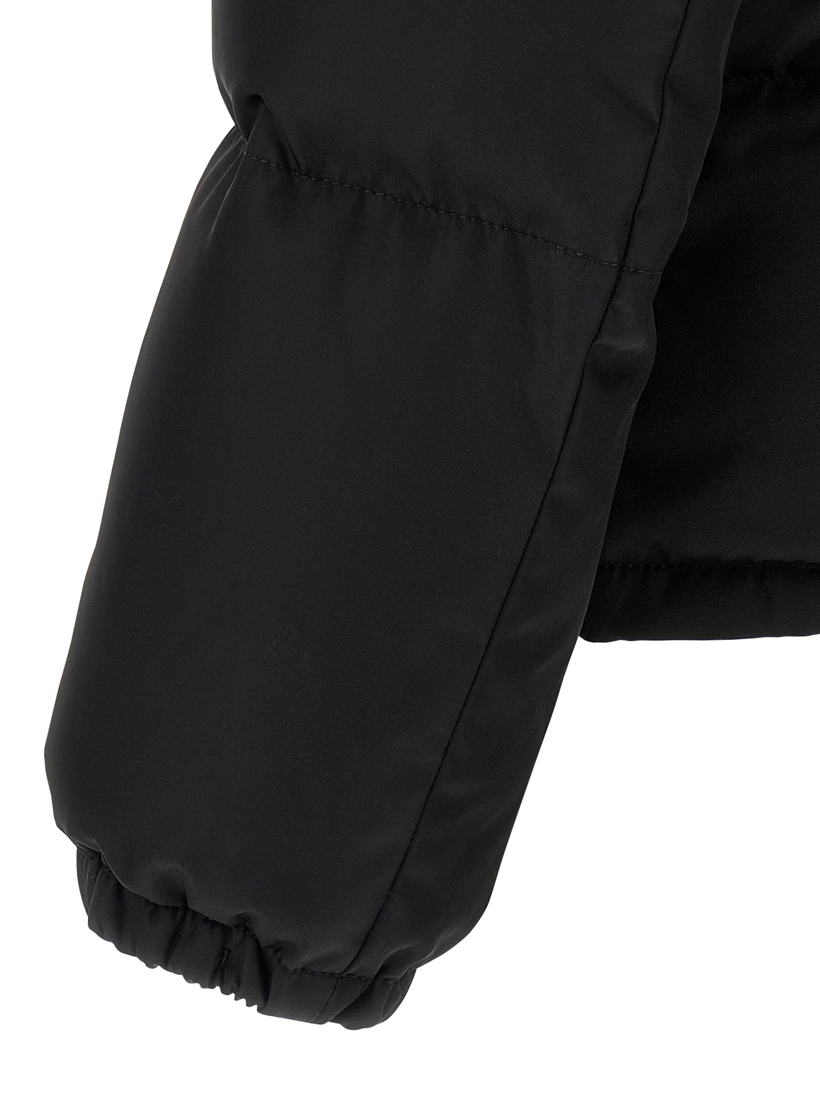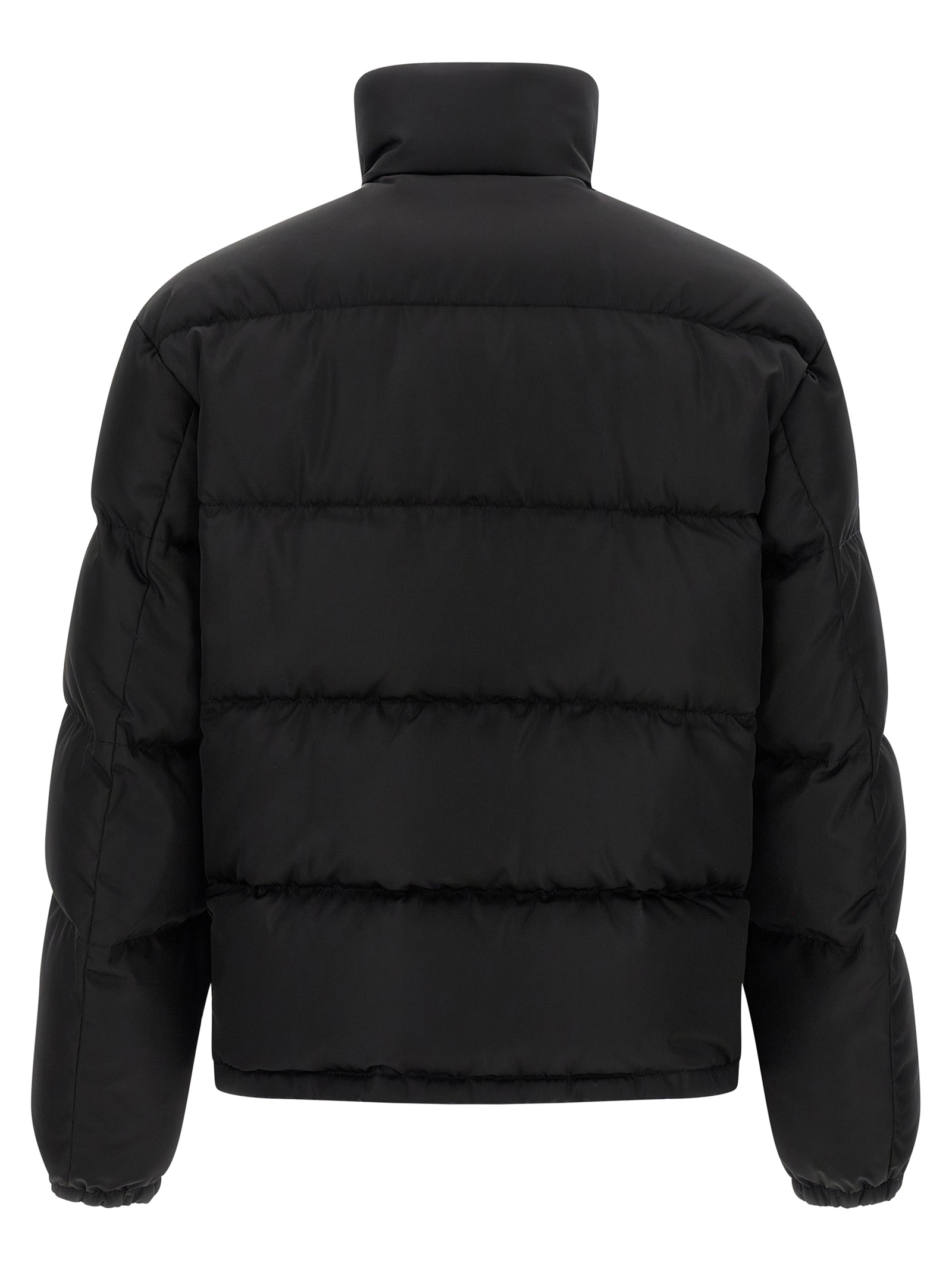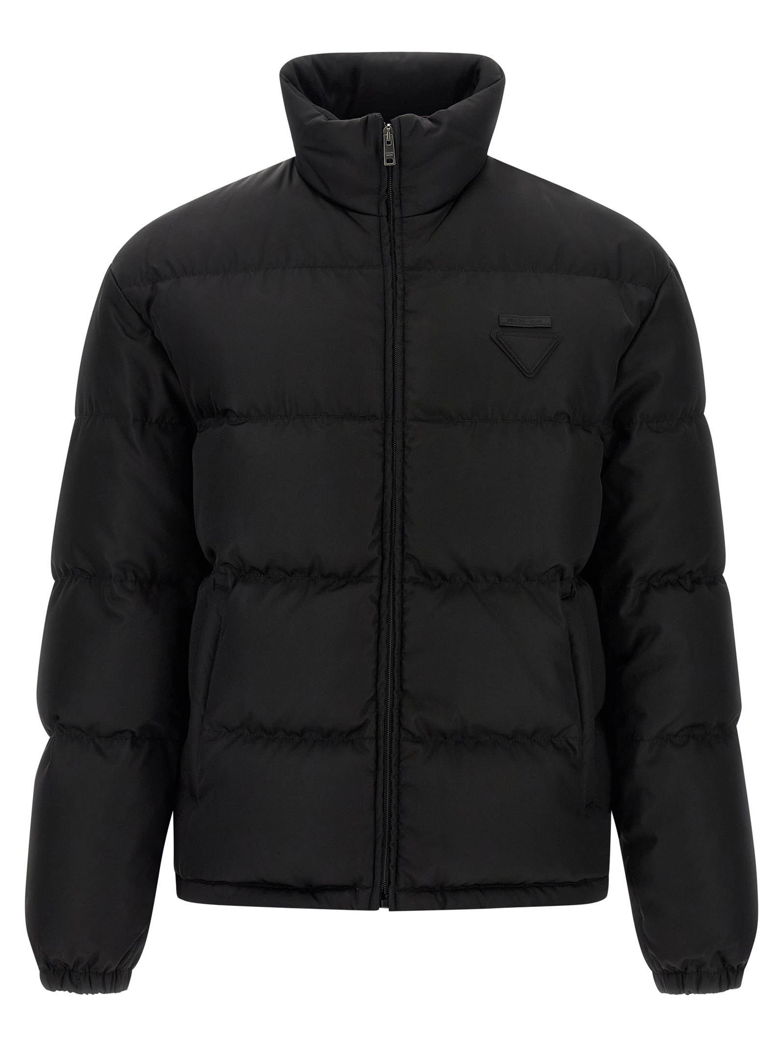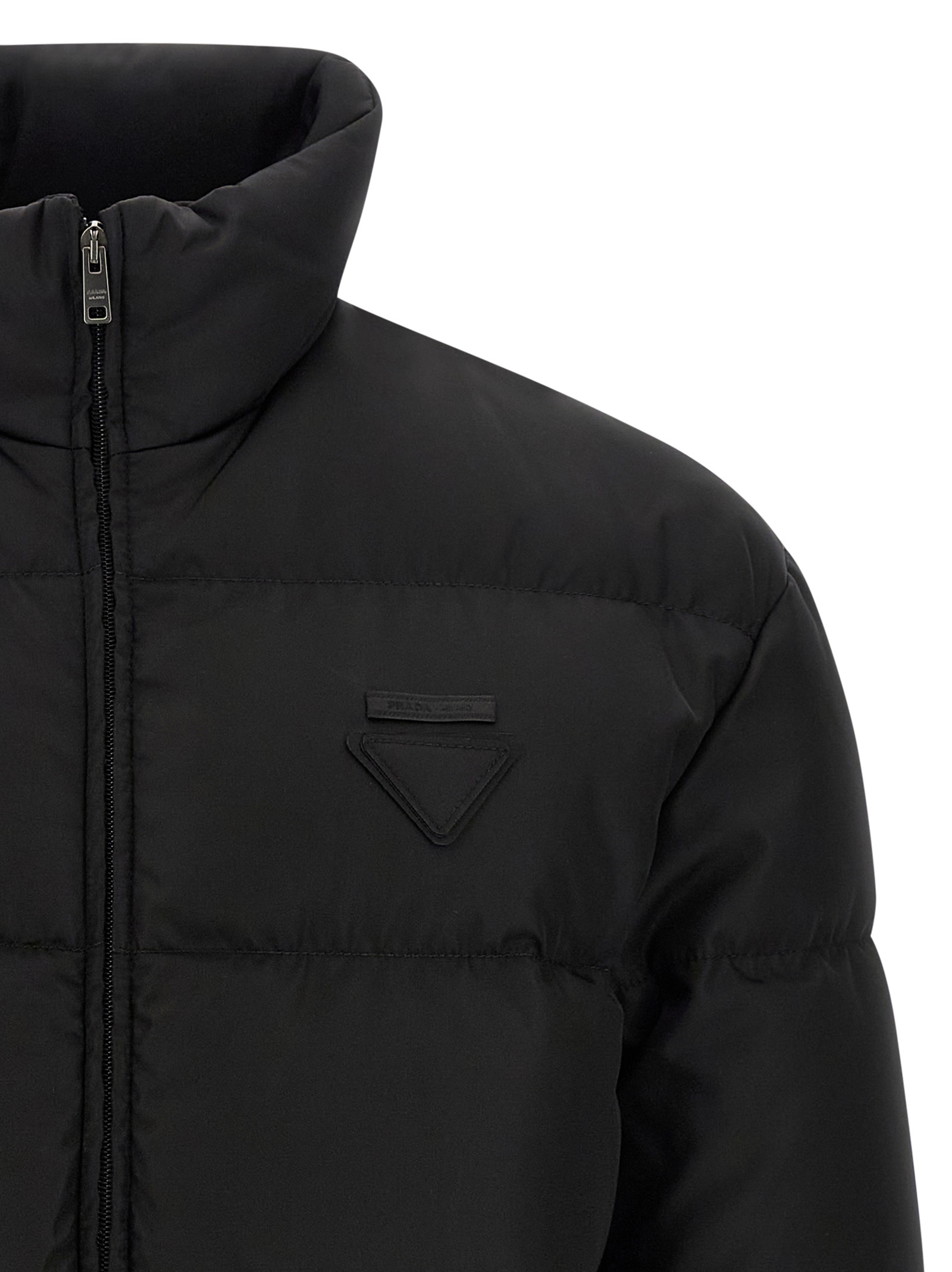 Quilted Re-Nylon down jacket with goose feather padding, triangle logo in tone-on-tone fabric and front zip closure, high neck, pockets, long sleeves with elastic cuffs, drawstring on the hem. SUSTAINABLE: This product is made with Re-Nylon, a regenerated yarn made from recycled and purified plastic collected in oceans, fishery nets and textile fibers.