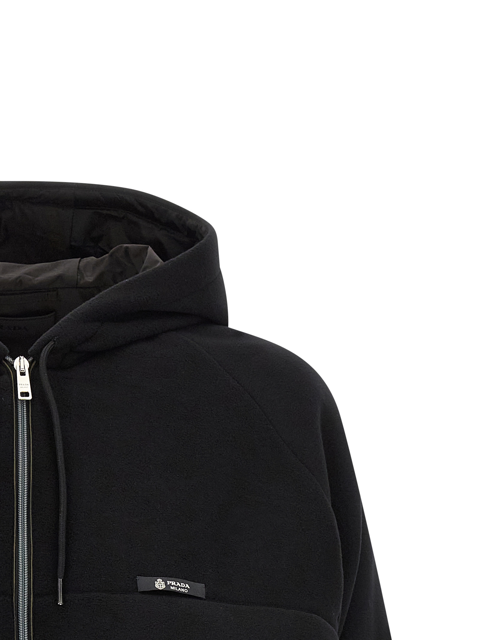 Tec fleece hooded jacket, nylon lining, logo patch and front zip closure, pockets, long sleeves with elastic cuffs, drawstring on the hem. SUSTAINABLE: Product made with recycled polyamide.