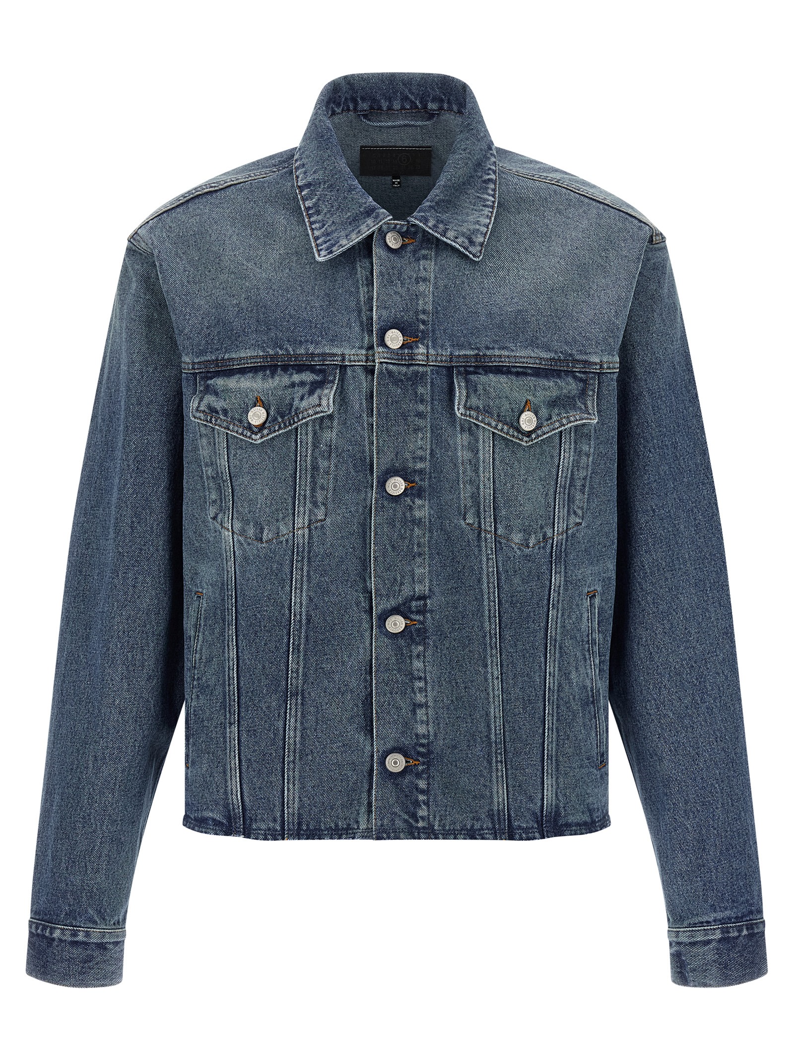 Cotton denim jacket with shirt collar, front button closure, pockets, long sleeves with cuffs and slightly dropped shoulders, and garment hem with raw cut hem.