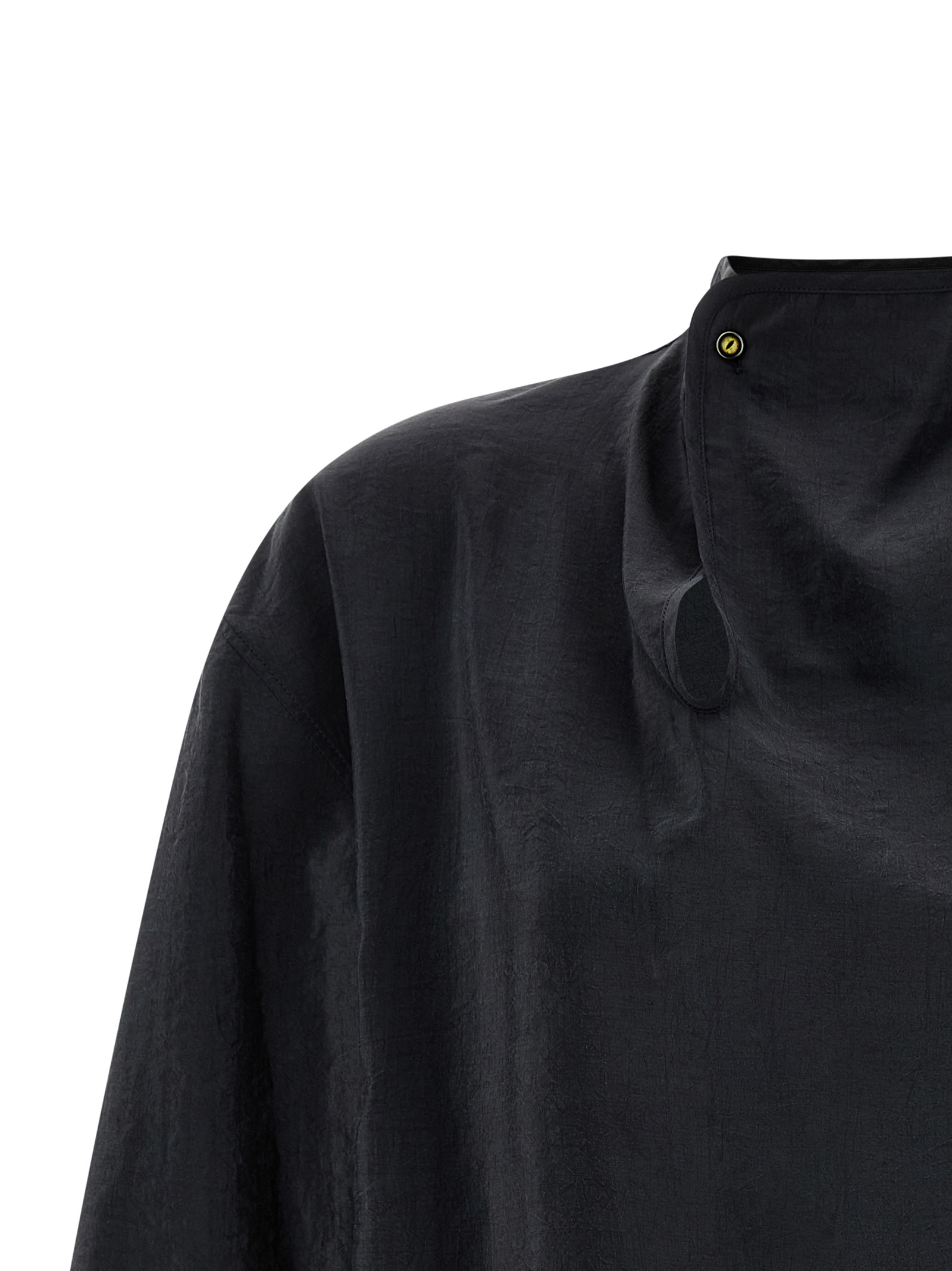 'Soft Collar' slightly ruffled 'dry' silk blend top, neckline with asymmetric closure with jewel button, straight fit, three-quarter wide sleeves.