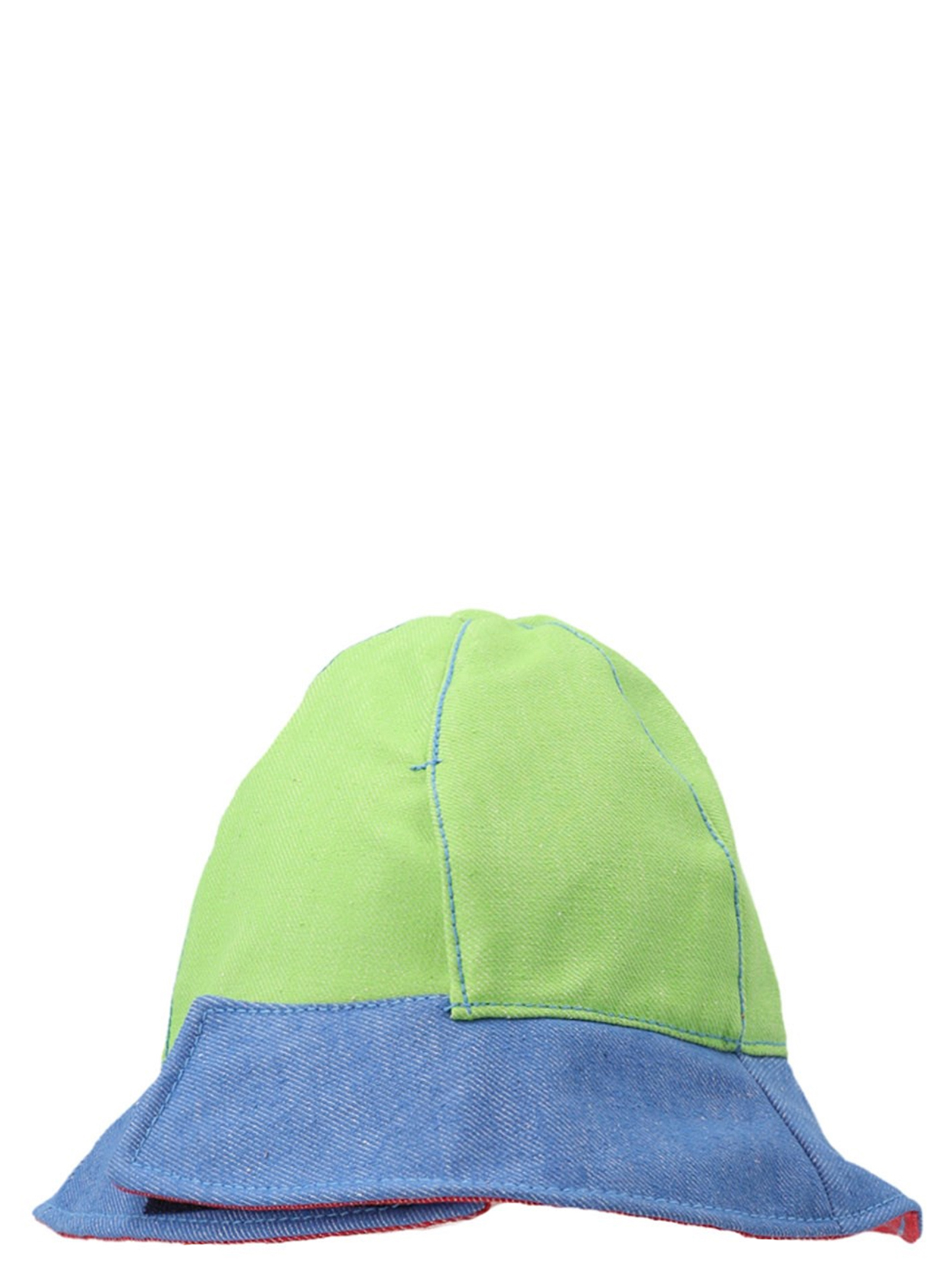 Multicolor cotton denim bucket hat with nylon cordie detail, velcro adjustable.