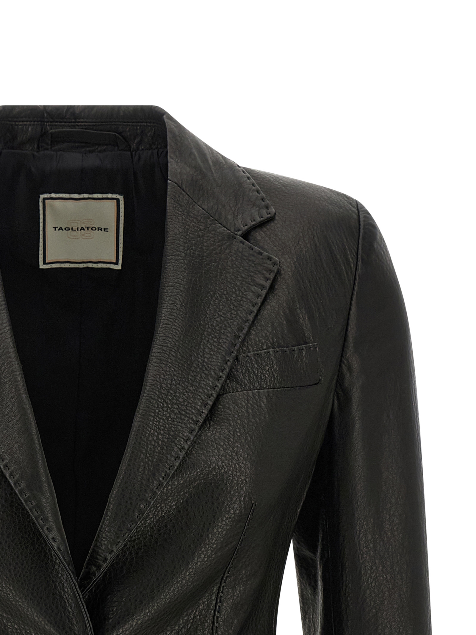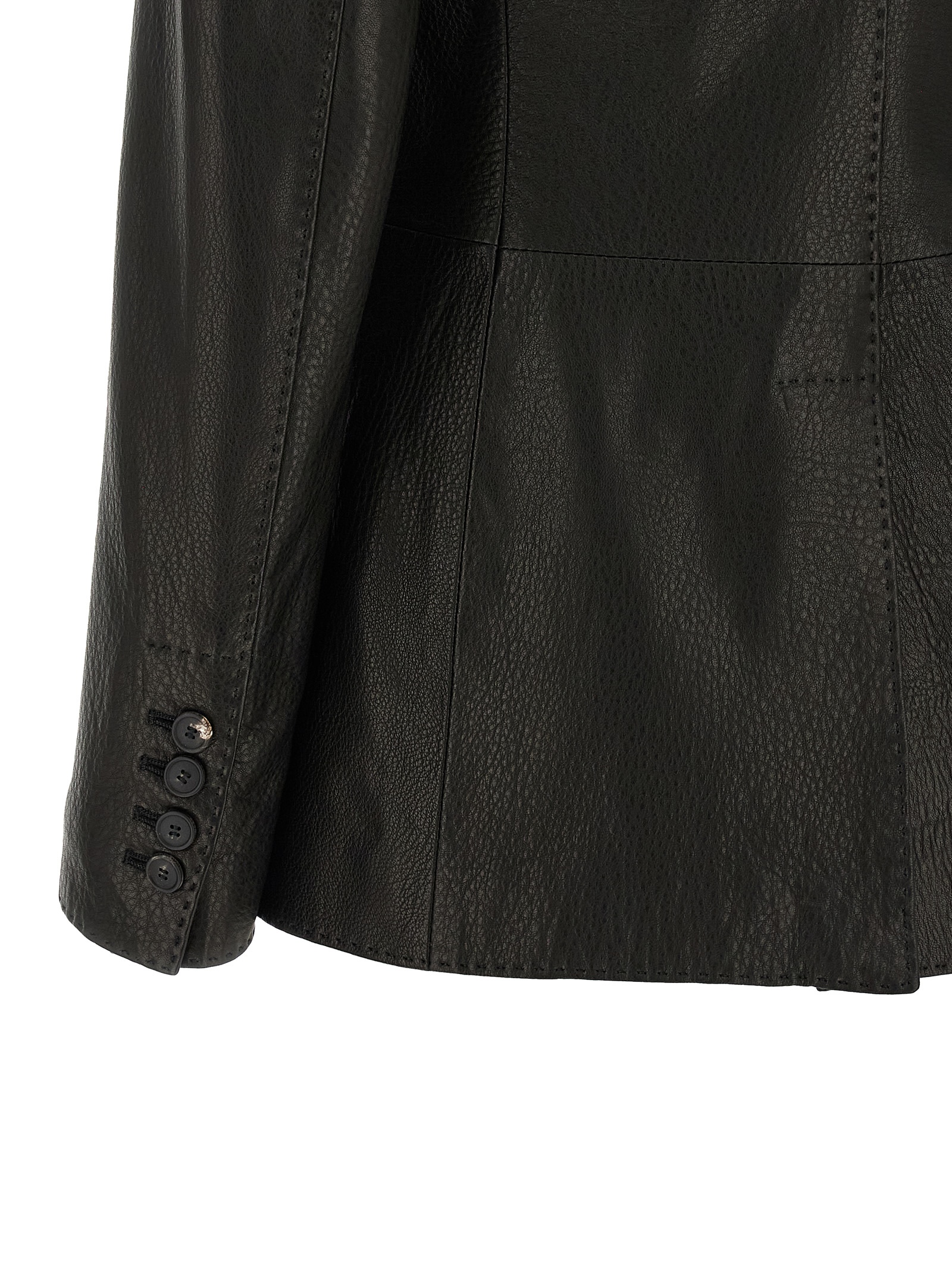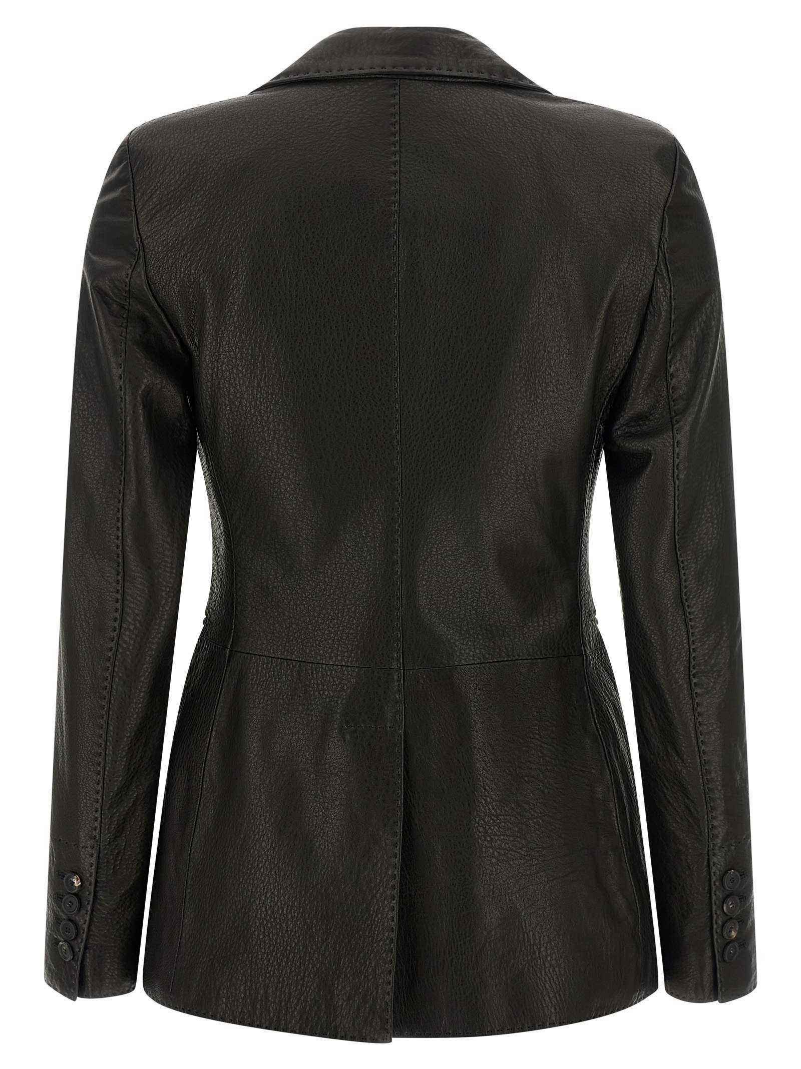 'Sophie' hammered leather single-breasted blazer with tone-on-tone stitching, two front horn button closure, mirror lapels, breast pocket, flap pockets, structured shoulder strap, long sleeves, back split, cupro blend lining.