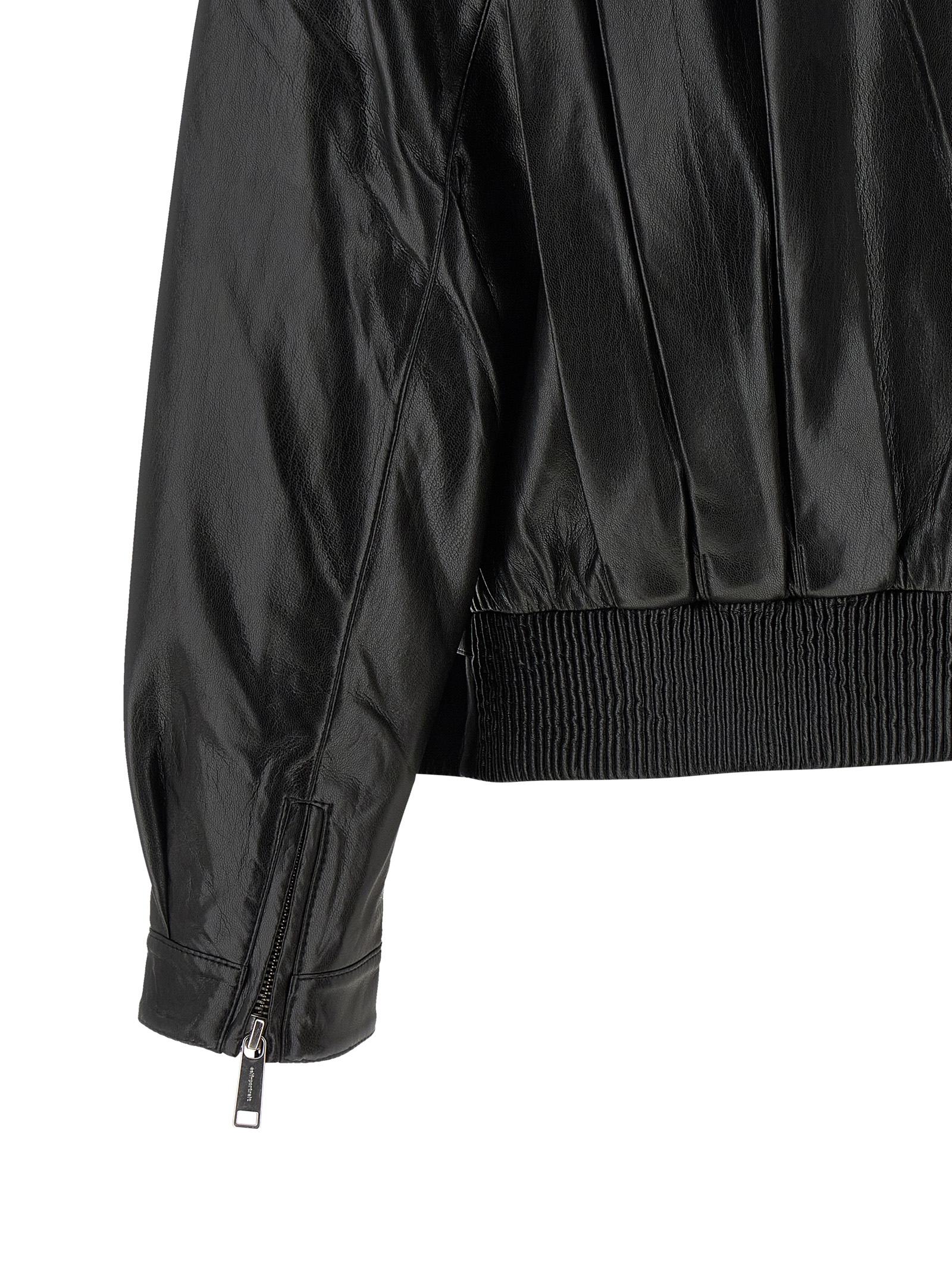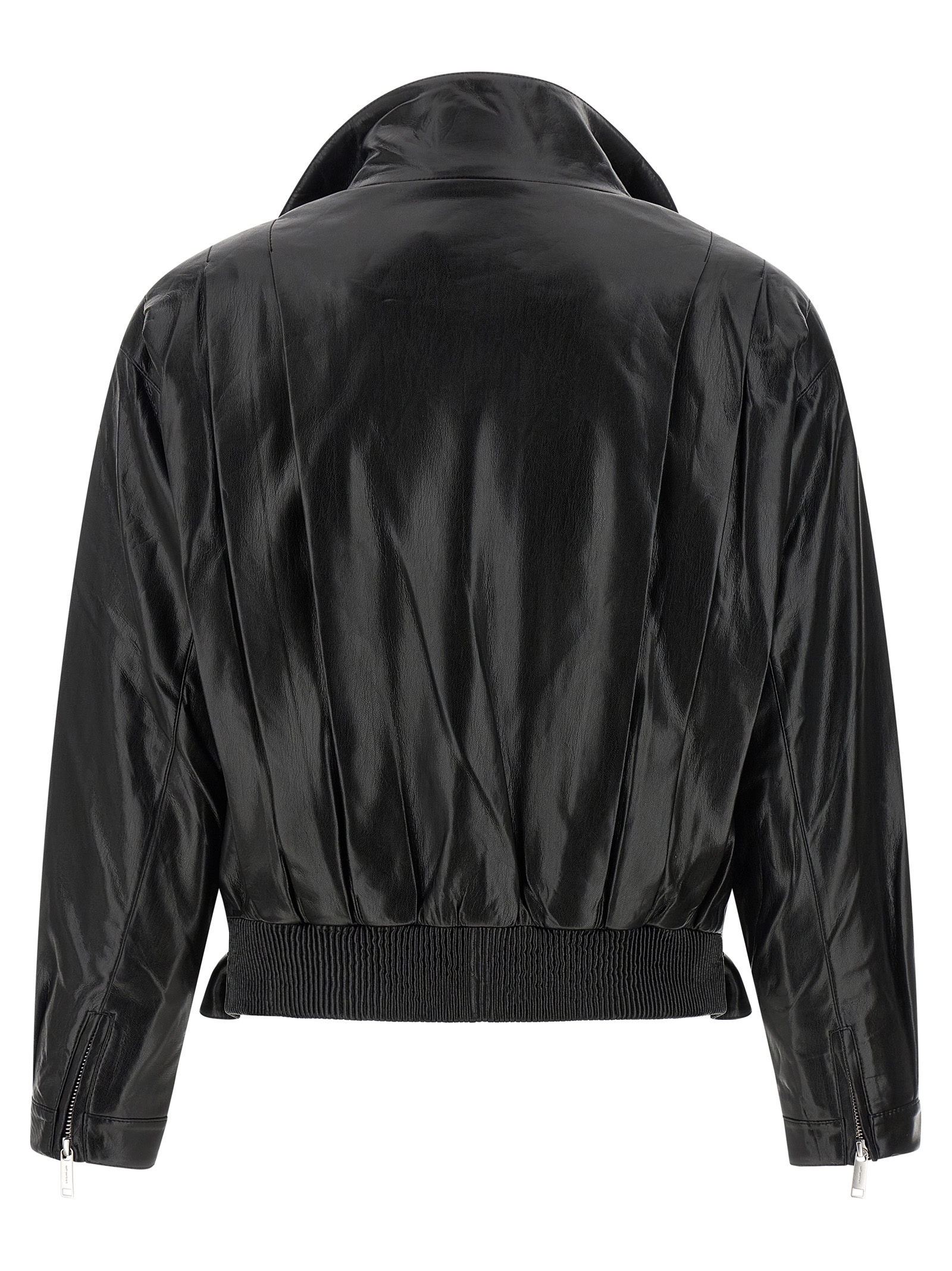 Байкерская куртка из блестящей ткани с эффектом кожи, со складками спереди и сзади, отложным воротником-стойкой, асимметричной застежкой-молнией спереди, карманами, длинными рукавами с манжетами, молниями на манжетах и приспущенными плечами, эластичной резинкой сзади и регулируемым поясом спереди по низу.