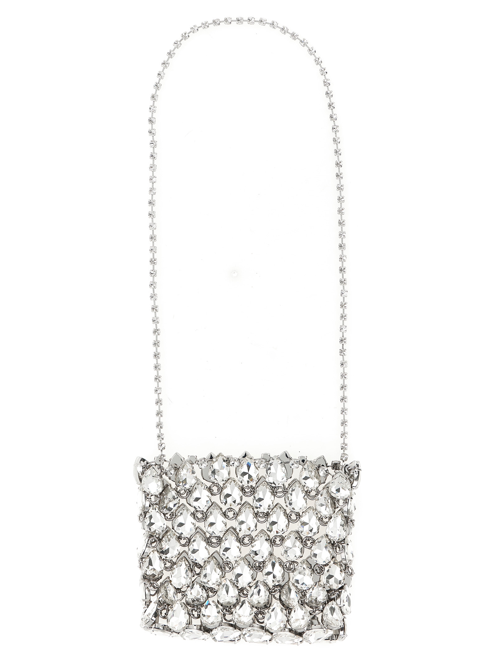 'Silver Crystal Chainmail Mini' clutch bag consisting of metal mesh outer part with maxi teardrop crystal application, and satin bag inner part with drawstring closure, removable chain shoulder strap.Характеристики товара