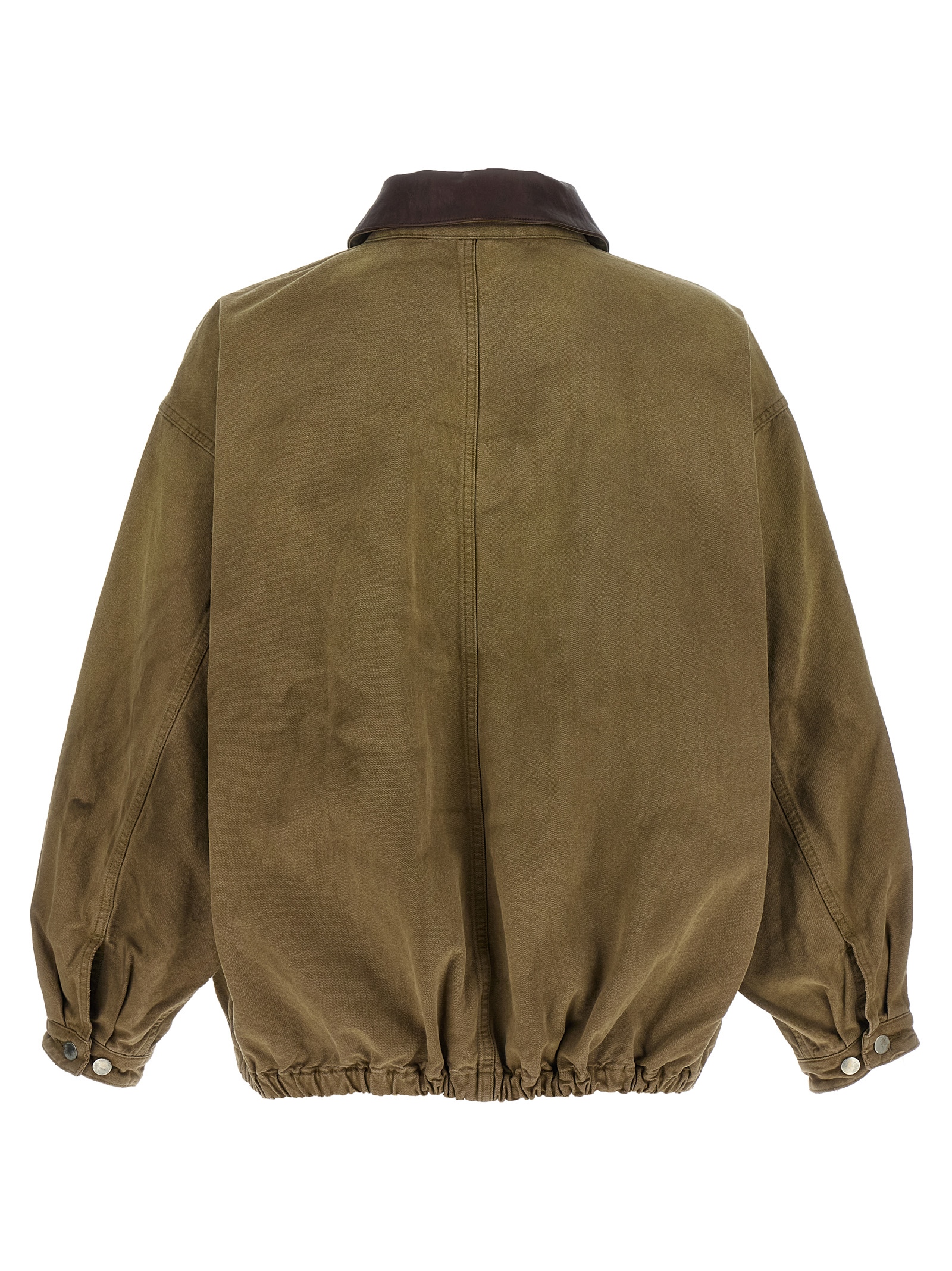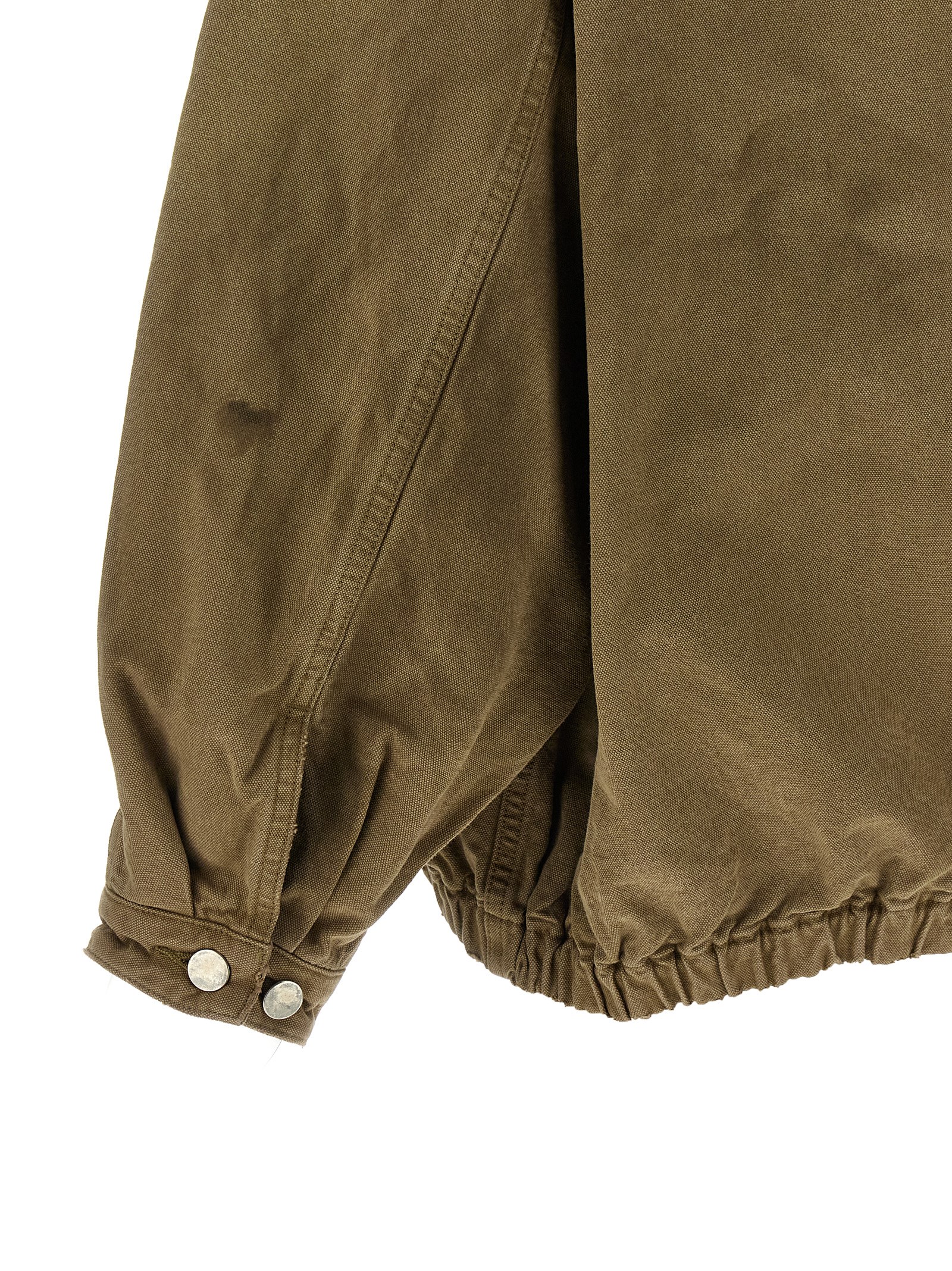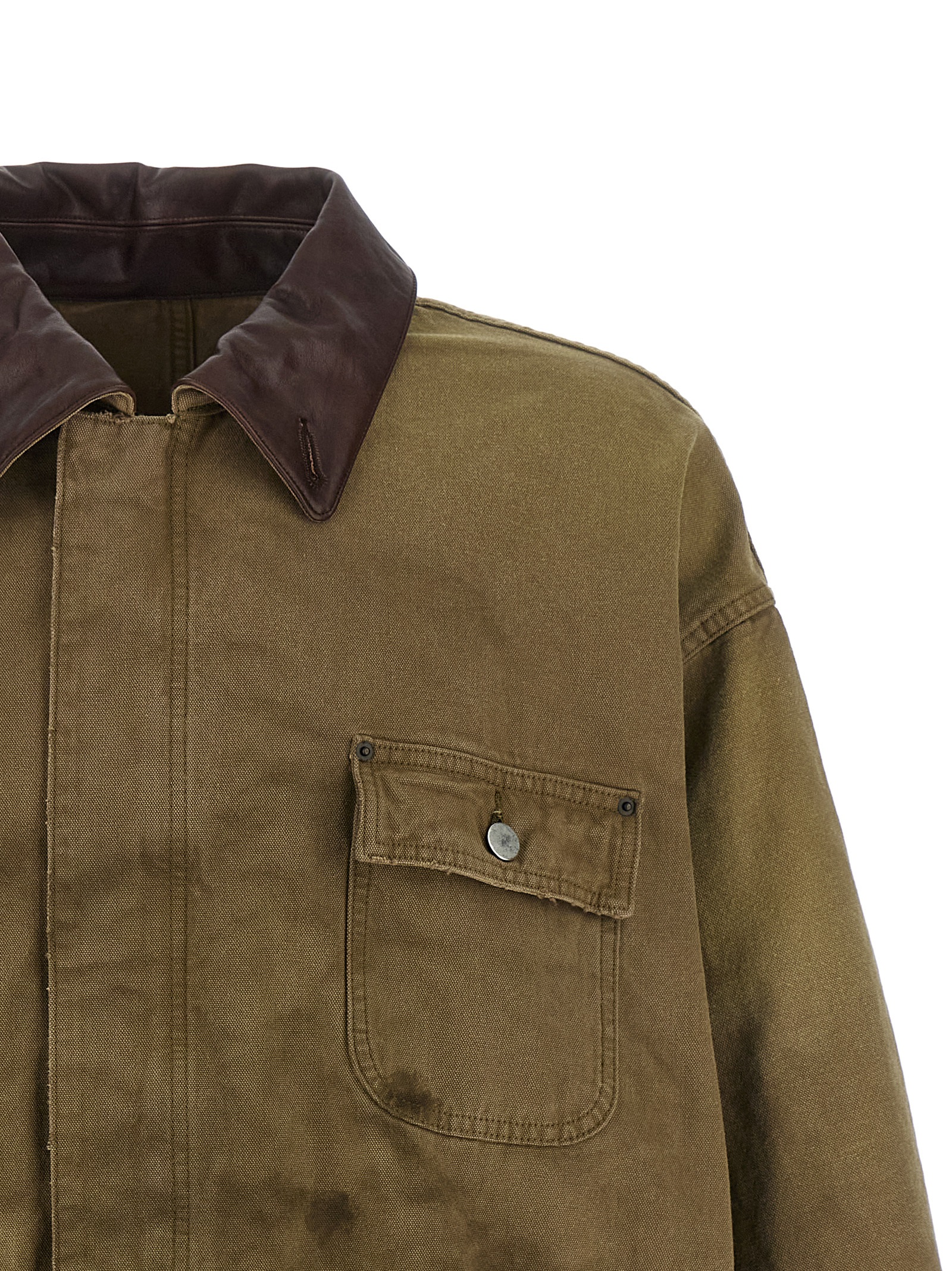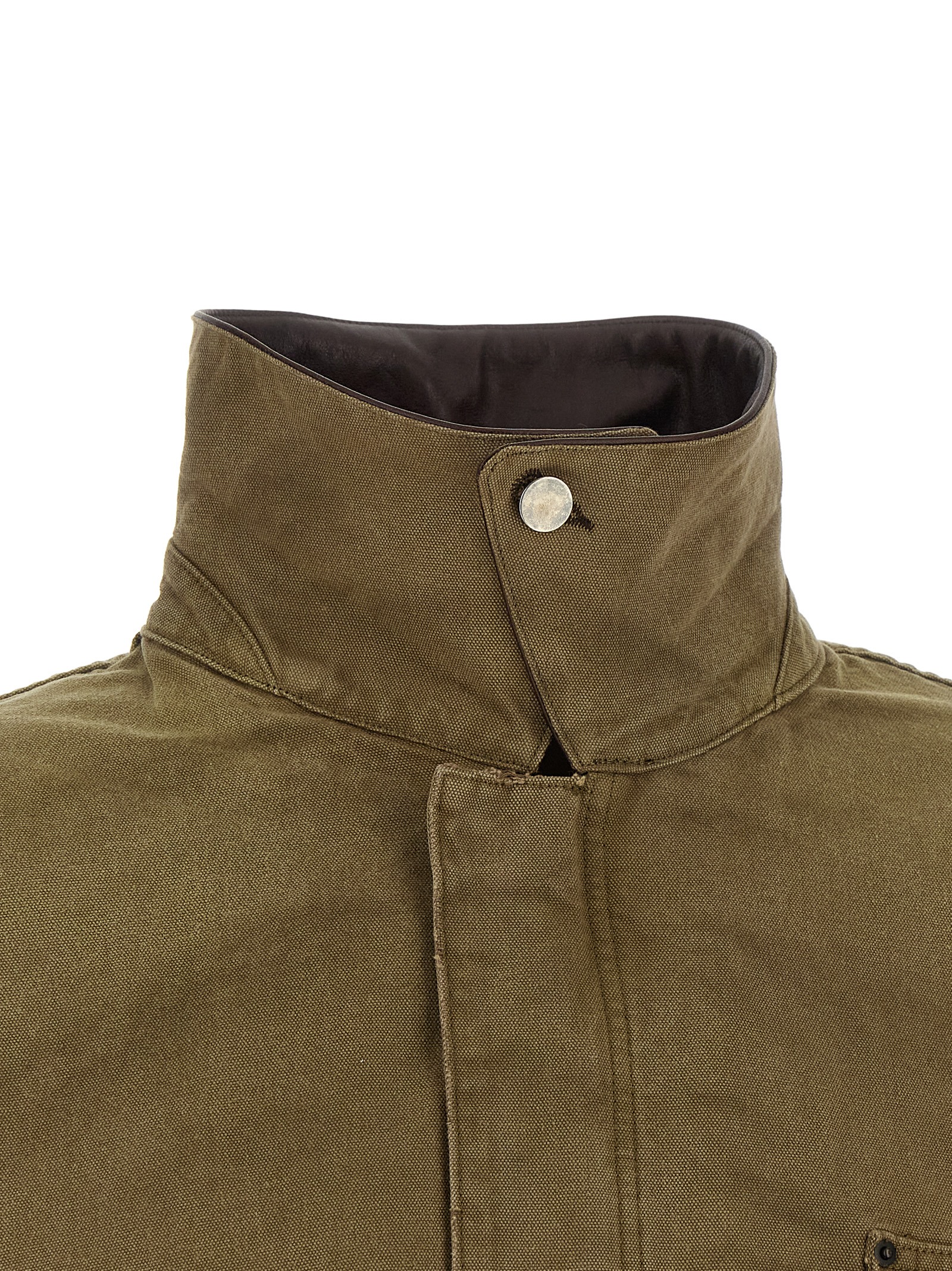 Куртка из оксфордского хлопка, окрашенная в готовом виде с использованием серной краски с эффектом «винтаж», рабочая модель, воротник из контрастной состаренной кожи, застежка на молнию и кнопки спереди, карманы, широкие длинные рукава с регулируемыми манжетами и приспущенными плечами, эластичный низ.Характеристики товара