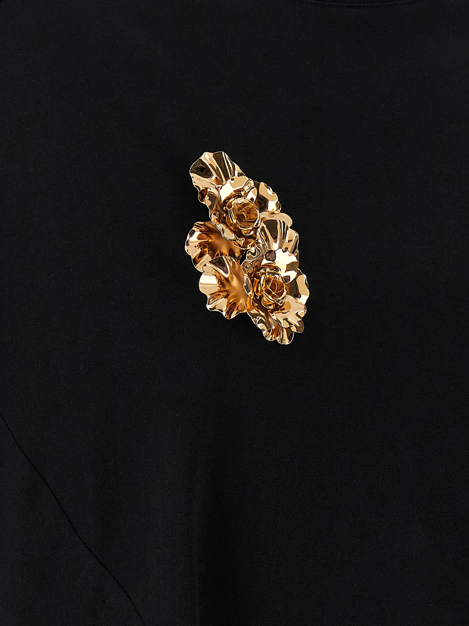 Хлопковая футболка, отделка из репсовой ленты в тон, панельная конструкция, двойная съемная металлическая брошь в виде цветка, круглый вырез, широкие асимметричные короткие рукава с манжетами, закругленный и асимметричный подол.
