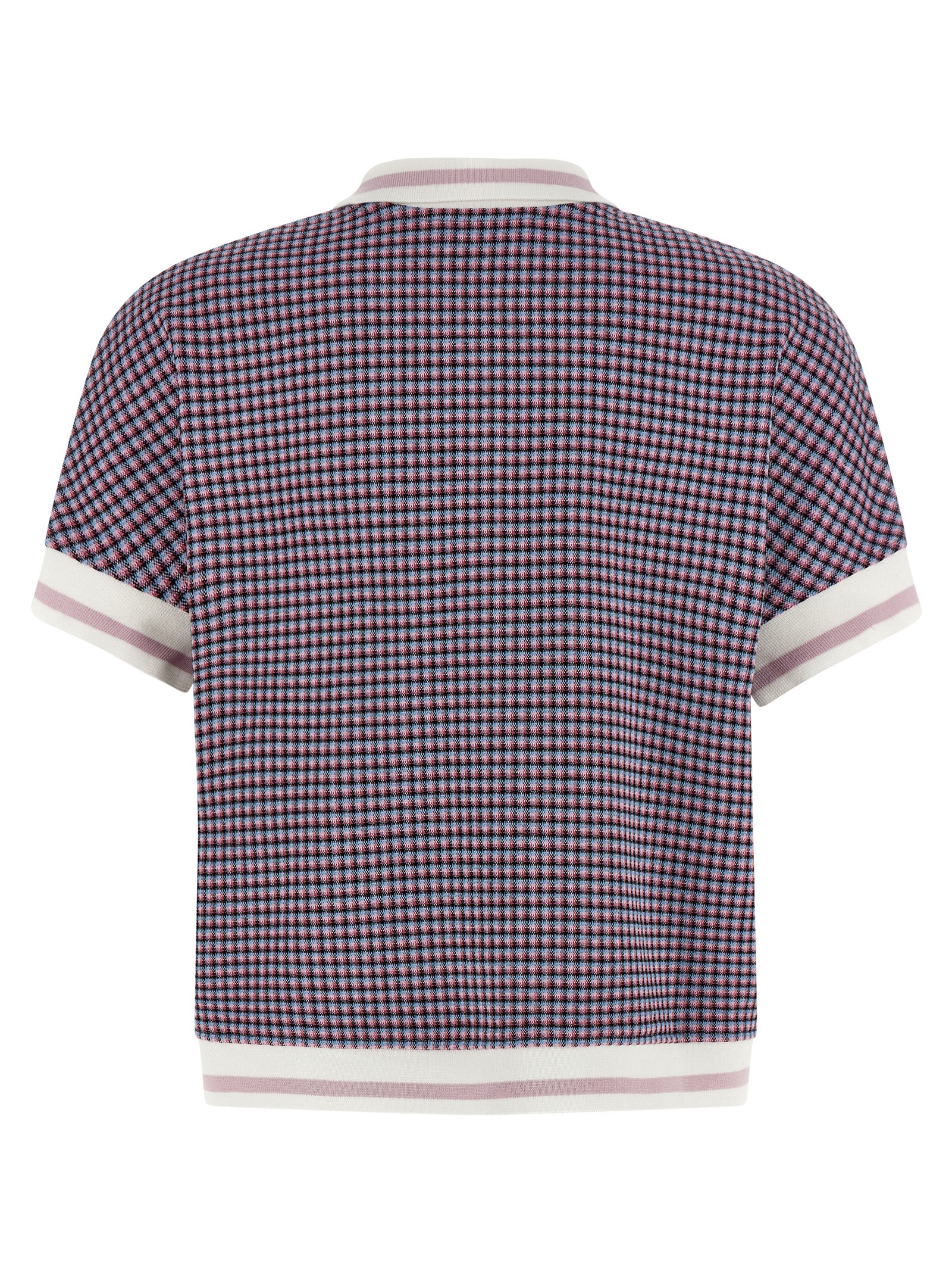 Check patterned viscose blend polo shirt with contrasting ribbed stretch knit details, slightly cropped style, collar and buttons, short sleeves with cuffs, and band on the hem.