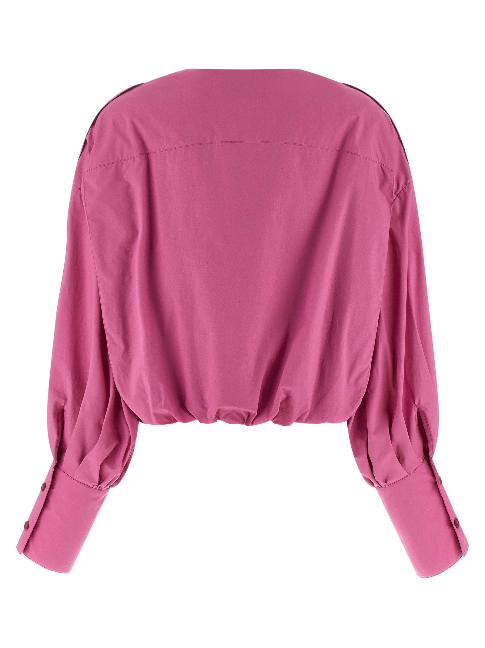'Diana' blouse in cotton poplin with crew neck, concealed front button closure, wide puff sleeves with cuffs and dropped shoulder, shoulder trim, and curling on the hem.