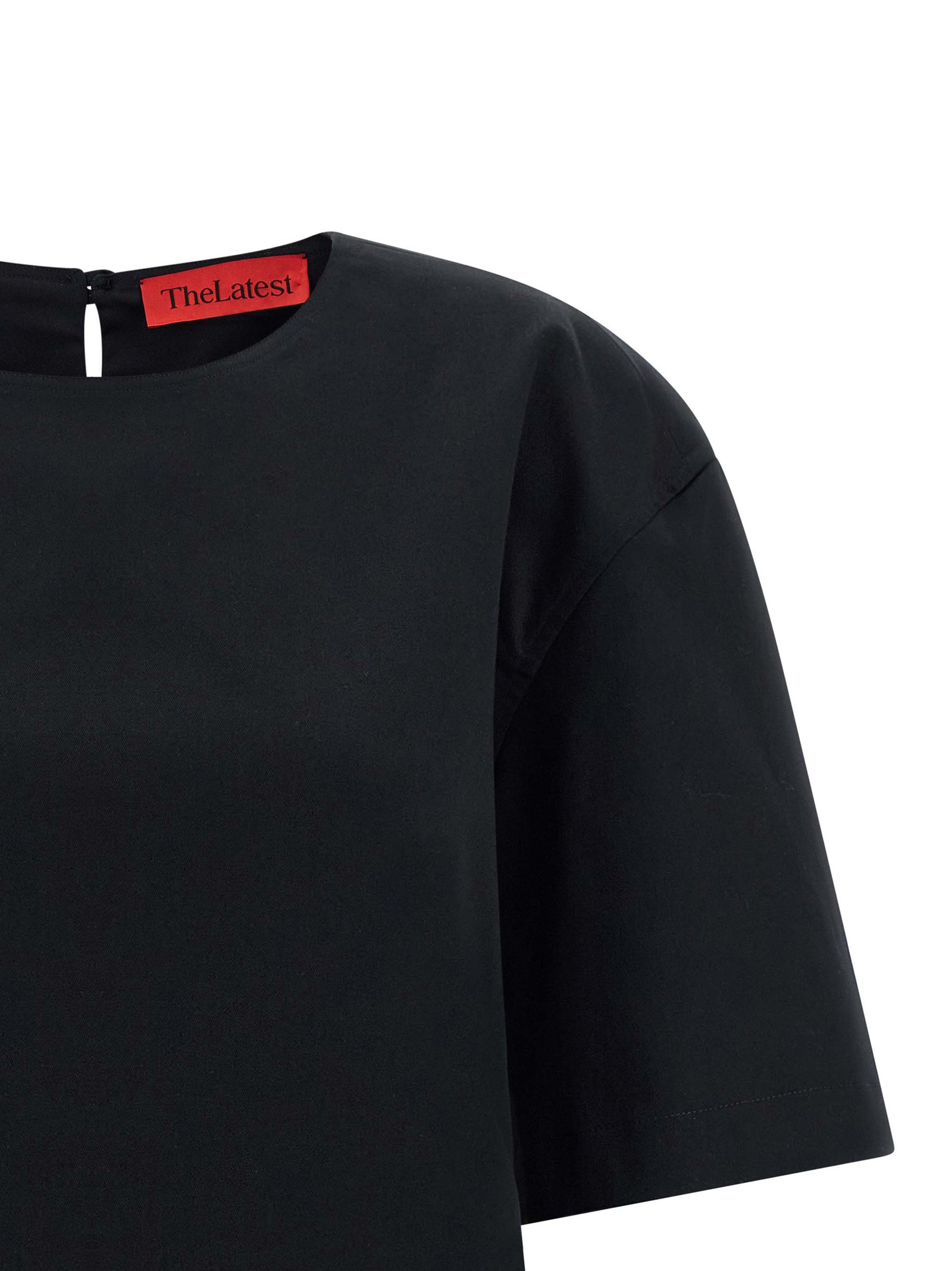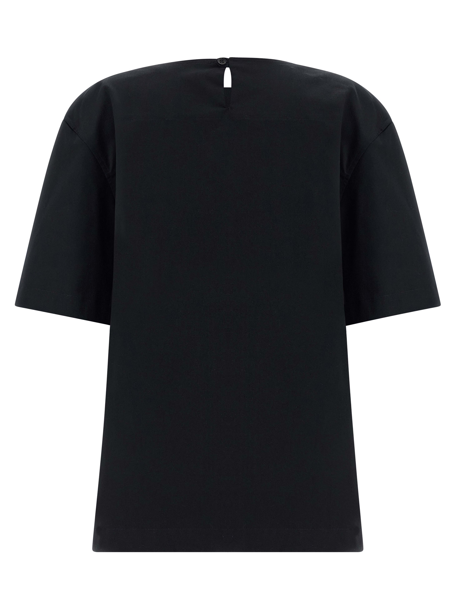 'Dean' rigid cotton gabardine crewneck t-shirt with back button closure, teardrop cut-out detail and short sleeves.