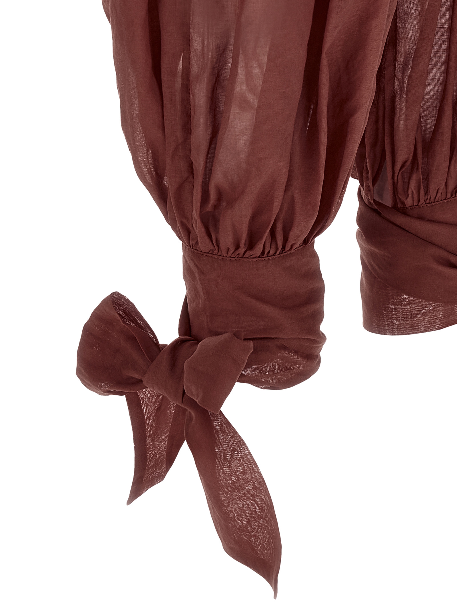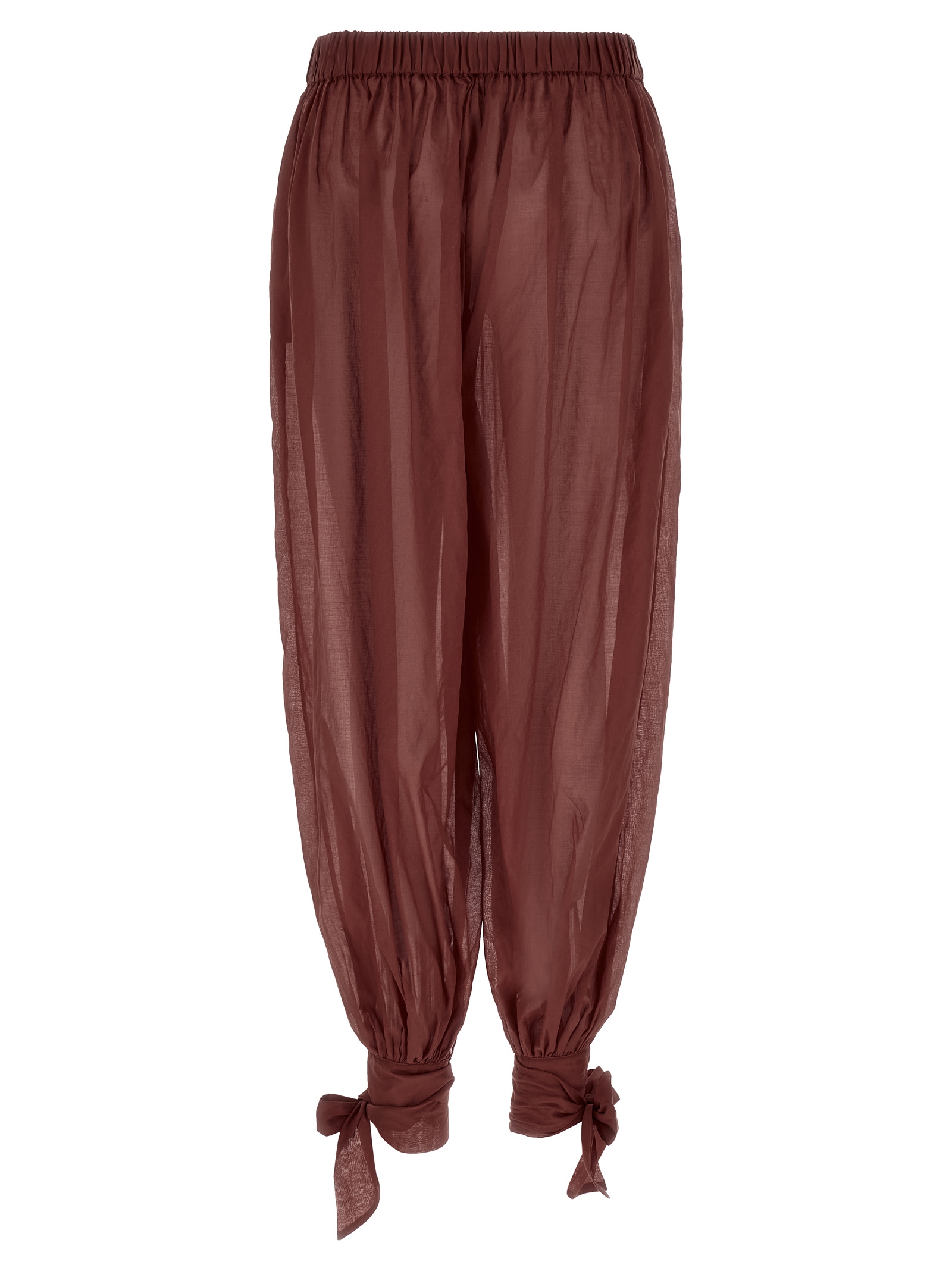 'Noor' trousers in light cotton muslin, wide leg, elastic waistband, pockets, cuffs on the leg bottom with tape to tie as desired.