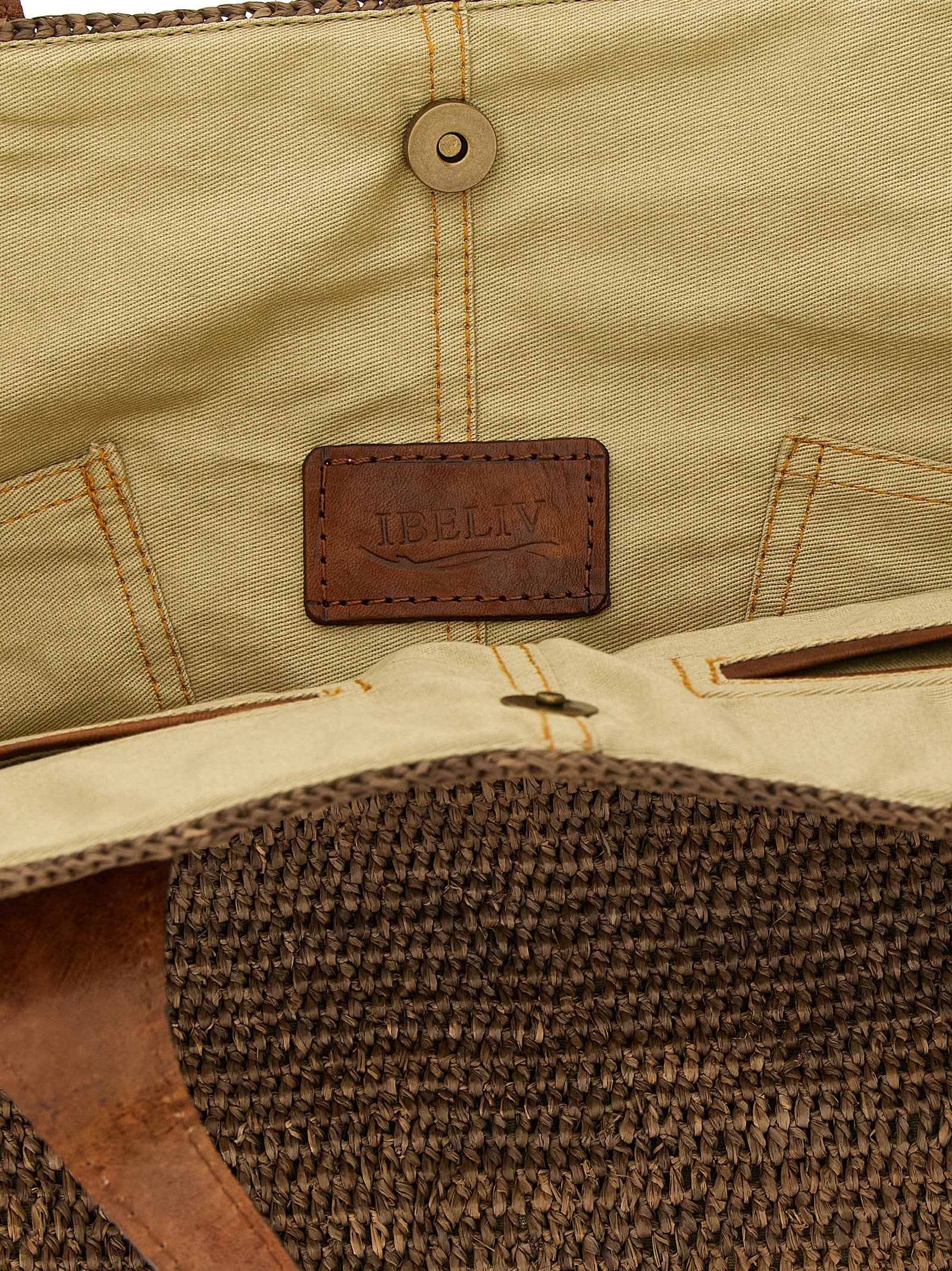 'Tokyo II' braided raffia shopping bag with basket design, internal magnetic closure, double fixed handle in vegetable-tanned zebu leather, cotton lining, four inner pockets. Handcrafted product, any imperfections are to be considered characteristics of uniqueness.