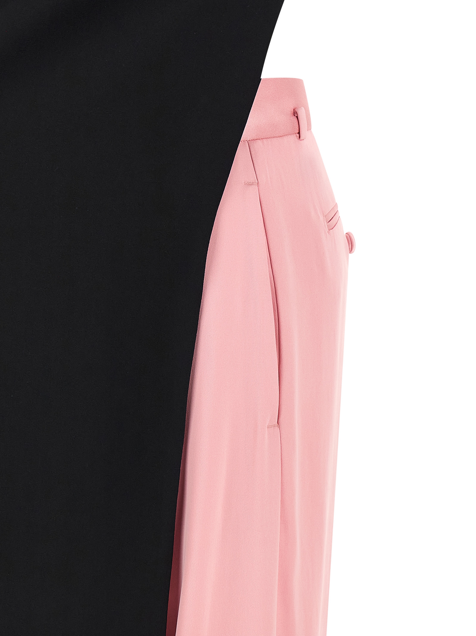 Комбинезон из эластичного двойного жоржета, состоящий из туники, накинутой на плечи, удлиненной до щиколотки и пришитой к правой штанине брюк, с круглым вырезом, застежкой-молнией сзади (полностью открытая спина) и контрастными брюками, широкими и прямыми штанинами, эластичными складками, застежкой на молнию и пуговицу спереди, передними французскими карманами и задними прорезными карманами.
