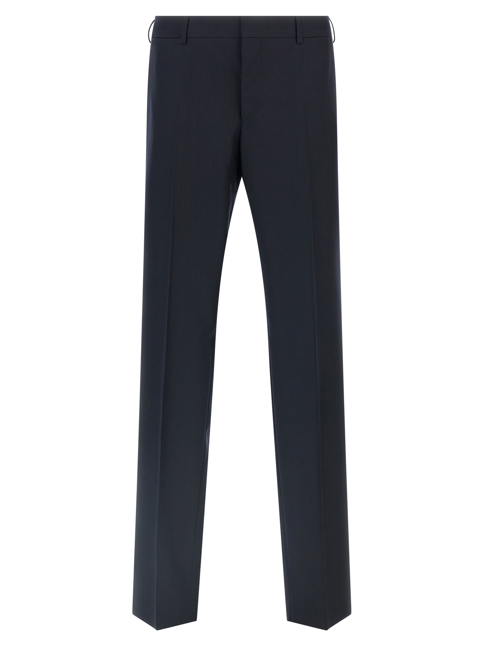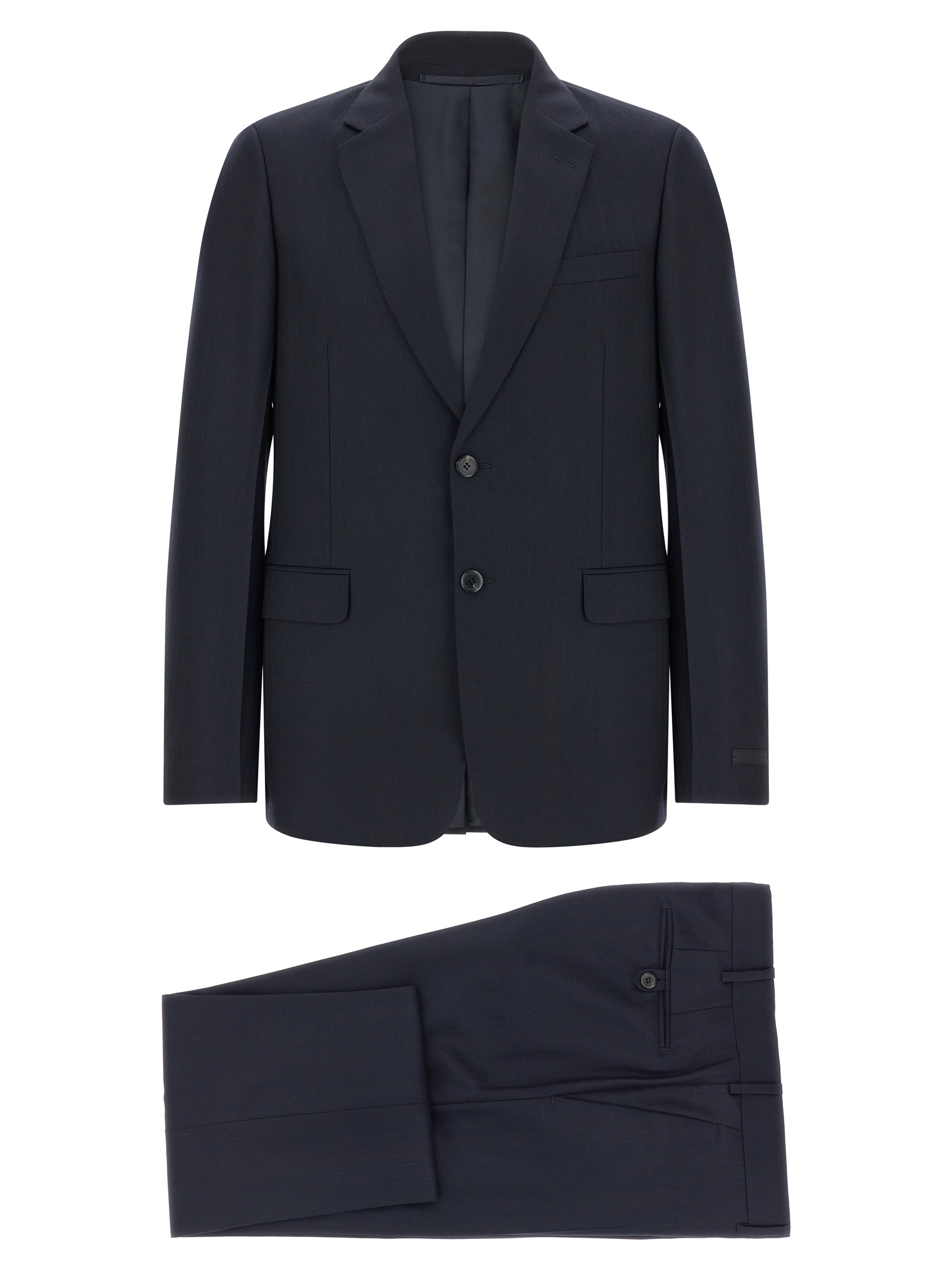 Dress in a fine blend of wool and cashmere pinstriped pattern consisting of single-breasted blazer with front button closure, mirror lapels, breast pocket, flap pockets, viscose lining, three inner pockets, padded shoulder, cuffs with opening buttonholes, back slit and trousers with stretched pleat, front 'americane' pockets, back welt pockets, button closure and front hook, viscose lining.
