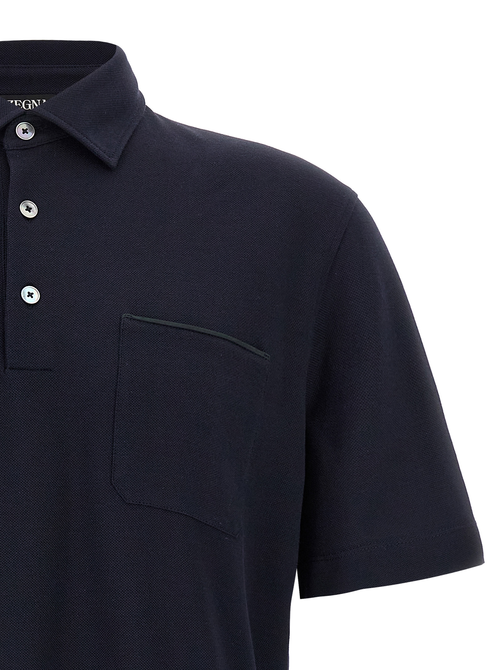 Piqué cotton polo shirt, satin piping pocket, collar and buttons, short sleeves, side slits.