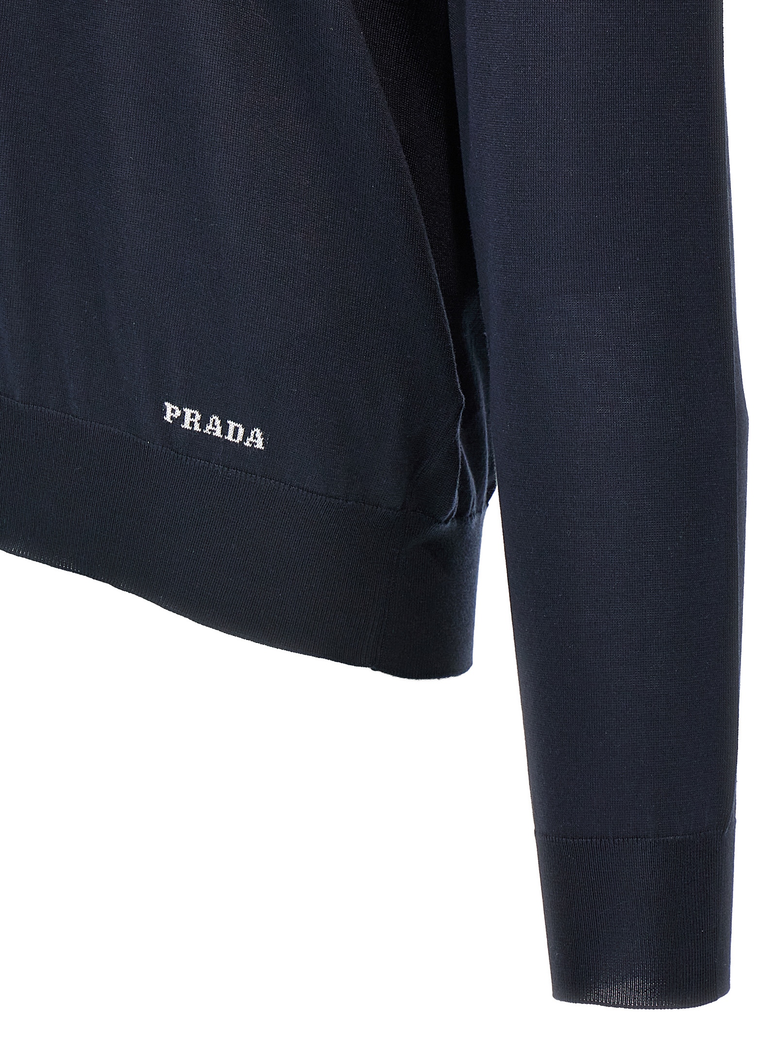 Silk sweater, contrast front logo embroidery, crew neck, long cuffed sleeves.