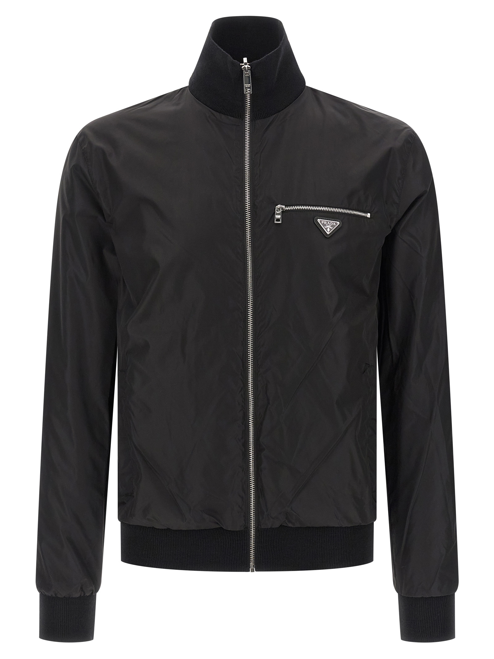 Reversible wool knit cardigan, high neck, nylon lining, front pockets, enamelled triangle metal logo, long sleeves with cuffs.